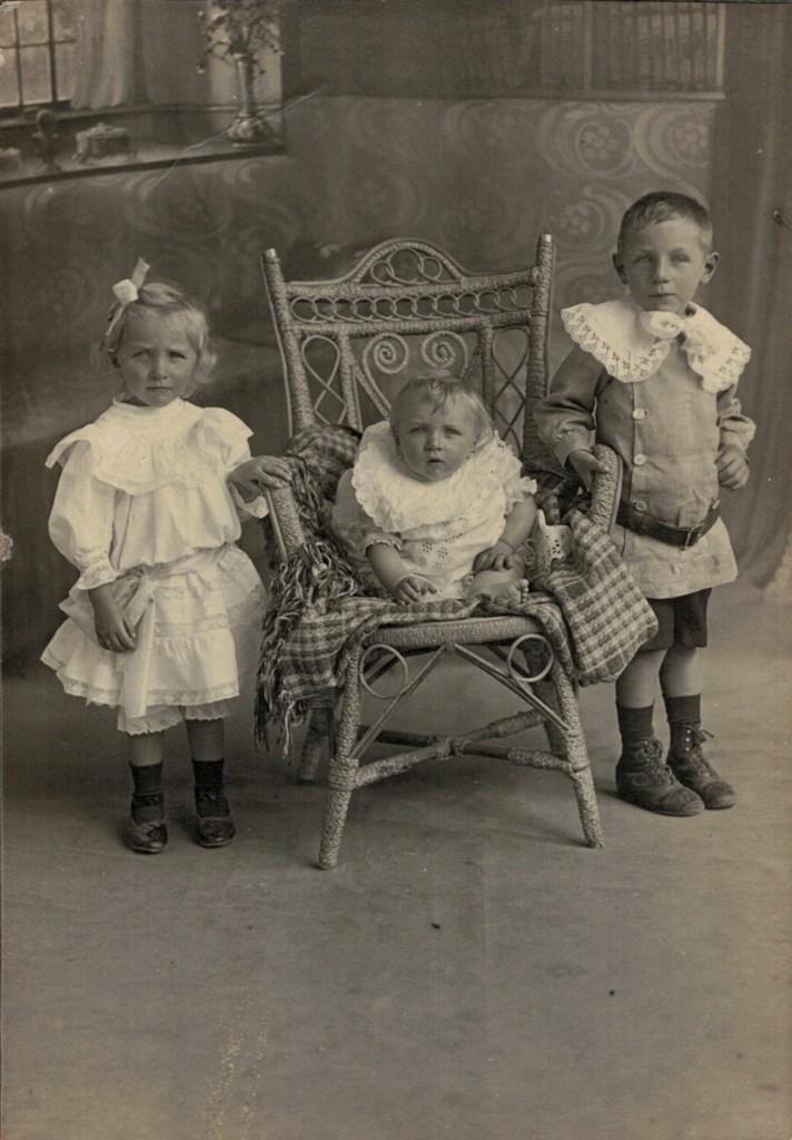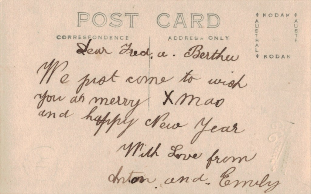 Reverse of photograph above: sent to Fred and Bertha Schache (Adler),Murtoa, Vic.Elma, Alf and Arthur Schubert G. L. Heuzenroeder, Tanunda Studio, SA) [Lothar Schubert].The sons of August and Louise Schubert (Fiedler), photographed after their fatherโs funeral in Tanunda SA, 1916: standing L-R: Walde, Ossie Lothar, Jack; seated L-R: Walther, Anton, August.