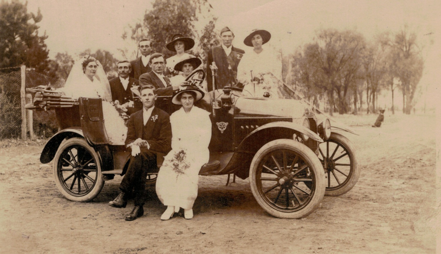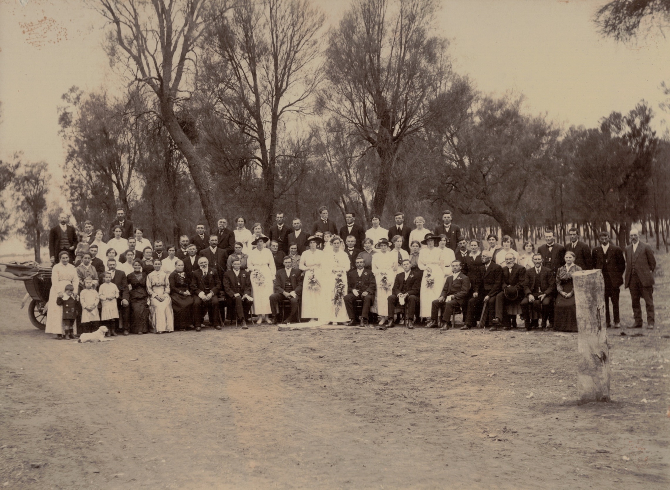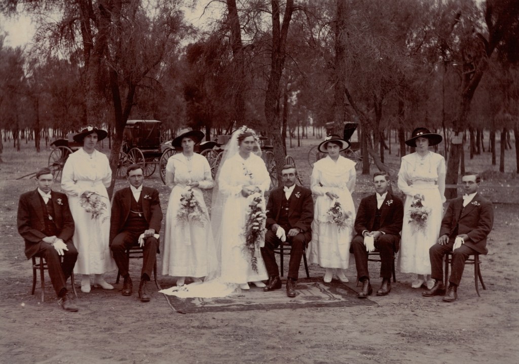 Winnie Adler (later Schubert), (Drury’s Elite Studio, Horsham) [Tess Hausler (Schache)].Winnie Adler (later Schubert) [Tess Hausler (Schubert)].Winnie Adler (later Schubert), 1913 (Mora, Rundle Street, Adelaide, SA) [LiesWinnie Adler (later Schubert), (Mora, Rundle Street, Adelaide, SA), taken at the time of Louise Schubert’s funeral in 1913. Winnie made this dress herself, of yellow material, at Miss Fairfax’s place in Murtoa [Lieschen Schubert].Winnie Adler (later Schubert), 1913 (Mora, Rundle Street, Adelaide, SA) [Lieschen Schubert] โ reverse of photograph above.Winnie Adler and Walther Schubert, probably an engagement photo c. 1916, taken at Sheoak Bank, Coromby via Murtoa, Vic. [Winnie Schubert (Adler)].The sons of August and Louise Schubert (Fiedler), photographed after their fatherโs funeral, 1916/ standing L-R, Walde, Ossie Lothar, Jack; seated L-R, Walther, Anton, August (G. Graue photograph, Tanunda SA).Walther and Winnie Schubert (Adler), bridal party in the wedding car, Sheoak Bank, Coromby via Murtoa, Vic., 1917 (F. Schรคche, photographer, Jung North): standing L-R at rear, Frank Schache, Mary Adler (later Konig), Ossie Schubert, Olga Schache (later Wilhelm); front seat, Walde Schubert and Vallie Adler; front running board, Carl Adler and Lieschen Schubert. This was the first wedding to She-oak Bank where the bridal couple travelled in a motor car.Walther and Winnie Schubert (Adler), bridal party, Sheoak Bank, Coromby via Murtoa, Vic., 1917: L-R, Ossie Schubert, Olga Schache (later Wilhelm), Walde Schubert, Vallie Adler, Winnie and Walther, Lieschen Schubert, Carl Adler, Mary Adler (later Konig) and Frank Schache (F. Schรคche, Photographer, Jung North).Walther and Winnie Schubert (Adler), bridal party, Sheoak Bank, Coromby via Murtoa, Vic., 1917: similar photograph to above. Walther and Winnie Schubert(Adler), wedding reception guests, Sheoak Bank, Coromby via Murtoa, Vic., 1917.Marquee at Sheoak Bank, Coromby via Murtoa, Vic., for wedding of Walter and Winnie Schubert (Adler). Hired from Colliver, Horsham, Vic. (F. Schรคche, Photographer, Jung North) [Tess Hausler (Schache)].