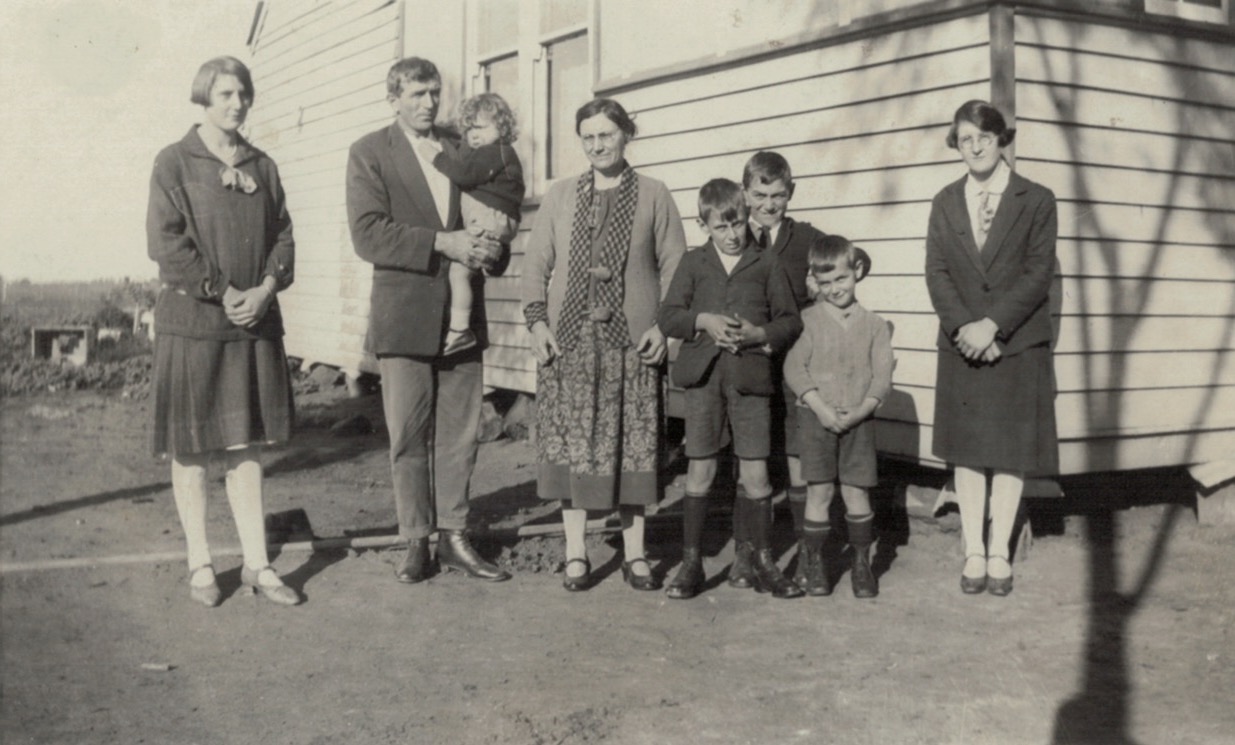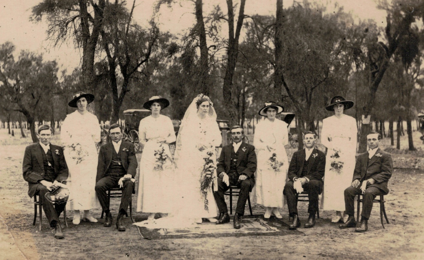 Walther and Winnie Schubert (Adler), wedding, 1917 (D. Livingstone Muntz, Malvern, Vic.) [Tess Hausler (Schache)]: similar photograph to above.Reverse of above.Committee of Rosevale State School, Galaquil East via Beulah, Vic.. mid-1920s: standing L-R, August Schubert, Vince Warren, Len Ryan, Walther Schubert; seated L-R, Jim Wilde, Arch Grant, Arthur Jeffree, Ewan Grant.Home of Walter and Winnie Schubert (Adler), Sheep Hills, Vic., c.1930s [Tess Hausler (Schache)].Home of Walter and Winnie Schubert (Adler), Sheep Hills, Vic., c.1930s. Winnie and children standing by the house [Tess Hausler (Schache)].Walther and Winnie Schubert (Adler) and family, Sheep Hills, Vic., c.1930s. with neighbours (May sisters): standing L-R, Walther holding Ron, Winnie, Rupert, Len and Alf [Tess Hausler (Schache)].