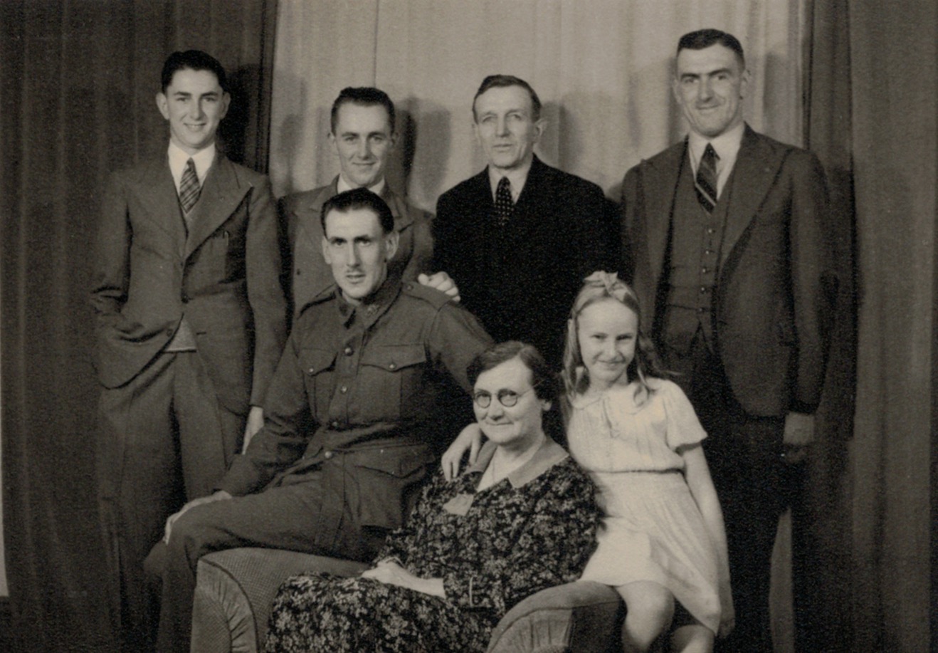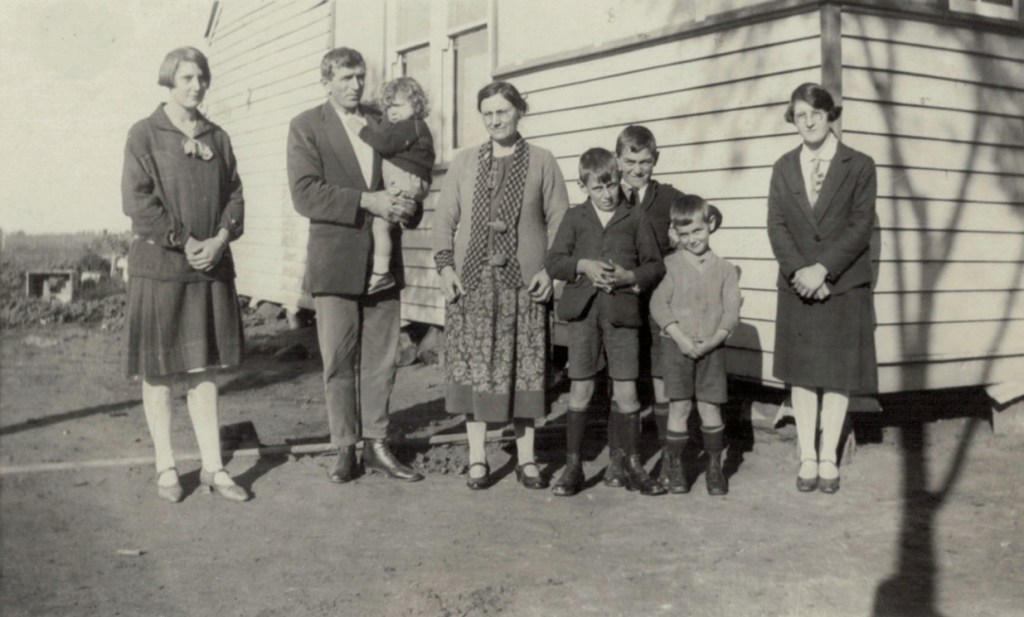 Walther and Winnie Schubert (Adler) and family at home of Fred and Bertha Schache (Adler), Arnold Street, Warracknabeal, Vic., c. 1940: standing L-R, Ron, Alf, Rup, Len, and Marie (later Miller) [Tess Hausler (Schache)].
