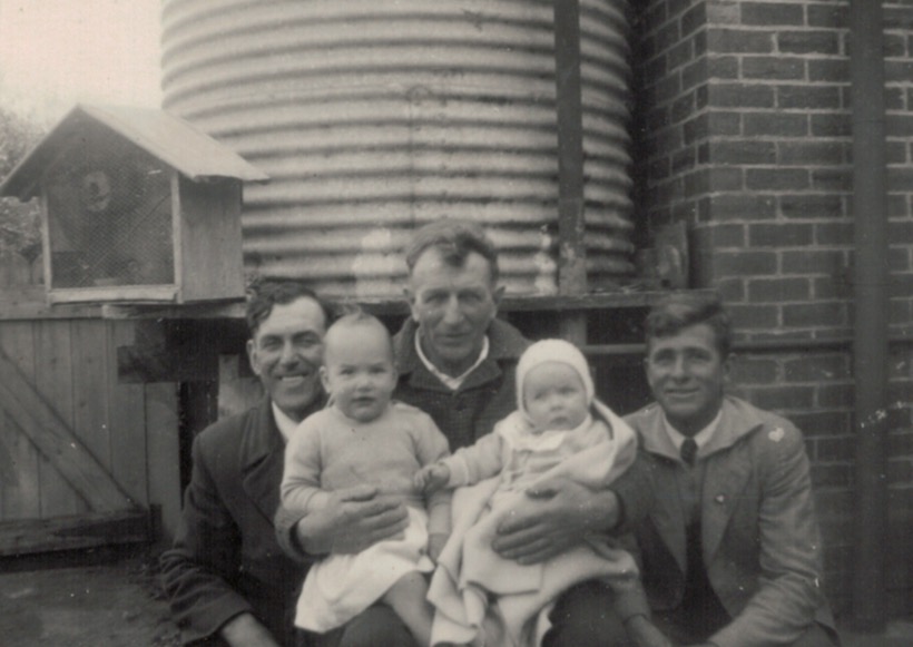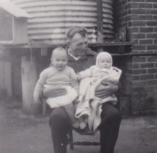 Walter Schubert with granddaughters Leonor Schubert (later Stiggants) 18 months, and Dorothy Miller (later Gardam), seven months, Newry, Vic., 1954.