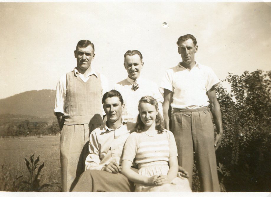 Schubert siblings at the home of Fred and Bertha Schache (Adler), Arnold Street, Warracknabeal, Vic., c. 1940: standing L-R, Marie (later Miller), Ron, Alf, Rup, Len [Tess Hausler (Schache)].