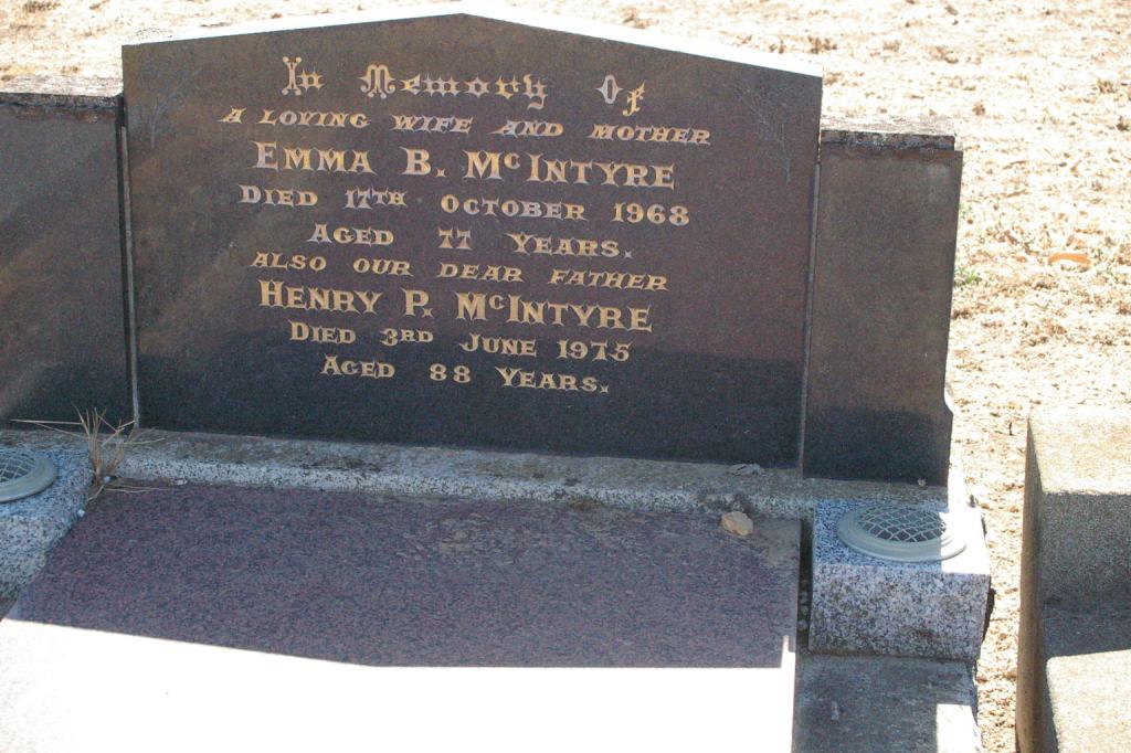 1.9.1 ADLER Emma Bertha (McINTYRE) 1.9.1.1 McINTYRE Rupert Arthur1.9.1.2 McINTYRE Leslie Richard (Henshall)1.9.1.3 McINTYRE Doris May1.9.1.4 McINTYRE Lorna Marie (SCHULZ)1.9.1.5 McINTYRE Gordon Douglas (SCHULTZ)1.9.1.6 McINTYRE Norman Lindsay (Bennett)1.9.1.7 McINTYRE Arnold Victor Published References (1.9.1 ADLER) Emmie Adler (later McIntyre). Harry McIntyre (Eden Studios, Swanston Street, Melbourne). Headstone for Henry and Emma McIntyre (Adler), Murtoa Cemetery, Vic. [Carol’s Headstone Photographs].
