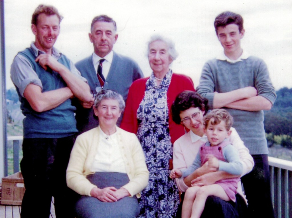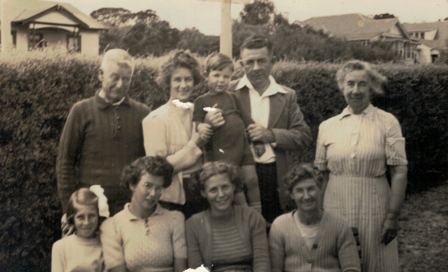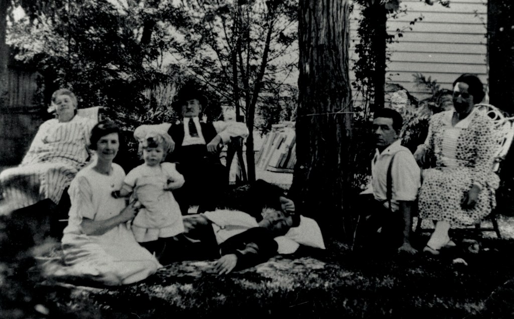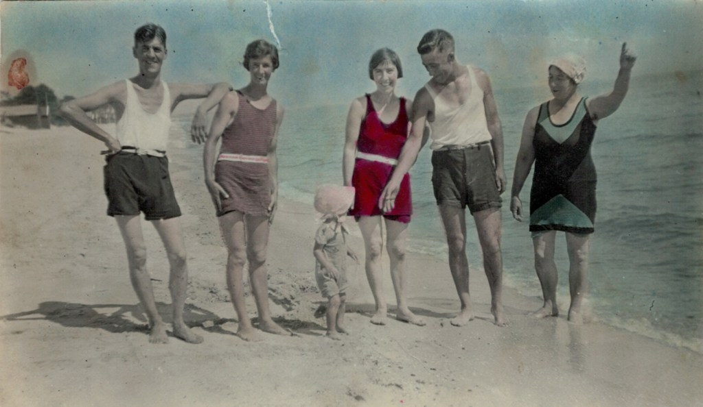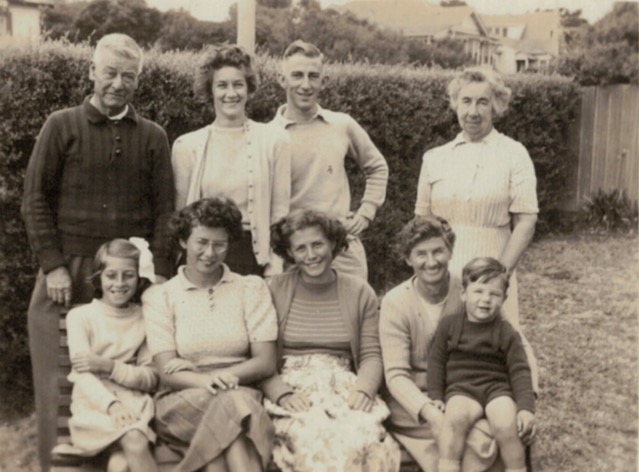 Mornington holiday, February 1947; standing L-R, Tom Corrie, Joan Corrie (later Snibson), Allan Snibson, Susan Corrie (Girvan); seated L-R, Norma Corrie (later Stephenson), Gwen Corrie (later Harwood), (Gwen’s friend), Rose Corrie (Marney) nursing Ralph Corrie.