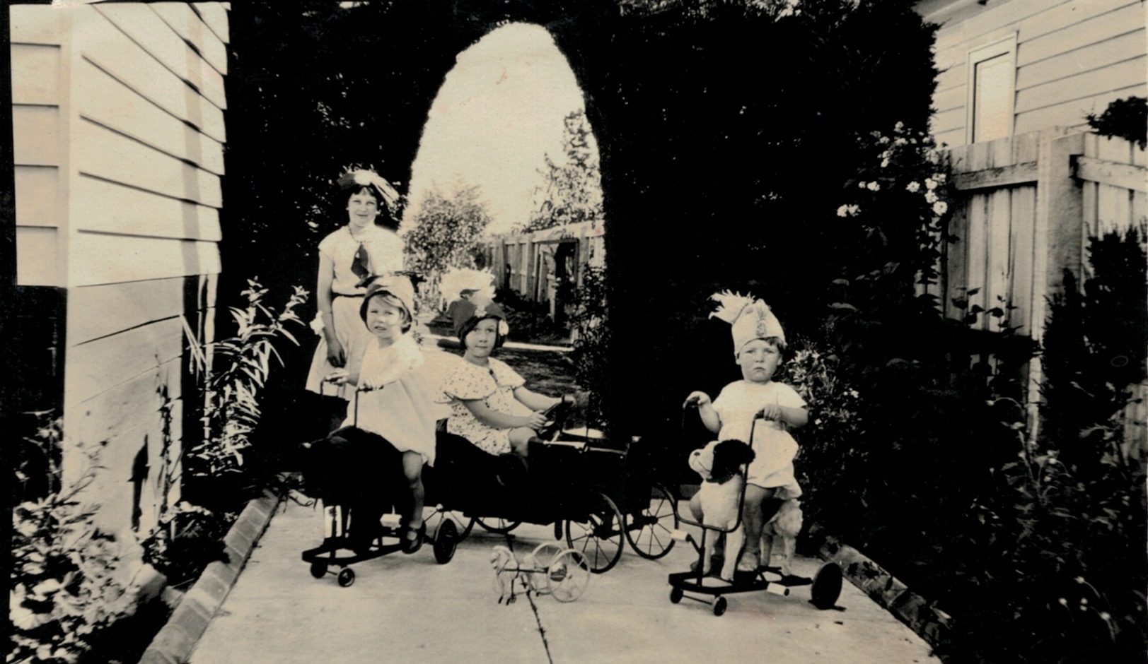 As above: L-R, Gwen Corrie (later Harwood), Doug Fearn-Wannon and Joan Corrie (later Snibson).Christmas morning 1931, at the home of Ray and Rose Corrie (Marney), Arlington Street, Ringwood, Vic.: L-R, Tom Corrie, Gwen Corrie (later Harwood), Doug Fearn-Wannon, unknown, Joan Corrie (later Snibson).As above: L-R, unknown (at rear), Gwen Corrie (later Harwood), Joan Corrie (later Snibson) and Doug Fearn-Wannon.Christmas, c. 1937: L-R, Joan Corrie (later Snibson), Gwen Corrie (later Harwood) and Doug Fearn-Wannon.