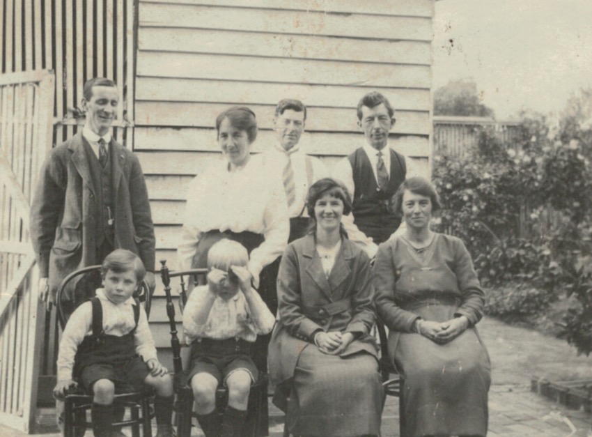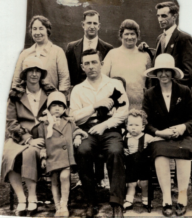 Corrie and Girvan family group: standing L-R, Susan Corrie (Girvan), Ray Corrie, Doris Fearn-Wannon (Corrie), Arthur Fearn-Wannon, Jim Girvan; seated L-R, Tom Corrie, Stella Girvan (Hancey), Bill Corrie; Jim Girvan (jun.)? sitting at front.