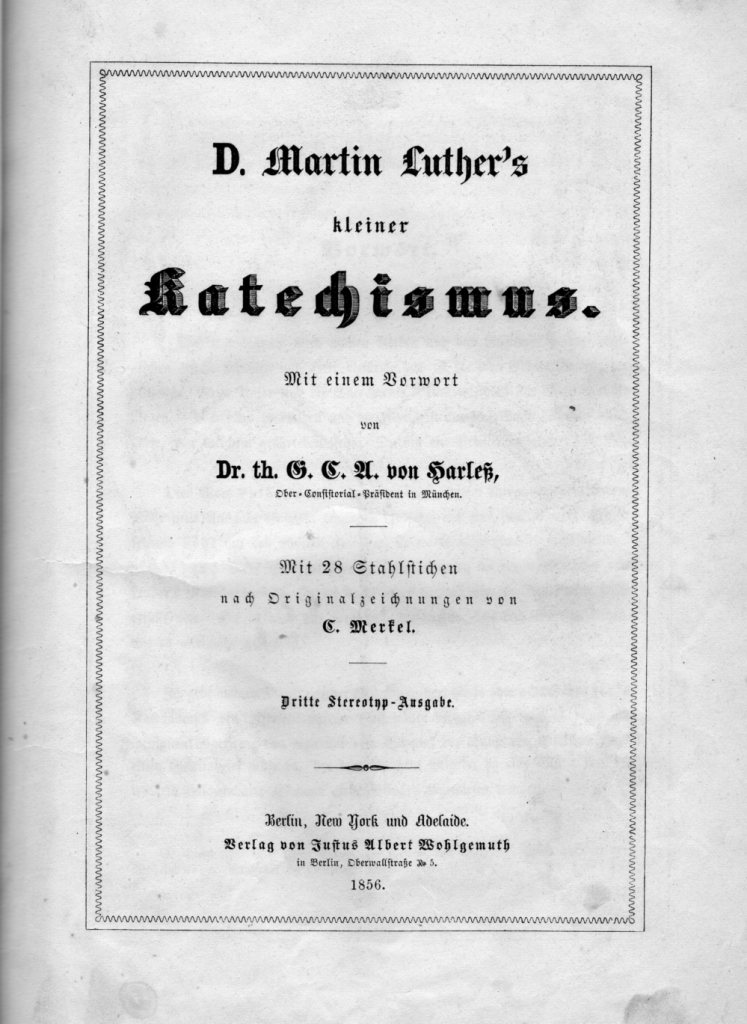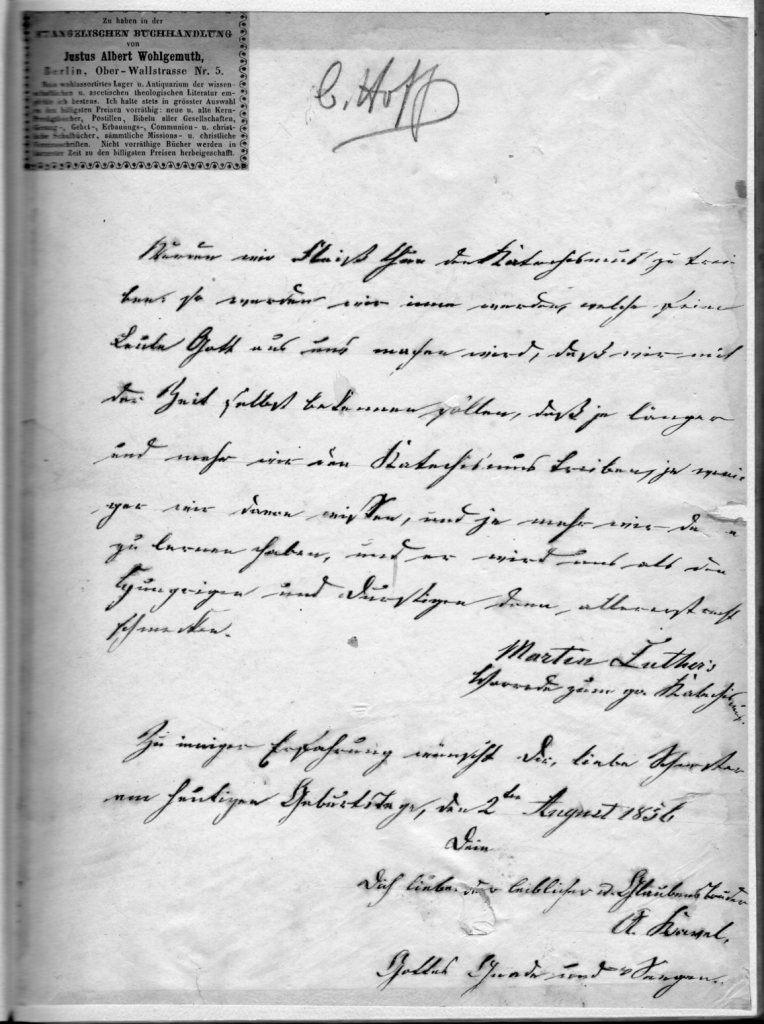 Church at Biaลowice, Poland, formerly Billendorf, Prussia, 2024, where August Fiedler was baptised in 1796 [JAS].Manse at Biaลowice, Poland, formerly Billendorf, Prussia, next to the church [museum-digital:berlin].Klemzig Schloร, Prussia, where August Fiedler was employed as a forester by Princess Reuss [Public Domain].As above [Internet].A unique glimpse the Fiedler-Aldenhoven properties in a pencil sketch by the colonial artist Johann Joseph Eugene von Guรฉrard (1811-1901). Shown between the trees in the foreground are the Bethany settlement with church spire, far left; the property of August Fiedler junior, left of the central tree; the Aldenhoven property, right of the same tree near the fences; and the property of August Fiedler senior, far right: Kaiserstuhl bei Tanunda in the collection Volume 03: Sketchbook XXIV, No. 6 Australian. Australia. 3 Jul. ??? Aug., Dec. 1855 / by Eugene von Guerard. (Dixon Galleries, State Library of New South Wales)Luther’s Small Catechism, presented by Pastor August Kavel to his sister Charlotte Fiedler on her 50th birthday, 2 August, 1856 [Lutheran Archives].Frontispiece from the Cathechism above.Pastor Kavel’s inscription in the Catechism above, signed “your brother in the flesh and by faith, A Kavel”.Fiedler house photographed in a dilapidated state c. 1985, before being largely rebuilt.
