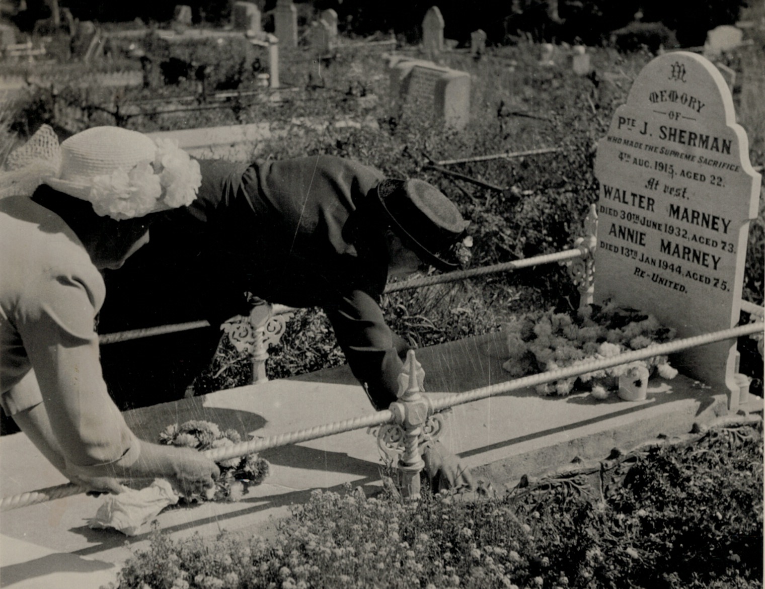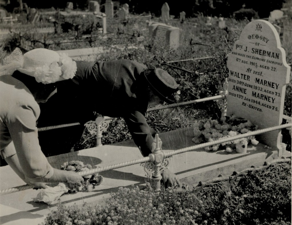 Grave of Walter and Annie Marney (Sherman nee Cowderoy) and Annie’s son, John Sherman, Coburg Cemetery, 11 March, 1951. From the left, Rose Corrie (Marney) and Alice Bowman (Cowderoy/Sherman).