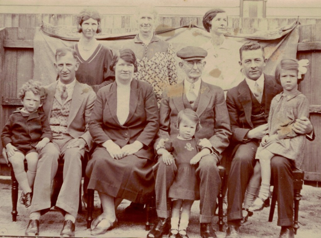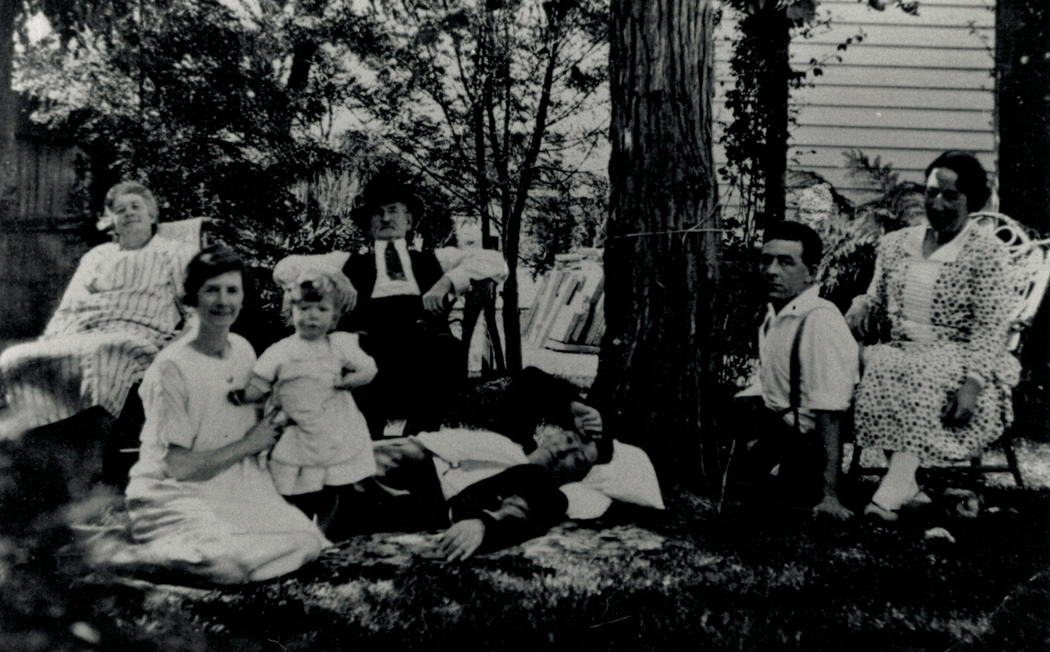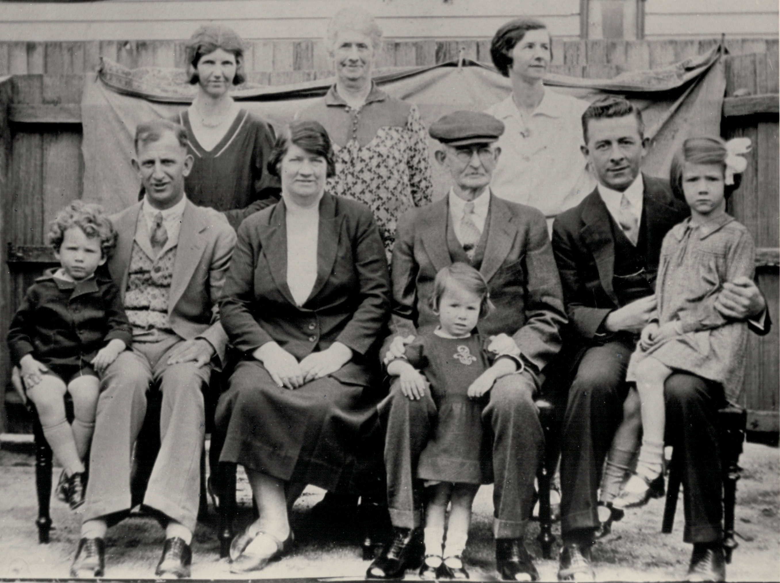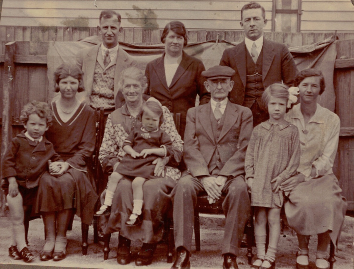 Family group, Northcote, c. 1931: standing rear L-R, Violet Marney (Moss), Annie Marney (Sherman nee Cowderoy), Rose Corrie (Marney); seated L-R, Austin Marney, Walter Marney (jun.), Alice Bowman (Cowderoy/Sherman), Walter Marney (with Gwen Corrie, later Harwood, in front), Ray Corrie (nursing Joan Corrie, later Snibson).
