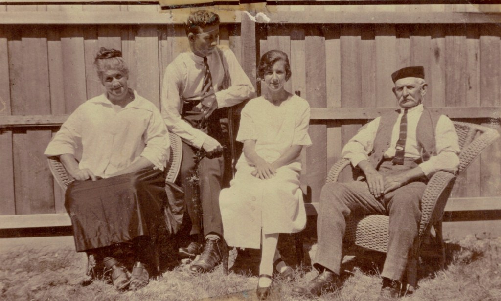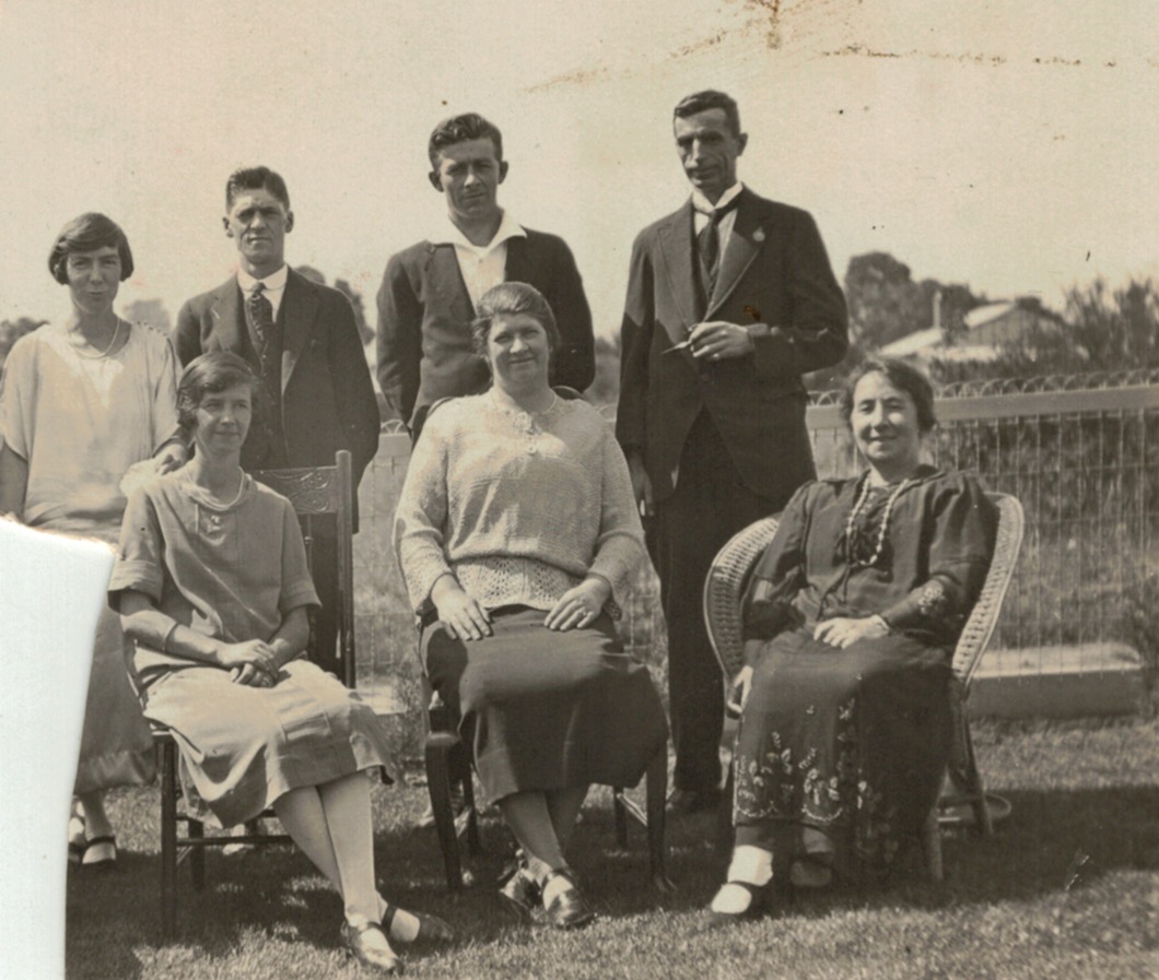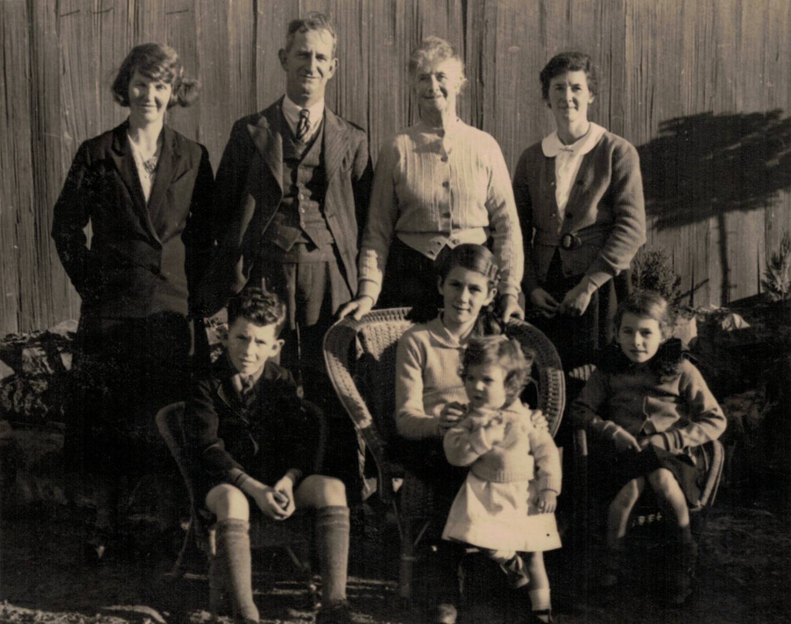 As above before restoration.Cousins Joan Corrie (later Snibson), Austin Marney and Gwen Corrie (later Harwood), Northcote, c. 1931.Marney family c. 1939: standing L-R: Violet Marney (Moss), Walter Marney, Annie Marney (Sherman nee Cowderoy), Rose Corrie (Marney); at front, Austin Marney, Joan Corrie (later Snibson), Norma Corrie (later Stephenson) and Gwen Corrie (later Harwood).