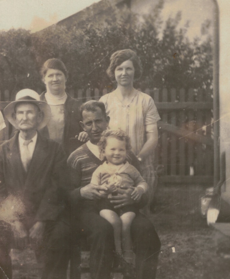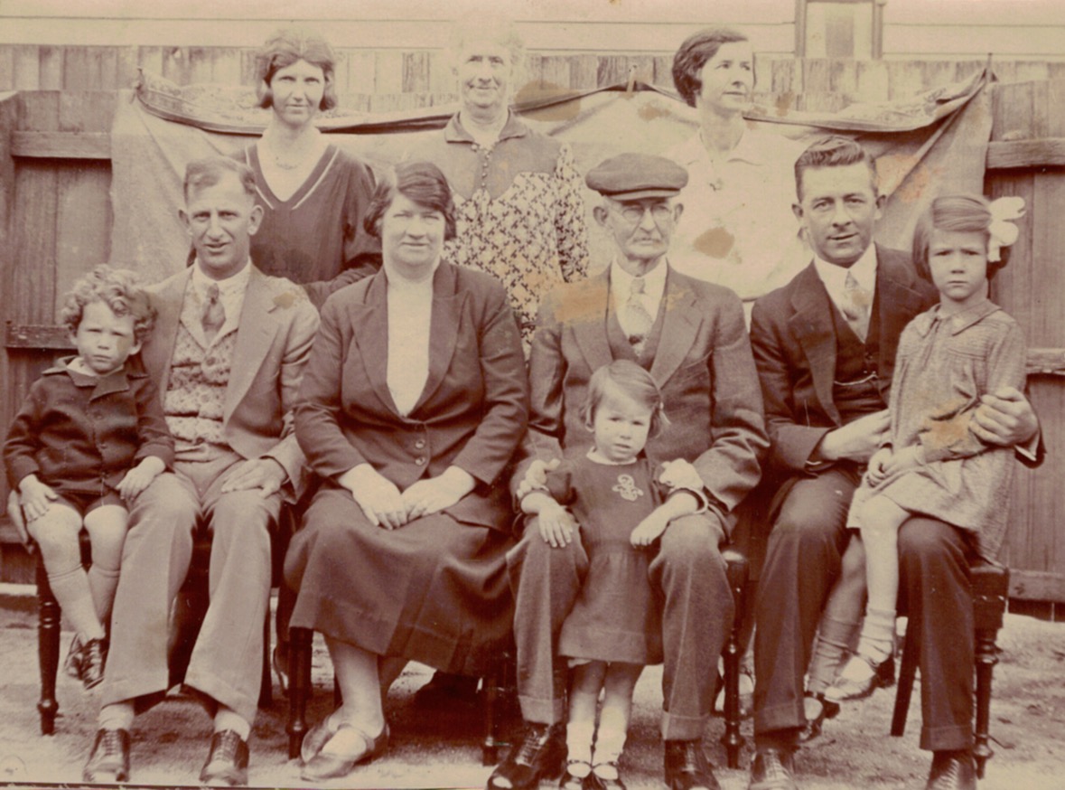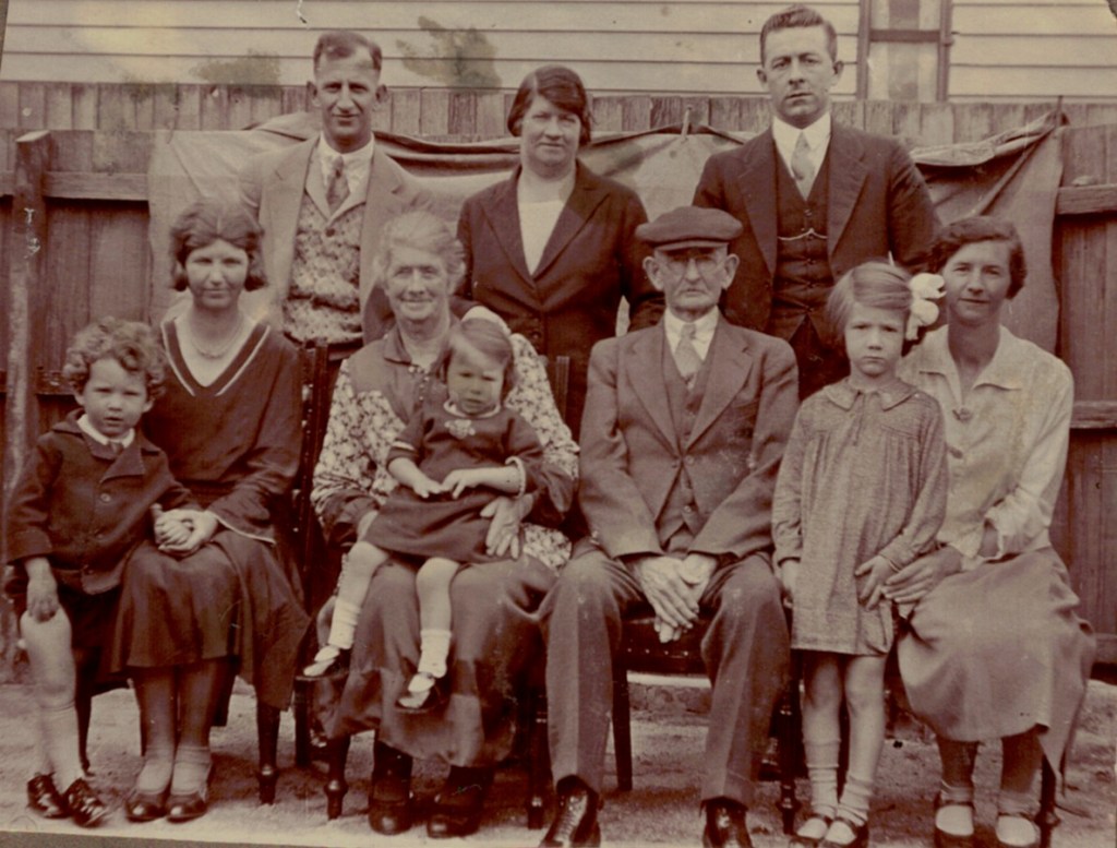 Family group, Northcote, c. 1931: standing rear L-R, Walter Marney, Alice Bowman (Cowderoy/Sherman), Ray Corrie; front L-R, Austin Marney, Violet Marney (Moss), Annie Marney (Sherman nee Cowderoy) nursing Gwen Corrie (later Harwood), Walter Marney, Joan Corrie (later Snibson) and Rose Corrie (Marney).