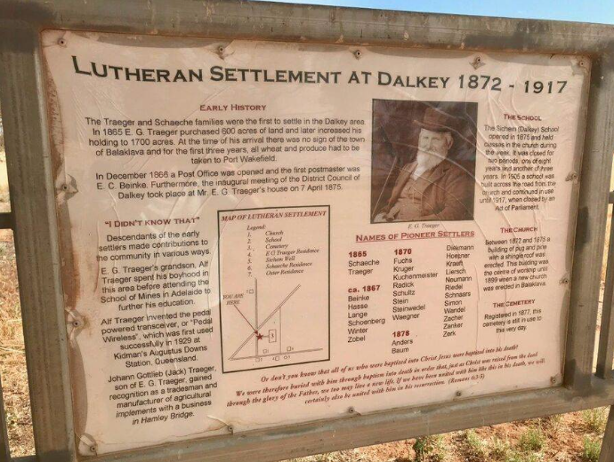 1. SCHACHE [G1] Carl Gottlob (Vogel) 1.1 SCHACHE Maria Rosina (HETZEL)1.2 SCHACHE Johann Gottlieb (Ulbrich/Richter)1.3 SCHACHE [G2] CARL GOTTLOB (Schubert)1.4 SCHAECHE Heinrich Wilhelm (Hales)1.5 SCHACHE Ernst Gottfried (Schubert)1.6 SCHACHE Johanne Elisabeth (LANGE)1.7 SCHACHE Traugott Wilhelm (Ulbrich/Kuhm)1.8 SCHACHE Gottlieb Reinhold Documents and Memorabilia (1. SCHACHE) Sign on the site of the Sichem (Dalkey) Lutheran Church, School and Cemetery, SA [Monument Australia 2020 (created 1986)].