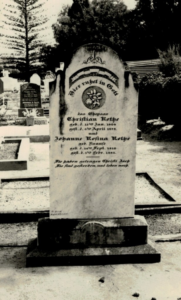 Headstone for Rosina Rothe (Irrgang, Schubert nee Krause) and Christian Rothe, Langmeil Lutheran Cemetery, Tanunda SA [Reg Munchenberg].