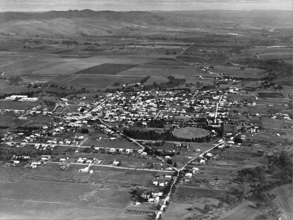 Aerial photograph of Tanunda, SA, 1938, looking south (south-east), showing the Schubert properties, “Traut Heim” opposite the three-way intersection (lower right), “Fichten Heim” nearly opposite with the original Schubert dwelling behind it, and the original Schubert selection running (west-east) along Bridge Street, and east to the river behind “Traut Heim”. Fiedler’s Turkey Flat property was situated between the houses bordering the town to the south and the Bethany Road running west-east to the south of that [State Library of South Australia, RT38006].