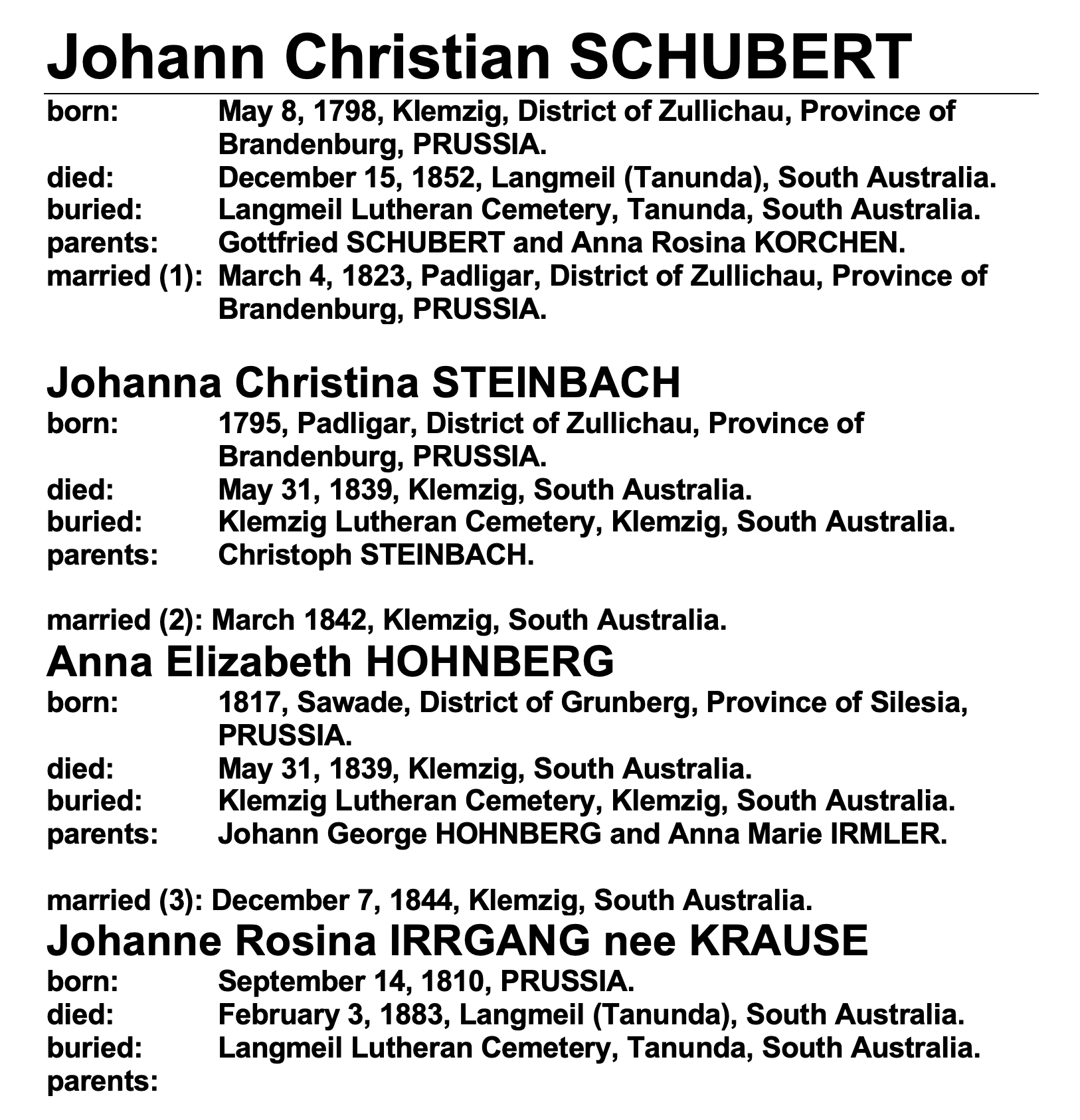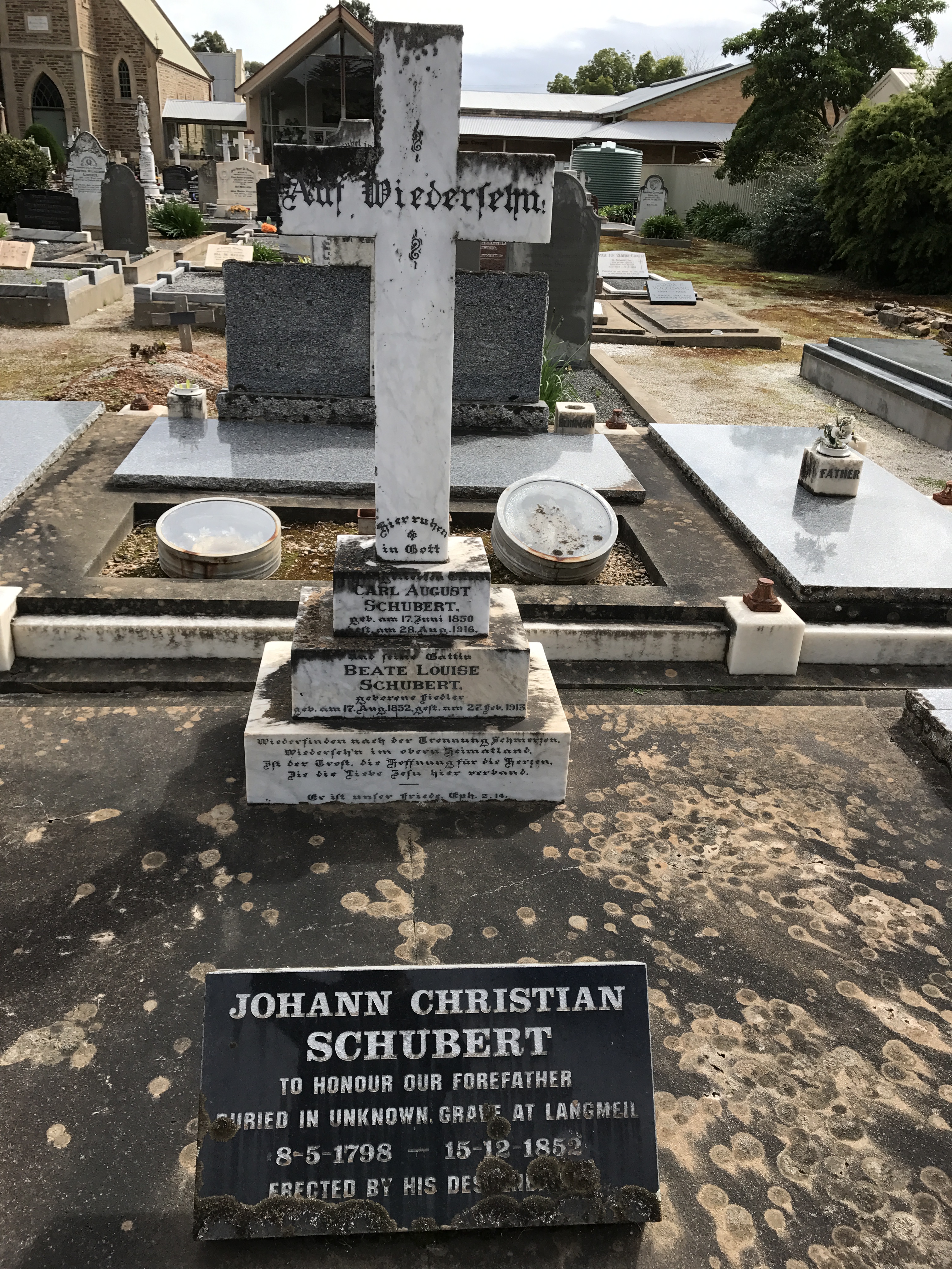 Grave of August and Louise Schubert (Fiedler), Langmeil Lutheran Cemetery, Tanunda, SA, with a memorial to Johann Christian Schubert, erected 1993; 2017 [JAS].