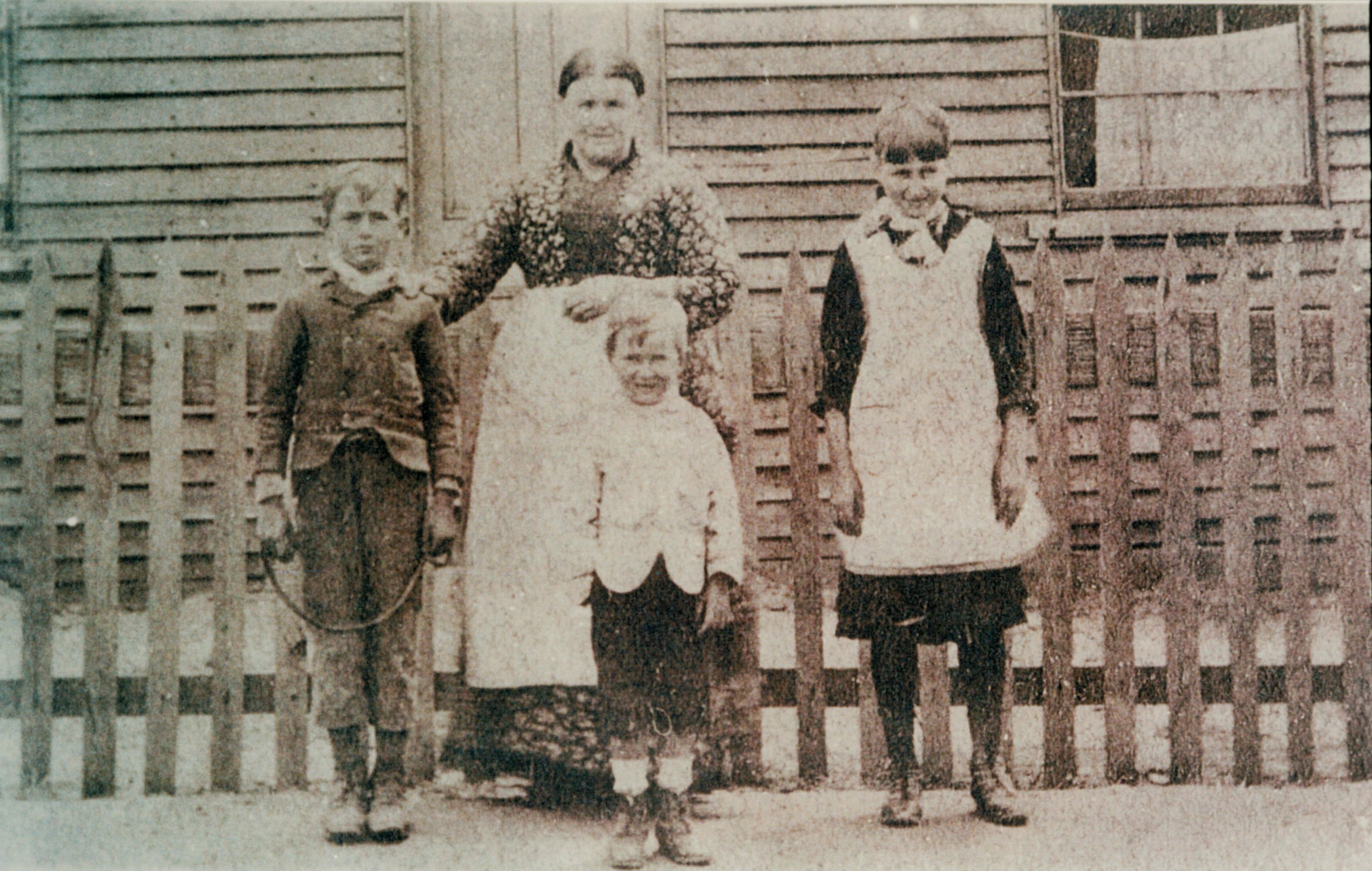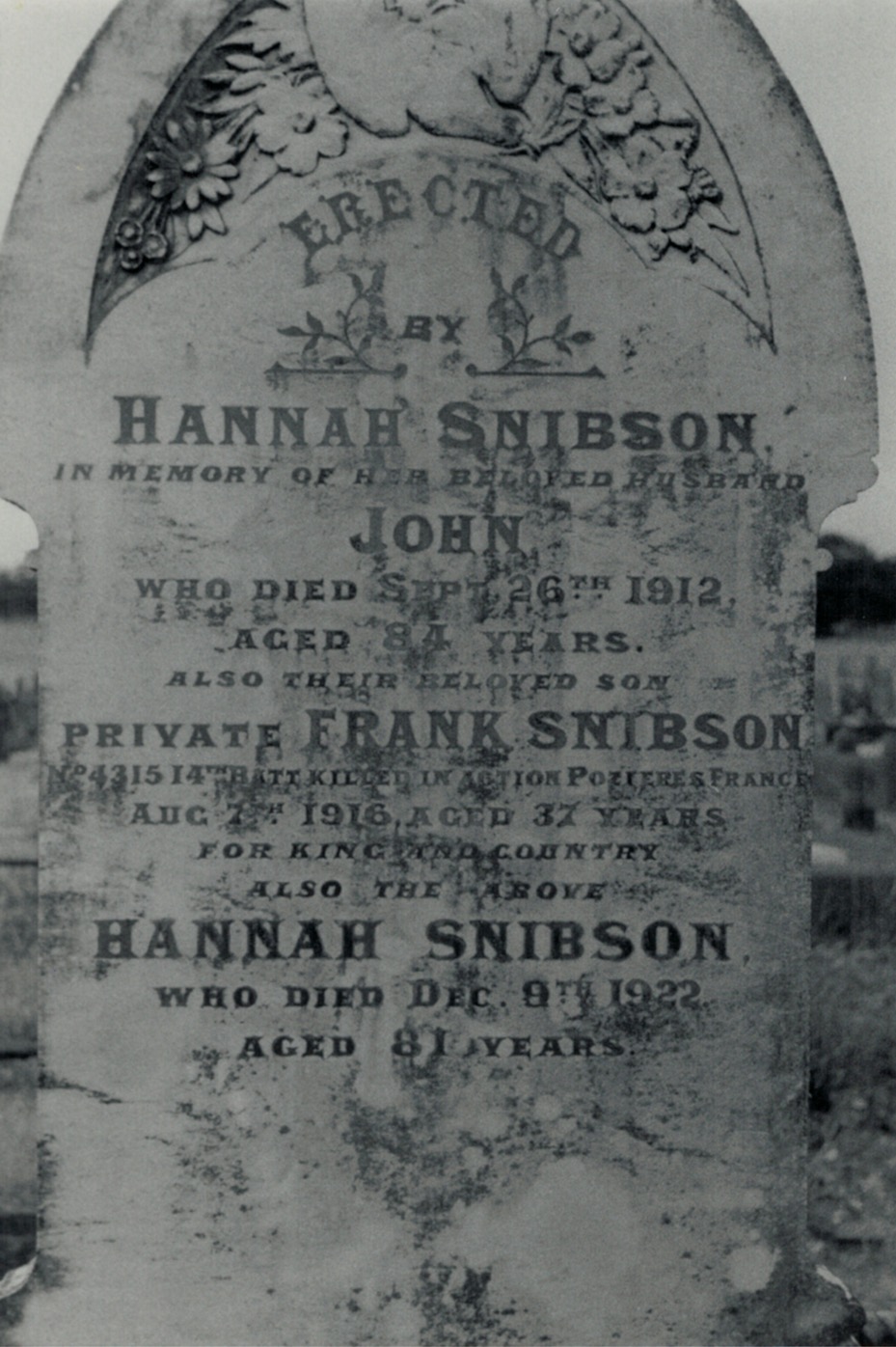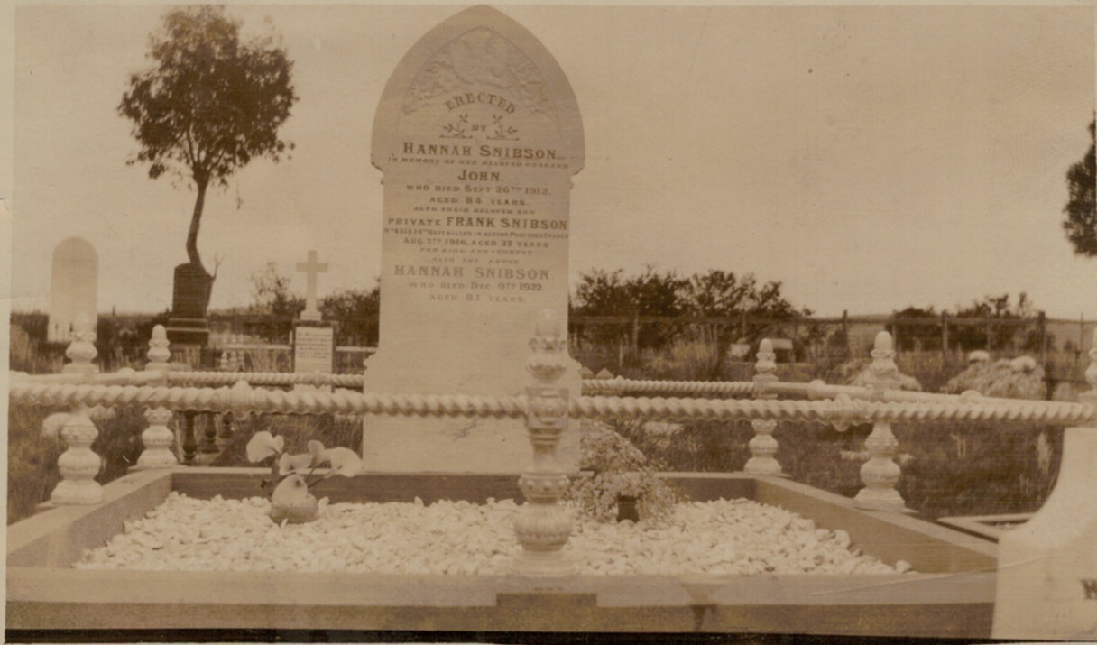Believed to be Hannah Snibson (Parker) with children or grandchildren [John Waugh].Hannah Snibson (Parker) [John Waugh].Grave of John and Hannah Snibson (Parker), Ararat Cemetery Vic., with inscription to their son Frank (KIA, France).Headstone of above.