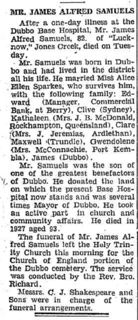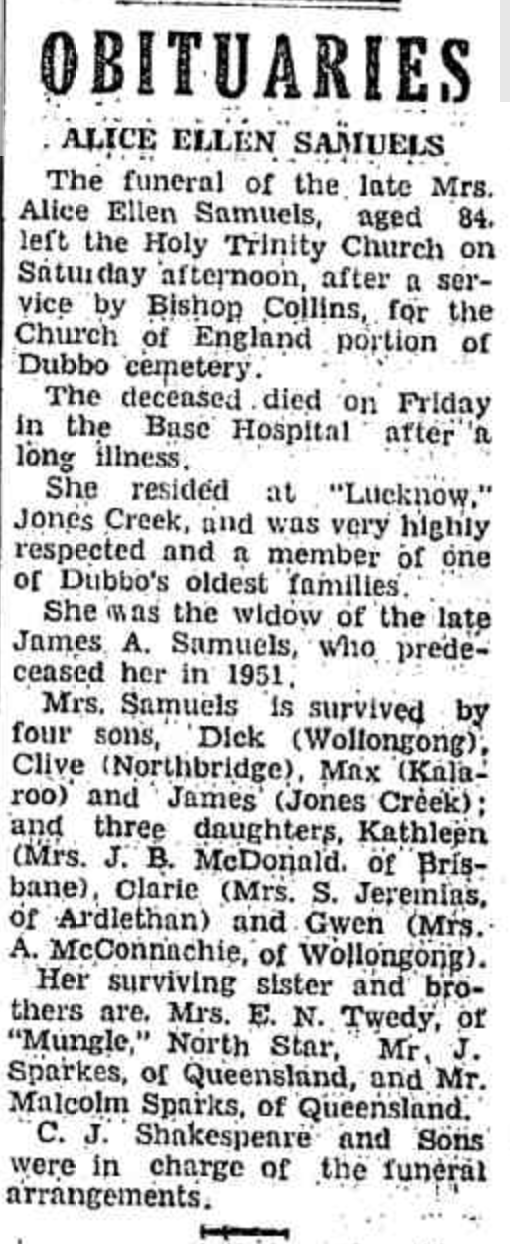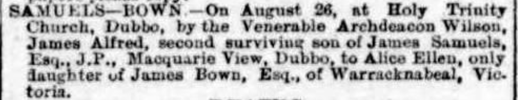 2.1 BOWN Alice Ellen (SAMUELS) Published References (2.1 BOWN/SAMUELS) “Australian Town and Country Journal” (Sydney, NSW), Saturday 19 September 1891, page 18 (“Marriages”) [Trove]. “Dubbo Liberal and Macquarie Advocate” (NSW), Thursday 19 April 1951, page 3 (extract from “Obituaries”) [Trove]. “Dubbo Liberal and Macquarie Advocate” (NSW), Tuesday 13 July 1954, page 2 [Trove].