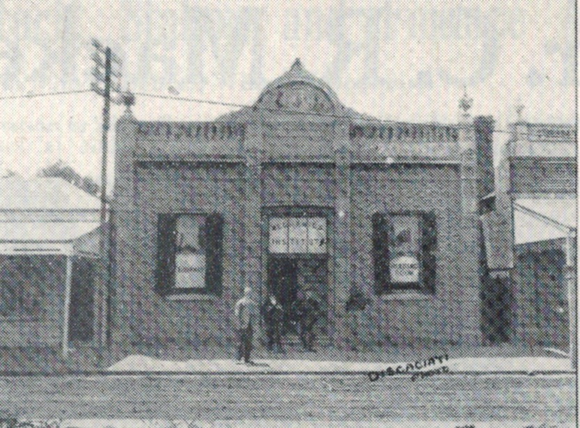 Warracknabeal Mechanics Institute, c. 1910. James Bown is probably in this photograph [Robertson, J. Edward. “Prosperous and Progressive Warracknabeal”, 1910; reproduced from 1981 reprint].Headstone for James Bown, Warracknabeal Cemetery, Vic. [Carol’s Headstone Photographs].