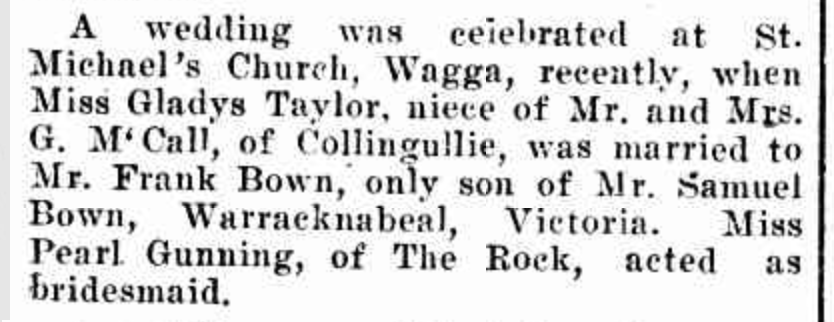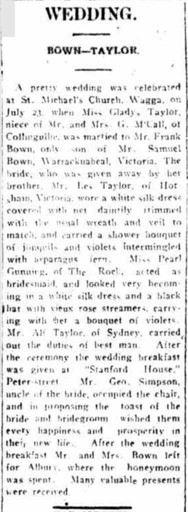 Posted on December 19, 2021December 19, 2021 by Carl SchubertPublished References (1.8.1. BOWN) “Daily Advertiser” (Wagga Wagga, NSW), Friday 5 August 1921, page 4. “Horsham Times” (Vic.), Friday 5 August 1921, page 5. “Albury Banner and Wodonga Express” (NSW), Friday 12 August 1921, page 27 (extract from “Personal”). Related