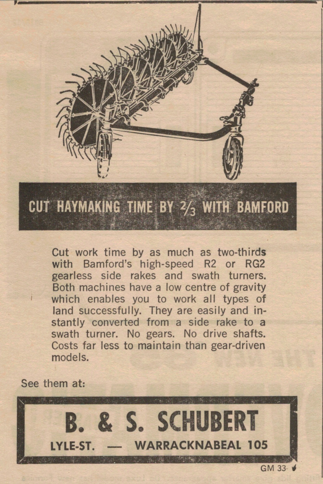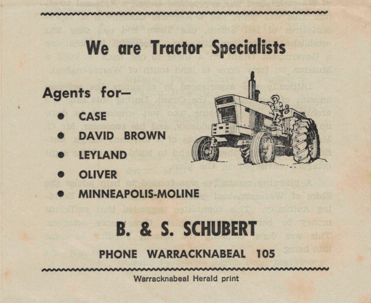 “Warracknabeal Herald” (Vic.), Friday 16 July 1971, page 4.Programme of the Official Opening of the North Western Agricultural Machinery Museum, Warracknabeal, Monday 23 April 1973 (rear page).