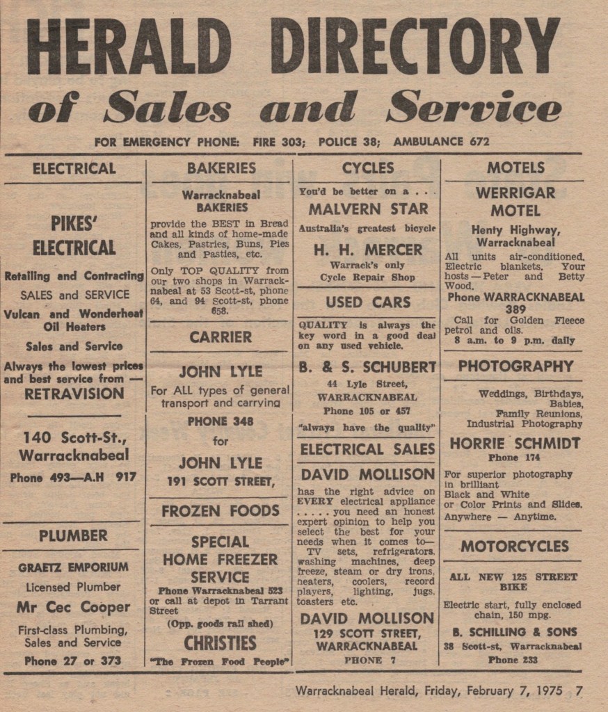 “Warracknabeal Herald” (Vic.),,Friday 7 February 1975, page 7.