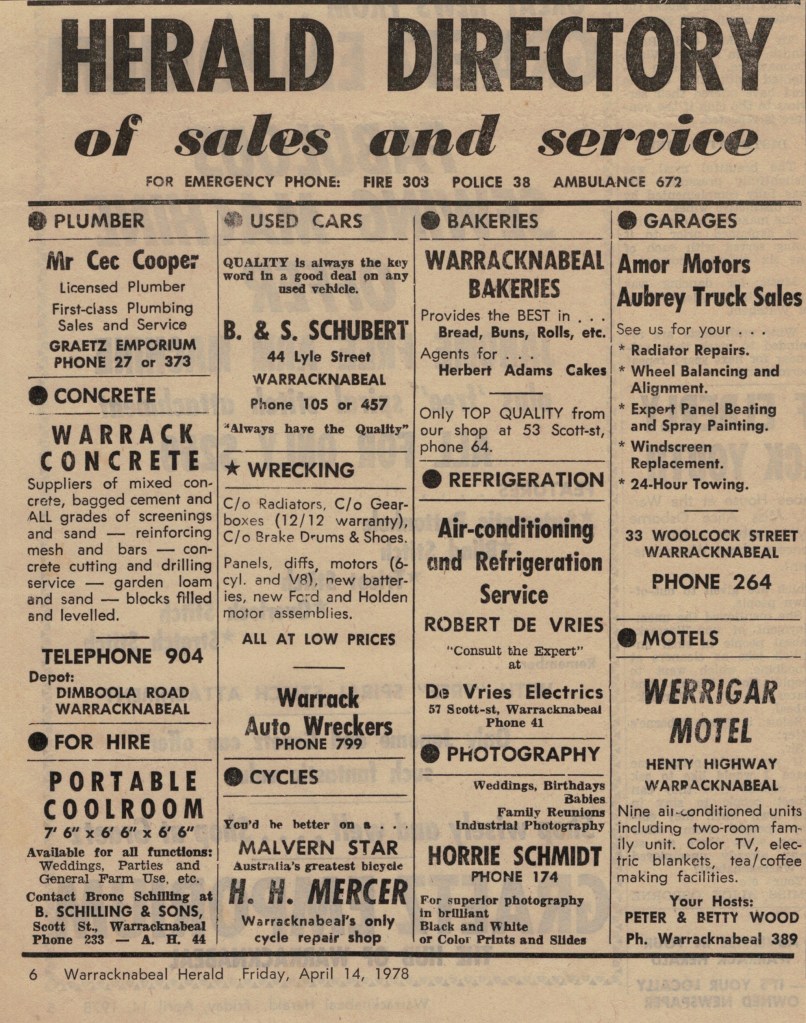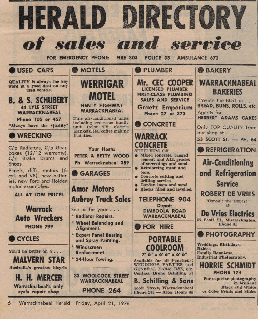 “Warracknabeal Herald” (Vic.), Friday 14 April 1978, page 6.