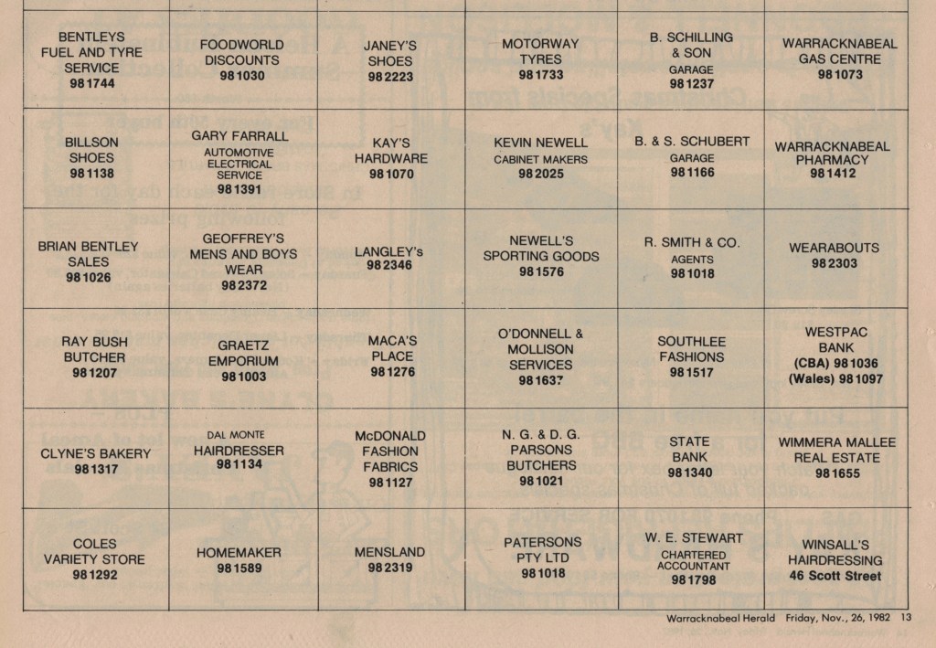 “Warracknabeal Herald” (Vic.), Friday 26 November 1982, page 13.