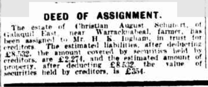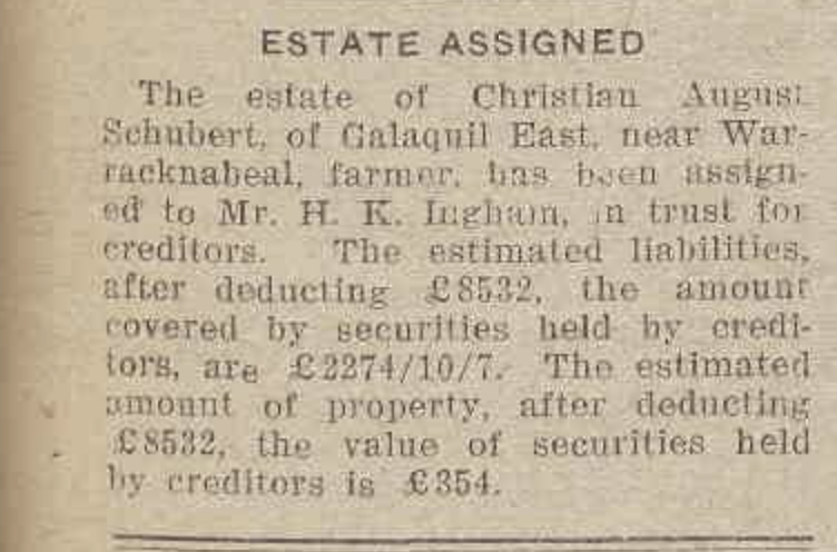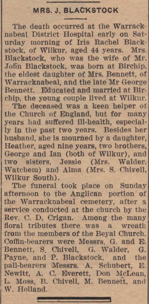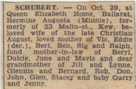 “Warracknabeal Herald” (Vic.) Friday 6 April 1945, page 2, the same edition as the obituary of Mary Schubert (Schache).