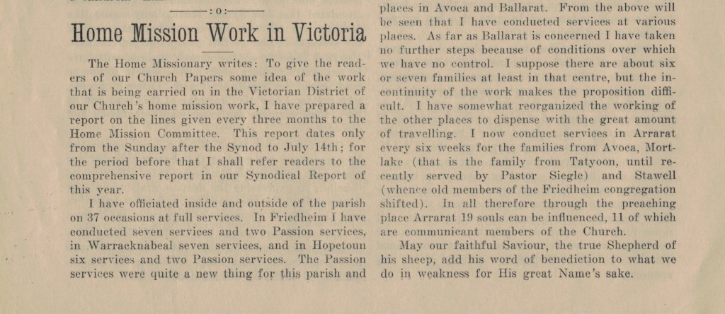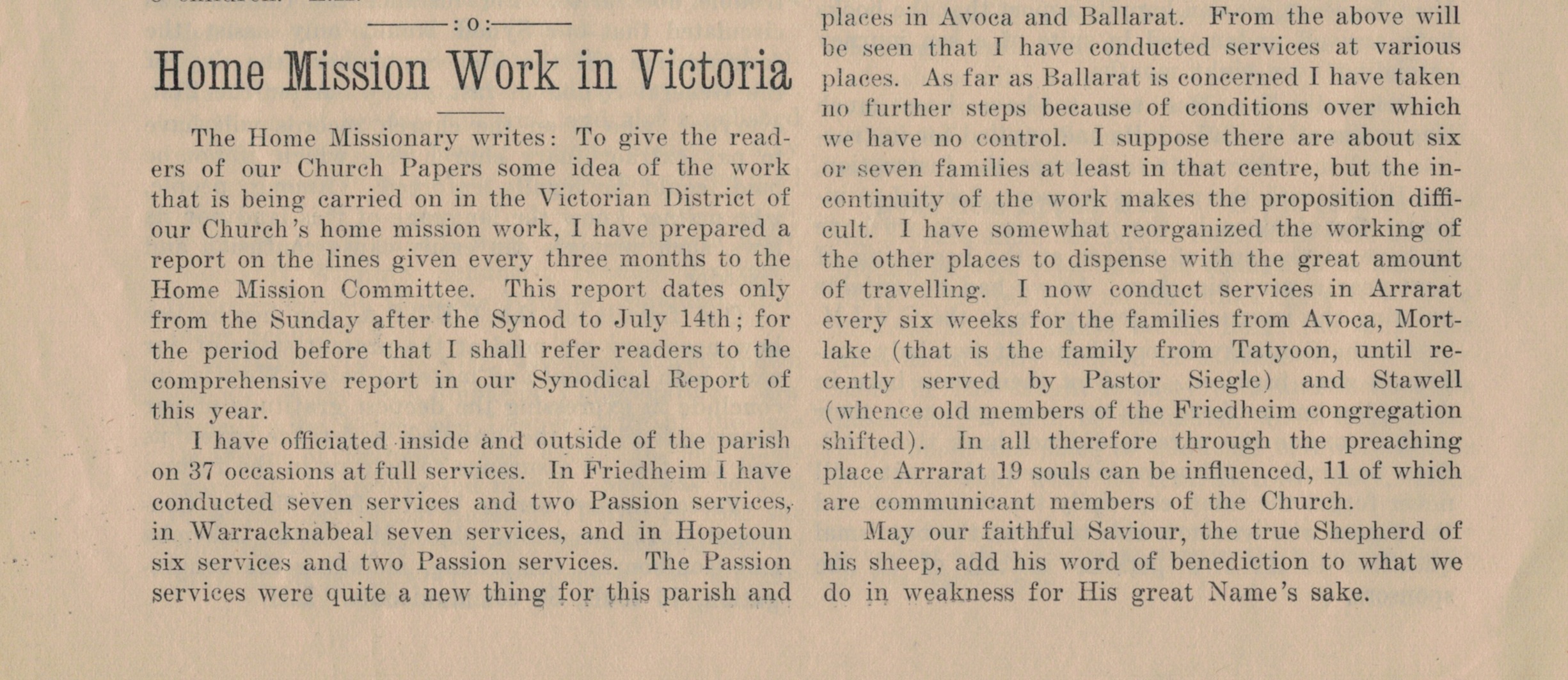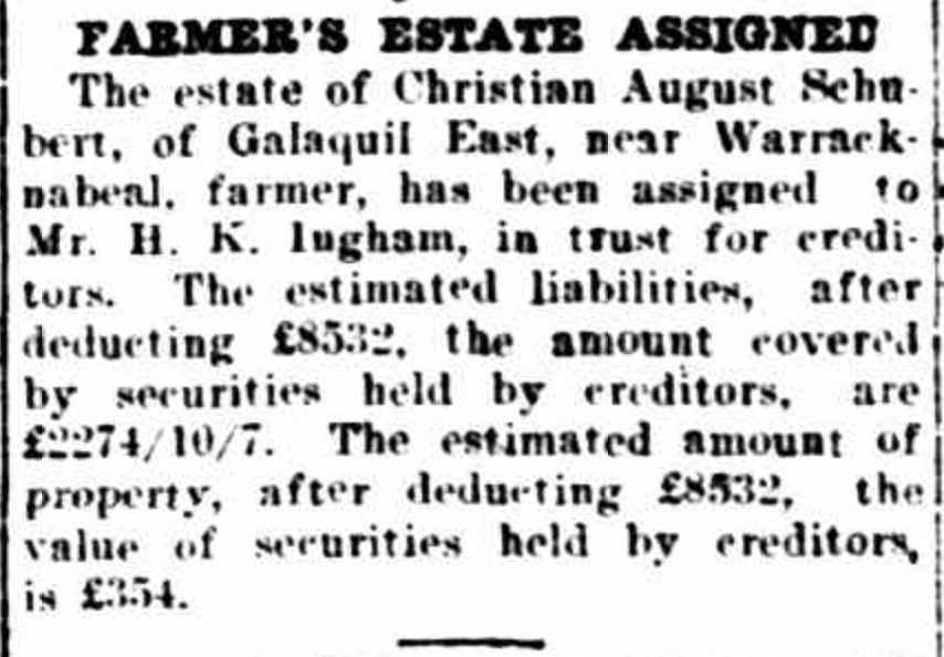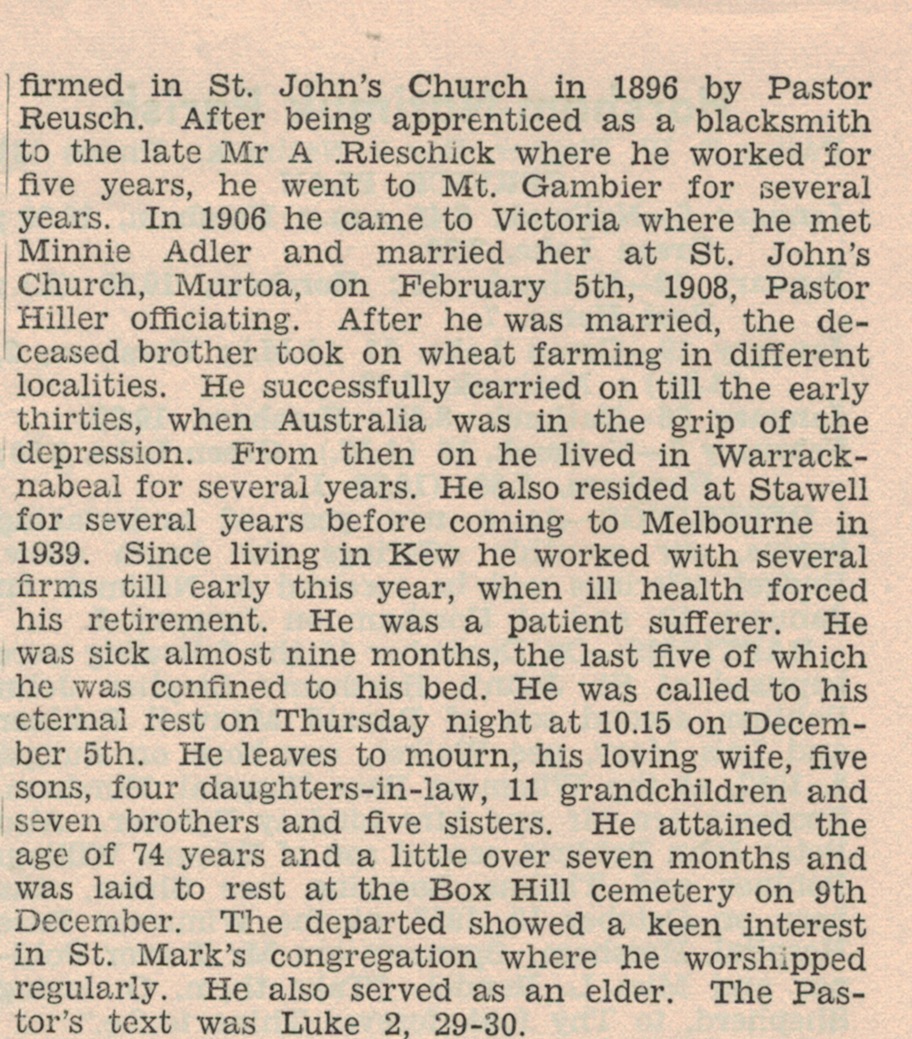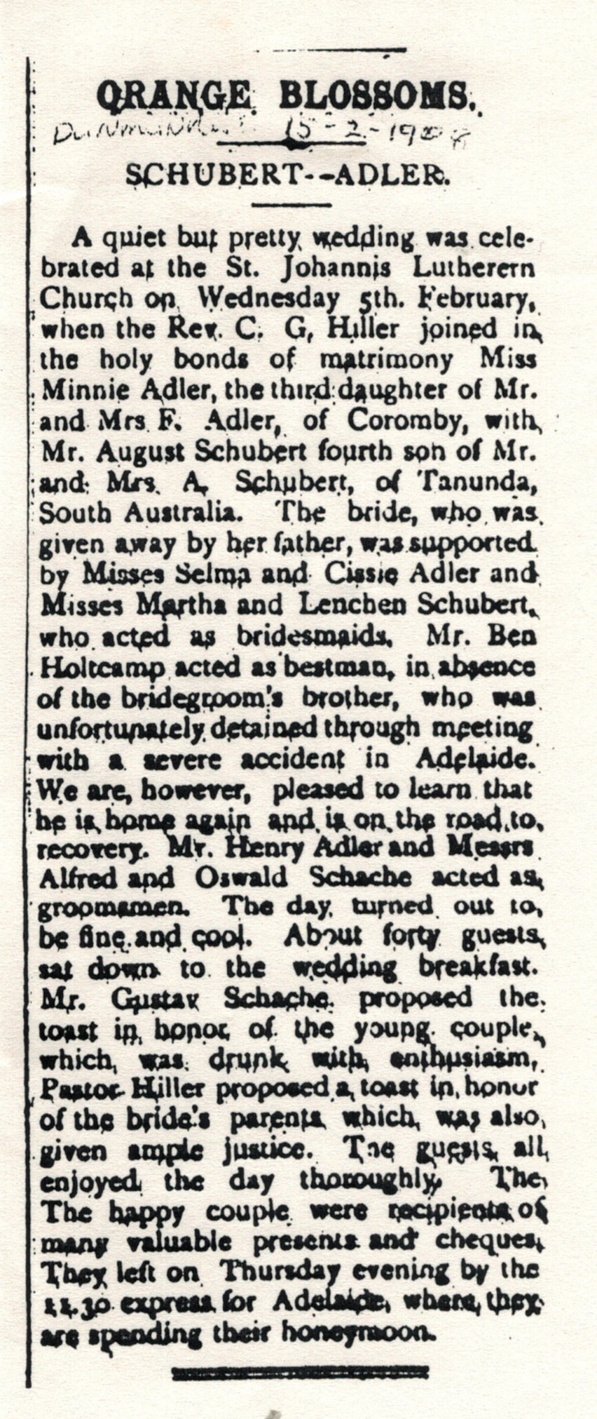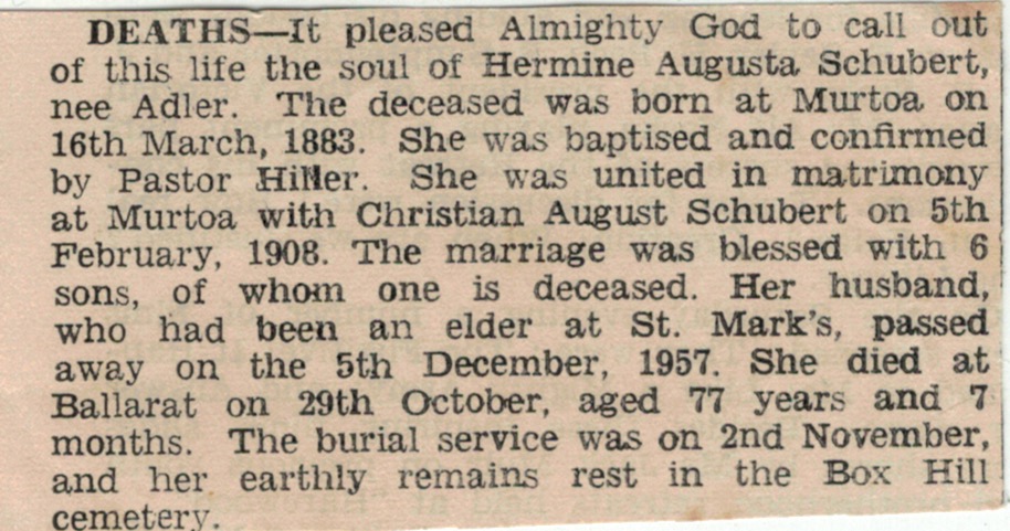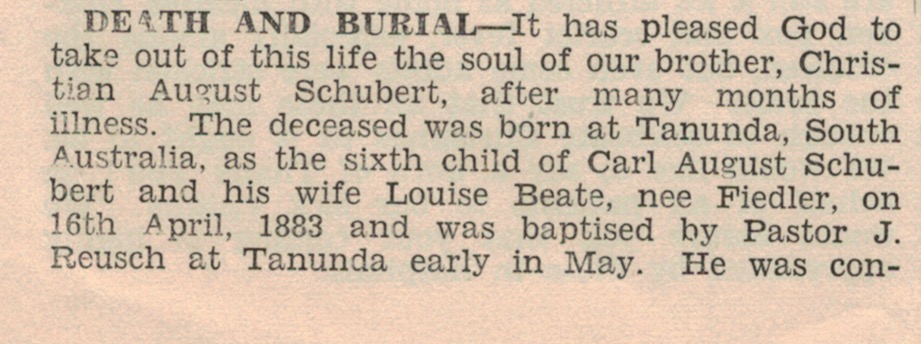 “Lutheran Herald” (Tanunda, SA), 30 September 1935 (extract of the article with reference to the Schubert family – “old members of the Friedheim congregation”).“Lutheran News” (Horsham, Vic.), January 1958, page 4.