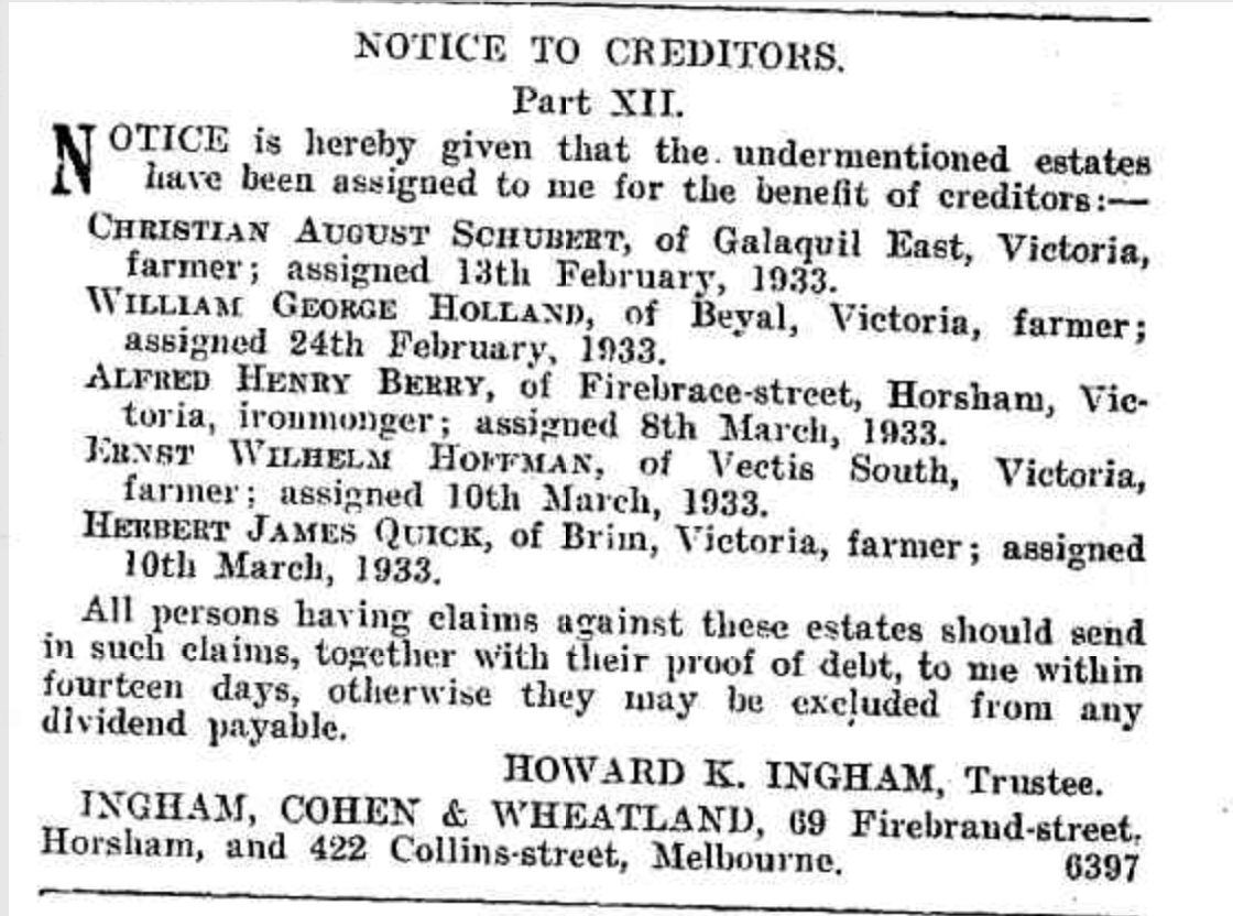 “Argus” (Melbourne, Vic.), Tuesday 14 March 1933, page 4 [Trove].“Ouyen Mail” (Vic.), Friday 17 March 1933, page 3. Also published in “Age” (Melbourne, Vic.), Tuesday 14 March 1933, page 8.“Horsham Times” (Vic.), Friday 17 March 1933, page 4 [Trove].