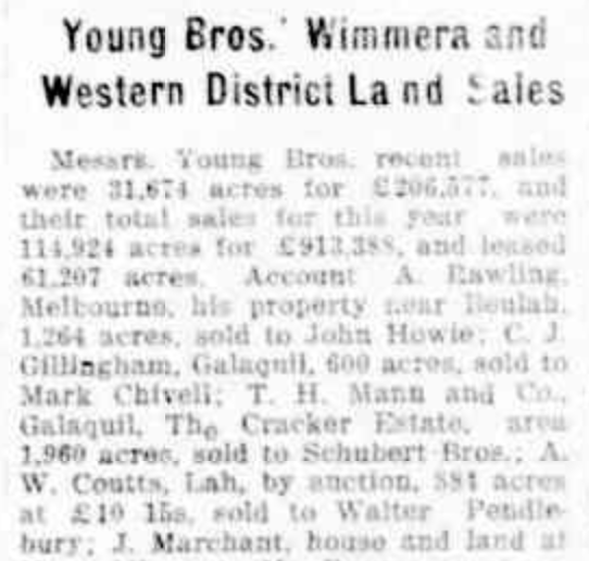 “Horsham Times” (Vic.), Tuesday 19 December 1922, page 3 (extract from “Auctioneers’ Reports”)