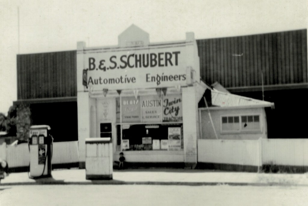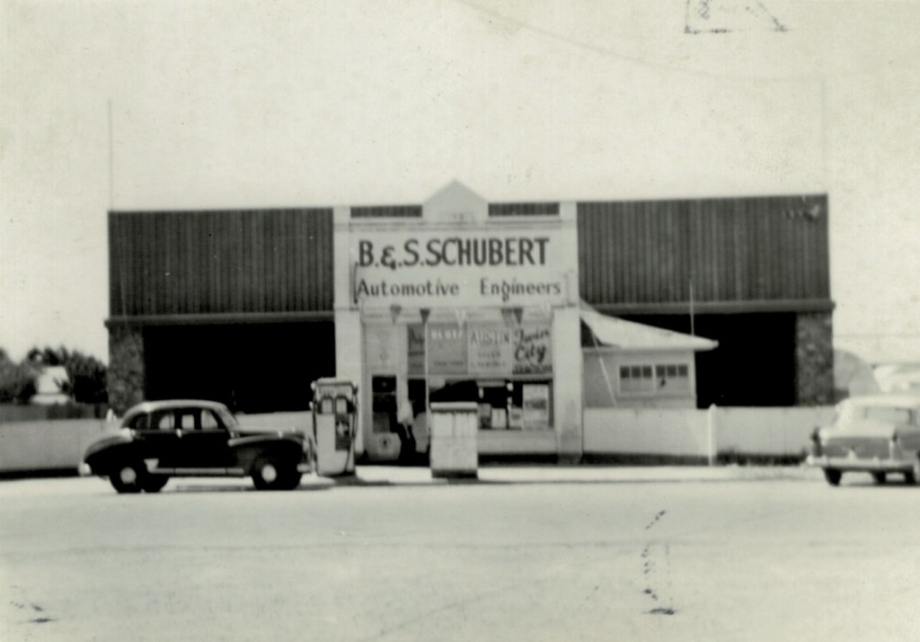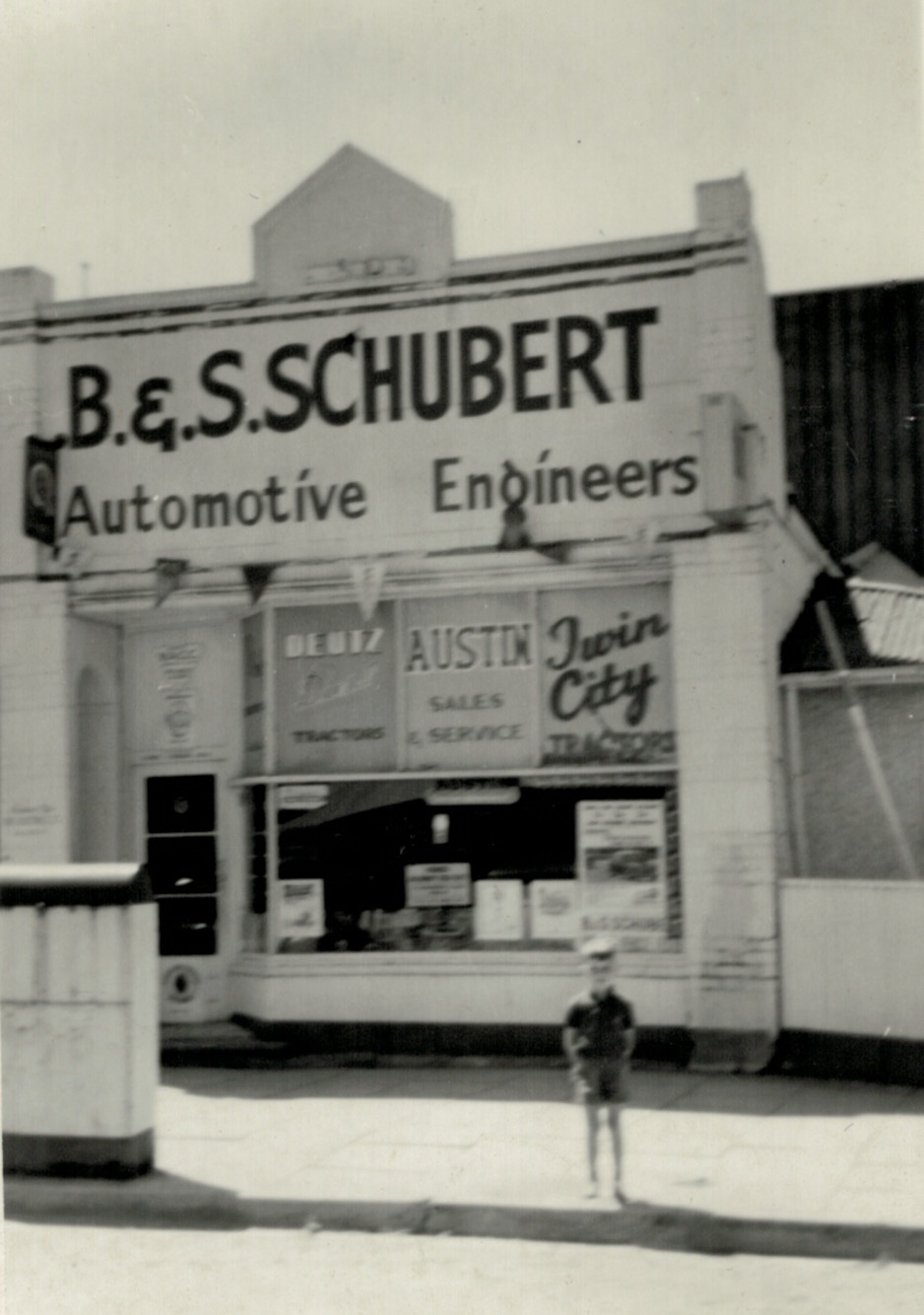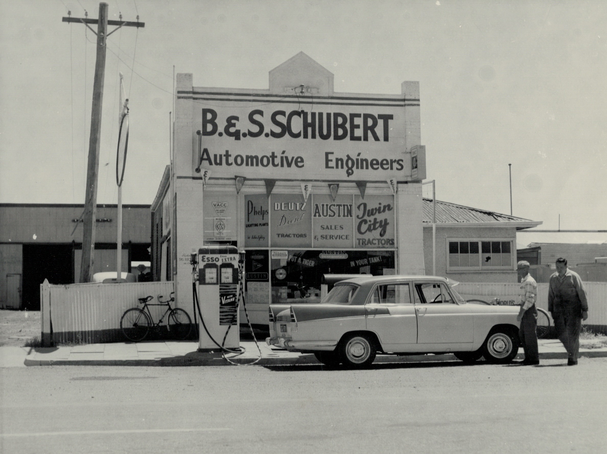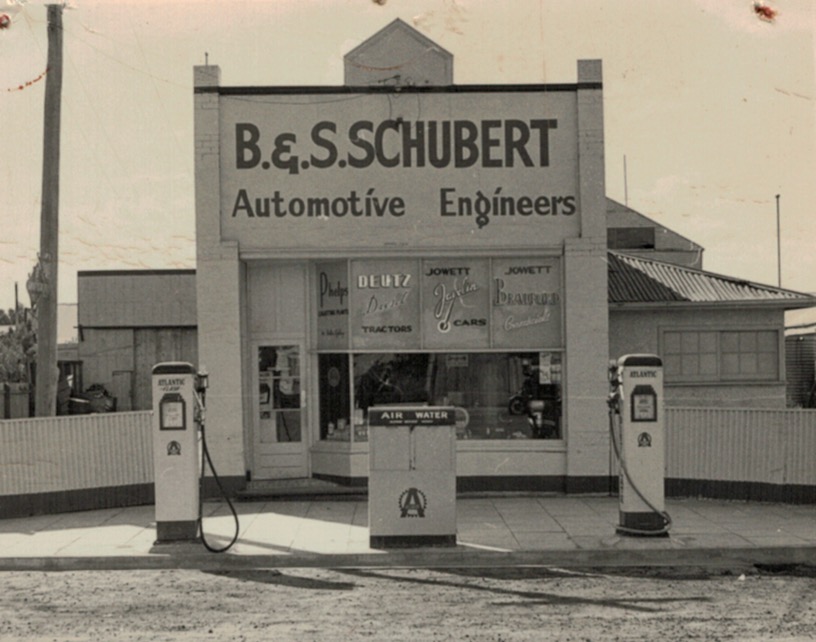 Home of Fred and Bertha Schache, 12 Arnold Street, Warracknabeal, where Bert Schubert began repairing vehicles in his own right in 1936, to be joined later that year by his brother Sig.The residence at 68 Anderson Street, Warracknabeal, where Schubert Brothers was re-established in 1937. Photograph taken 1966 [JAS].Schubert Brothers workshop, Anderson Street. The original garage is to the left while two figures can be seen in the shed built in 1938, possibly Bert Schubert and Allan Bentley.B & S Schubert’s premises, Lyle Street, Warracknabeal, 1950s: showroom and spare parts in the front building with the office annexe to the right; workshop in the building behind. As above. The advertising painted on the windows are all early franchises held by Schuberts: Phelps lighting plants, Deutz tractors and Javelin and Bradford vehicles. The petrol being sold was Atlantic.Bill Rose, accountant and office manager, working in the office of the old building.In the office of the old building: Bill Rose, Coral Cook, typiste and Sig Schubert. The wooden cupboard behind Sig was used to store all the new vehicle and machinery brochures [Coral Hicks].B & S Schubert, late 1962 or early 1963. Sig commissioned Warracknabeal photographer Horrie Schmidt to take some photographs of the old buildings as the new garage was about to be built (six photographs). The Austin Freeway pictured was purchased from B&SS by the local chemist, Bill Bell (light shirt) who is waiting for the workshop foreman, Bunt Tong to fill up his car. In the front window two banners can be seen which read “Put a tiger in your tank”, which was the advertising motto for Esso petrol for a period. The advertising on the windows on the right have been changed to Austin vehicles and Twin City tractors [Horrie Schmidt]. Same view, looking eastwards towards Scott Street, showing hanging signs for Esso petrol and Nuffield tractors. Graeme Bell, salesman, is assisting his father with the car. Gardiner’s old house is in the background [Horrie Schmidt].Same view, looking north-westwards towards Gardiner’s Funeral Parlour [Horrie Schmidt].The spare parts section in the front building behind the showroom. Claude Ross, who owned C. C. Ross Motors in Scott Street is being attended by Bill Rose, accountant and office manager, and Freddie Jones. Notice the large “A” for Austin mascot on the wall and the Atlantic petrol drum, bottom right. The offices were in the weatherboard annexe to the right in this photograph [Horrie Schmidt].Looking towards the workshop building at the rear, from the yard to the east of the front building. The wooden section, left, at the rear of the front building was the battery room. The Austin with it’s bonnet up was sold by B&SS., while the concrete foundations for the new building can be seen front right [Horrie Schmidt].The yard to the west of the main building showing the large sliding doors to the workshop building and the battery room at the rear of the front building. The concrete foundations for the new building can be seen to the left [Horrie Schmidt].Steel truss for Schubert’s new building being swung into place from the back entrance, 15 January, 1963. The photograph shows the old Coffee Palace stables, then part of Schubert’s property, and the Coffee Palace itself in the background. The figure in the shed could be Sig.Sig Schubert refuelling the “Herald plane” at Warracknabeal Aerodrome, January 1965. B & S Schubert had the contract to refuel the plane that delivered the evening edition of the Melbourne “Herald” newspaper on Saturday afternoons [JAS].The old garage building with the new built behind and partly over it, 1965 [JAS].As above, with Mark Schubert sitting on the front step [JAS].As above, with Mark Schubert standing in front [JAS].The new building, 6 March, 1966, shortly after the old had been demolished and before the front glass windows and doors had been installed. The front of the building was fenced off and access was through the back yard [JAS].Looking from Schubert’s showroom towards Lyle Street, c. March 1967, during a lengthy period when Bert and Sig worked most weekends to complete the new building. Pictured L-R, Don Schubert, Bert and Sig and the “shop ute”. At this stage the front of the building was still fenced off. [JAS]As above [JAS]