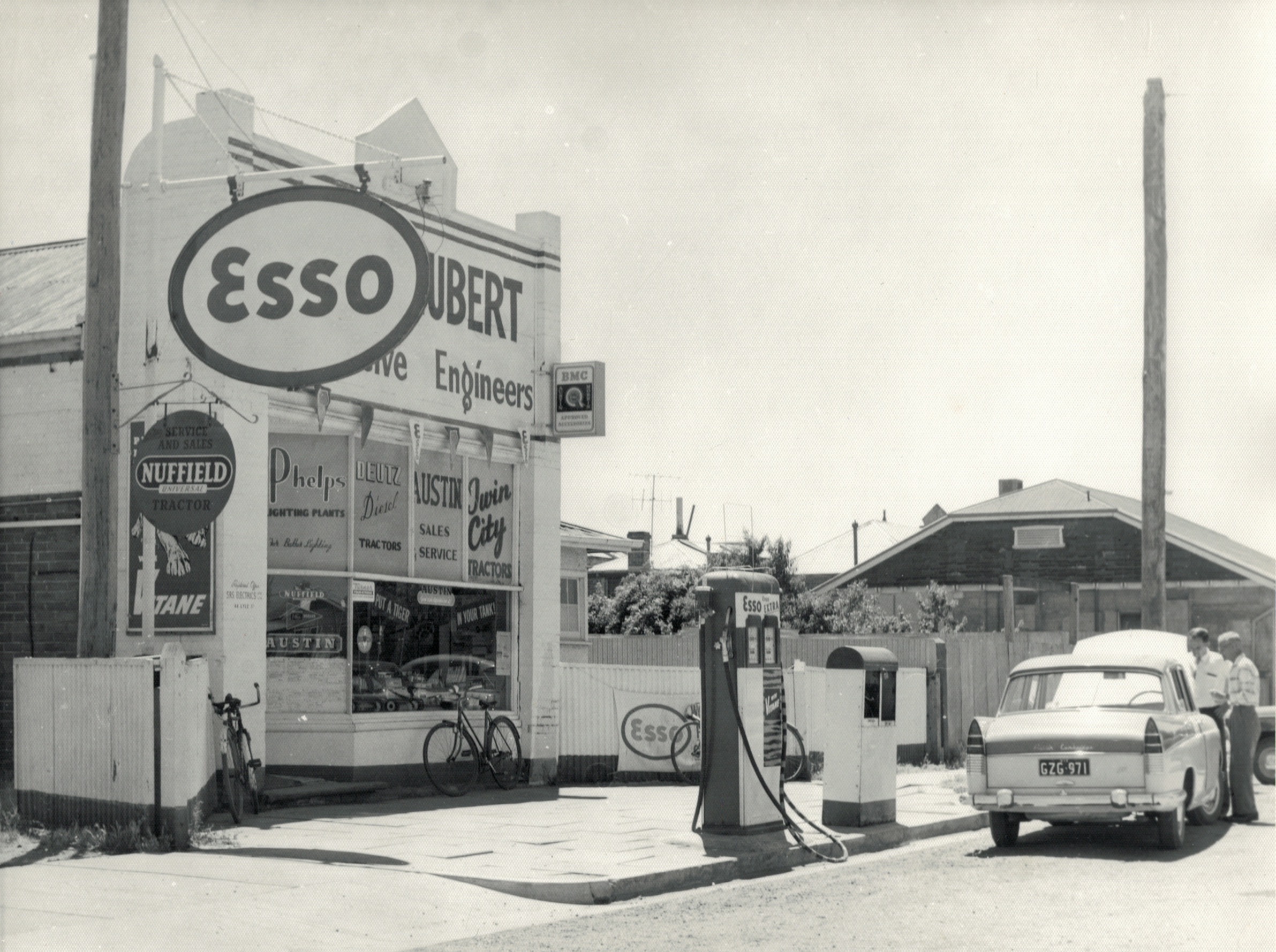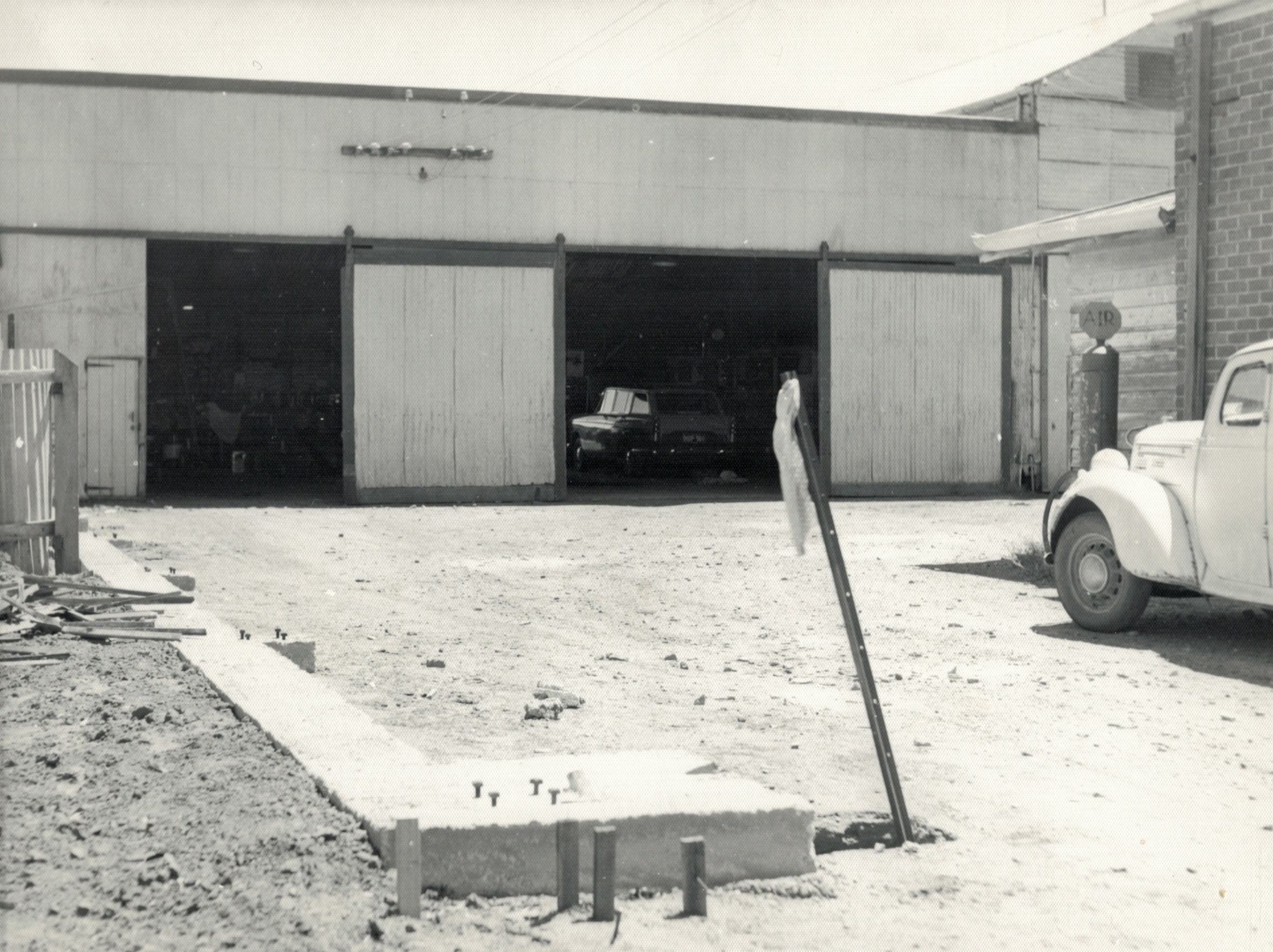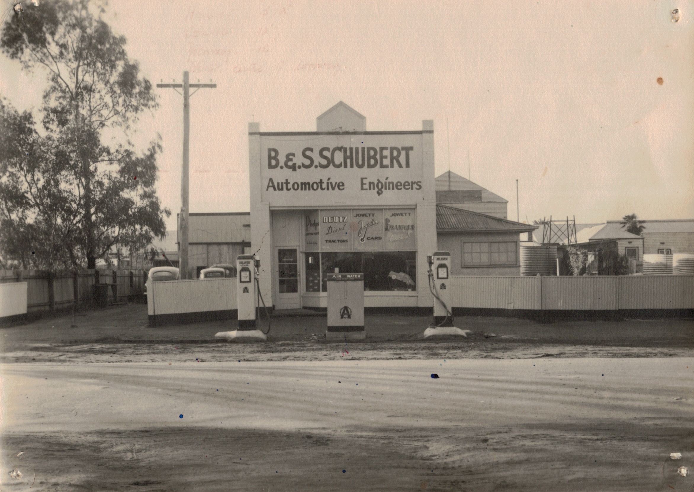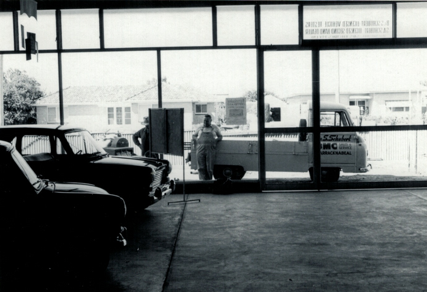 Home of Fred and Bertha Schache, 12 Arnold Street, Warracknabeal, where Bert Schubert began repairing vehicles in his own right in 1936, to be joined later that year by his brother Sig.The residence at 68 Anderson Street, Warracknabeal, where Schubert Brothers was re-established in 1937. Photograph taken 1966 [JAS].Schubert Brothers workshop, Anderson Street. The original garage is to the left while two figures can be seen in the shed built in 1938, possibly Bert Schubert and Allan Bentley.B & S Schubert’s premises, Lyle Street, Warracknabeal, 1950s: showroom and spare parts in the front building with the office annexe to the right; workshop in the building behind. As above. The advertising painted on the windows are all early franchises held by Schuberts: Phelps lighting plants, Deutz tractors and Javelin and Bradford vehicles. The petrol being sold was Atlantic.Bill Rose, accountant and office manager, working in the office of the old building.In the office of the old building: Bill Rose, Coral Cook, typiste and Sig Schubert. The wooden cupboard behind Sig was used to store all the new vehicle and machinery brochures [Coral Hicks].B & S Schubert, late 1962 or early 1963. Sig commissioned Warracknabeal photographer Horrie Schmidt to take some photographs of the old buildings as the new garage was about to be built (six photographs). The Austin Freeway pictured was purchased from B&SS by the local chemist, Bill Bell (light shirt) who is waiting for the workshop foreman, Bunt Tong to fill up his car. In the front window two banners can be seen which read “Put a tiger in your tank”, which was the advertising motto for Esso petrol for a period. The advertising on the windows on the right have been changed to Austin vehicles and Twin City tractors [Horrie Schmidt]. Same view, looking eastwards towards Scott Street, showing hanging signs for Esso petrol and Nuffield tractors. Graeme Bell, salesman, is assisting his father with the car. Gardiner’s old house is in the background [Horrie Schmidt].Same view, looking north-westwards towards Gardiner’s Funeral Parlour [Horrie Schmidt].The spare parts section in the front building behind the showroom. Claude Ross, who owned C. C. Ross Motors in Scott Street is being attended by Bill Rose, accountant and office manager, and Freddie Jones. Notice the large “A” for Austin mascot on the wall and the Atlantic petrol drum, bottom right. The offices were in the weatherboard annexe to the right in this photograph [Horrie Schmidt].Looking towards the workshop building at the rear, from the yard to the east of the front building. The wooden section, left, at the rear of the front building was the battery room. The Austin with it’s bonnet up was sold by B&SS., while the concrete foundations for the new building can be seen front right [Horrie Schmidt].The yard to the west of the main building showing the large sliding doors to the workshop building and the battery room at the rear of the front building. The concrete foundations for the new building can be seen to the left [Horrie Schmidt].Steel truss for Schubert’s new building being swung into place from the back entrance, 15 January, 1963. The photograph shows the old Coffee Palace stables, then part of Schubert’s property, and the Coffee Palace itself in the background. The figure in the shed could be Sig.Sig Schubert refuelling the “Herald plane” at Warracknabeal Aerodrome, January 1965. B & S Schubert had the contract to refuel the plane that delivered the evening edition of the Melbourne “Herald” newspaper on Saturday afternoons [JAS].The old garage building with the new built behind and partly over it, 1965 [JAS].As above, with Mark Schubert sitting on the front step [JAS].As above, with Mark Schubert standing in front [JAS].The new building, 6 March, 1966, shortly after the old had been demolished and before the front glass windows and doors had been installed. The front of the building was fenced off and access was through the back yard [JAS].Looking from Schubert’s showroom towards Lyle Street, c. March 1967, during a lengthy period when Bert and Sig worked most weekends to complete the new building. Pictured L-R, Don Schubert, Bert and Sig and the “shop ute”. At this stage the front of the building was still fenced off. [JAS]As above [JAS]