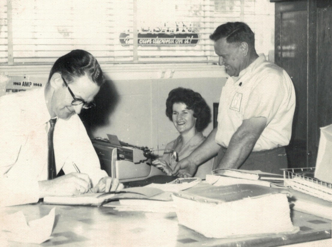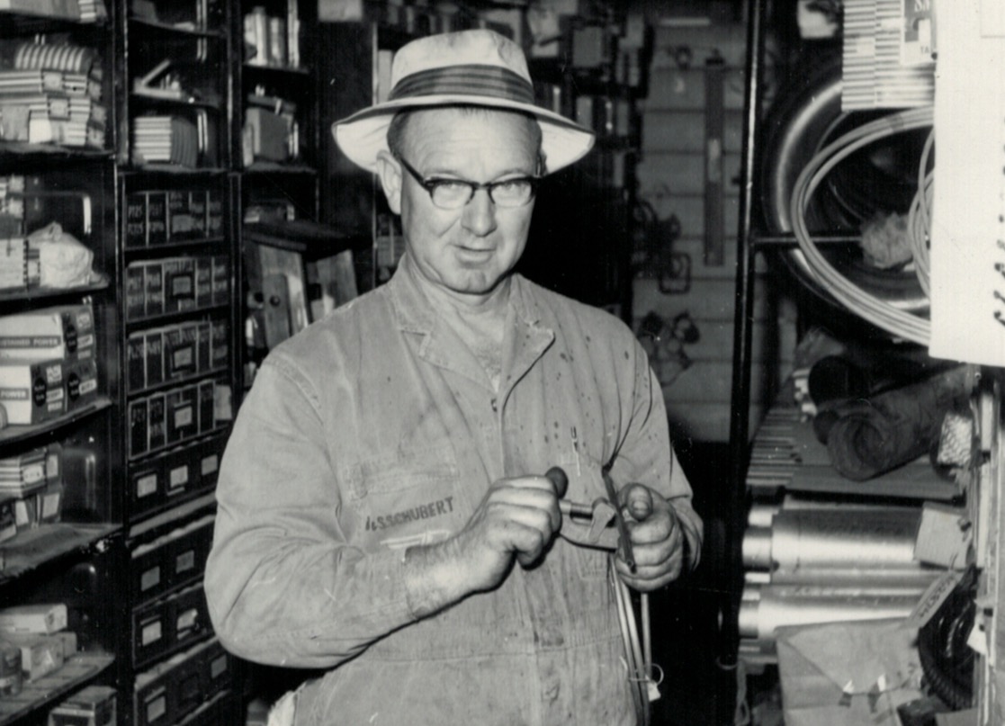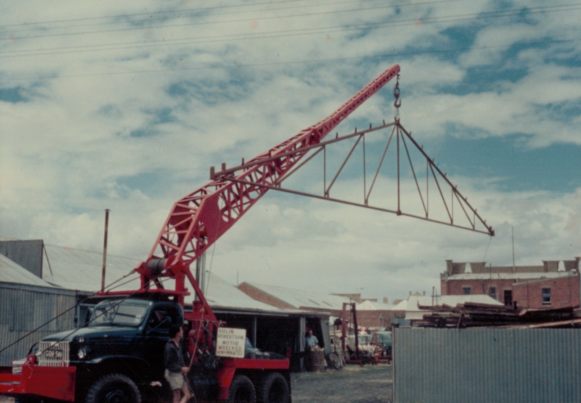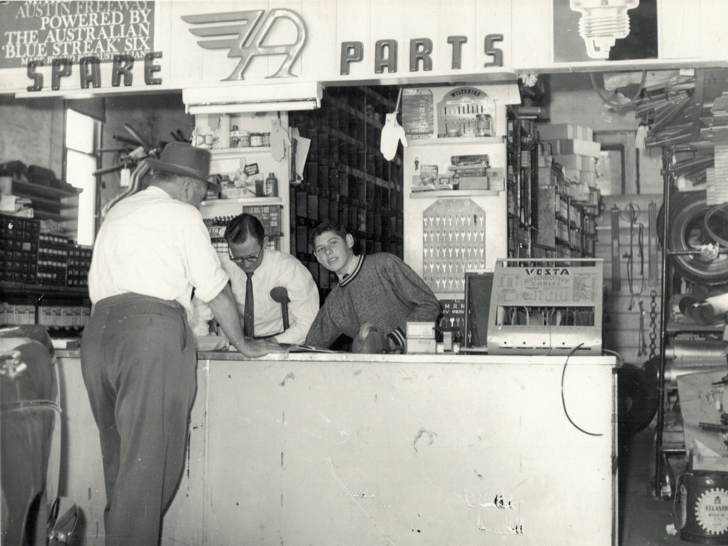 Home of Fred and Bertha Schache, 12 Arnold Street, Warracknabeal, where Bert Schubert began repairing vehicles in his own right in 1936, to be joined later that year by his brother Sig.The residence at 68 Anderson Street, Warracknabeal, where Schubert Brothers was re-established in 1937. Photograph taken 1966 [JAS].Schubert Brothers workshop, Anderson Street. The original garage is to the left while two figures can be seen in the shed built in 1938, possibly Bert Schubert and Allan Bentley.B & S Schubert’s premises, Lyle Street, Warracknabeal, 1950s: showroom and spare parts in the front building with the office annexe to the right; workshop in the building behind. As above. The advertising painted on the windows are all early franchises held by Schuberts: Phelps lighting plants, Deutz tractors and Javelin and Bradford vehicles. The petrol being sold was Atlantic.Bill Rose, accountant and office manager, working in the office of the old building.In the office of the old building: Bill Rose, Coral Cook, typiste and Sig Schubert. The wooden cupboard behind Sig was used to store all the new vehicle and machinery brochures [Coral Hicks].B & S Schubert, late 1962 or early 1963. Sig commissioned Warracknabeal photographer Horrie Schmidt to take some photographs of the old buildings as the new garage was about to be built (six photographs). The Austin Freeway pictured was purchased from B&SS by the local chemist, Bill Bell (light shirt) who is waiting for the workshop foreman, Bunt Tong to fill up his car. In the front window two banners can be seen which read “Put a tiger in your tank”, which was the advertising motto for Esso petrol for a period. The advertising on the windows on the right have been changed to Austin vehicles and Twin City tractors [Horrie Schmidt]. Same view, looking eastwards towards Scott Street, showing hanging signs for Esso petrol and Nuffield tractors. Graeme Bell, salesman, is assisting his father with the car. Gardiner’s old house is in the background [Horrie Schmidt].Same view, looking north-westwards towards Gardiner’s Funeral Parlour [Horrie Schmidt].The spare parts section in the front building behind the showroom. Claude Ross, who owned C. C. Ross Motors in Scott Street is being attended by Bill Rose, accountant and office manager, and Freddie Jones. Notice the large “A” for Austin mascot on the wall and the Atlantic petrol drum, bottom right. The offices were in the weatherboard annexe to the right in this photograph [Horrie Schmidt].Looking towards the workshop building at the rear, from the yard to the east of the front building. The wooden section, left, at the rear of the front building was the battery room. The Austin with it’s bonnet up was sold by B&SS., while the concrete foundations for the new building can be seen front right [Horrie Schmidt].The yard to the west of the main building showing the large sliding doors to the workshop building and the battery room at the rear of the front building. The concrete foundations for the new building can be seen to the left [Horrie Schmidt].Steel truss for Schubert’s new building being swung into place from the back entrance, 15 January, 1963. The photograph shows the old Coffee Palace stables, then part of Schubert’s property, and the Coffee Palace itself in the background. The figure in the shed could be Sig.Sig Schubert refuelling the “Herald plane” at Warracknabeal Aerodrome, January 1965. B & S Schubert had the contract to refuel the plane that delivered the evening edition of the Melbourne “Herald” newspaper on Saturday afternoons [JAS].The old garage building with the new built behind and partly over it, 1965 [JAS].As above, with Mark Schubert sitting on the front step [JAS].As above, with Mark Schubert standing in front [JAS].The new building, 6 March, 1966, shortly after the old had been demolished and before the front glass windows and doors had been installed. The front of the building was fenced off and access was through the back yard [JAS].Looking from Schubert’s showroom towards Lyle Street, c. March 1967, during a lengthy period when Bert and Sig worked most weekends to complete the new building. Pictured L-R, Don Schubert, Bert and Sig and the “shop ute”. At this stage the front of the building was still fenced off. [JAS]As above [JAS]