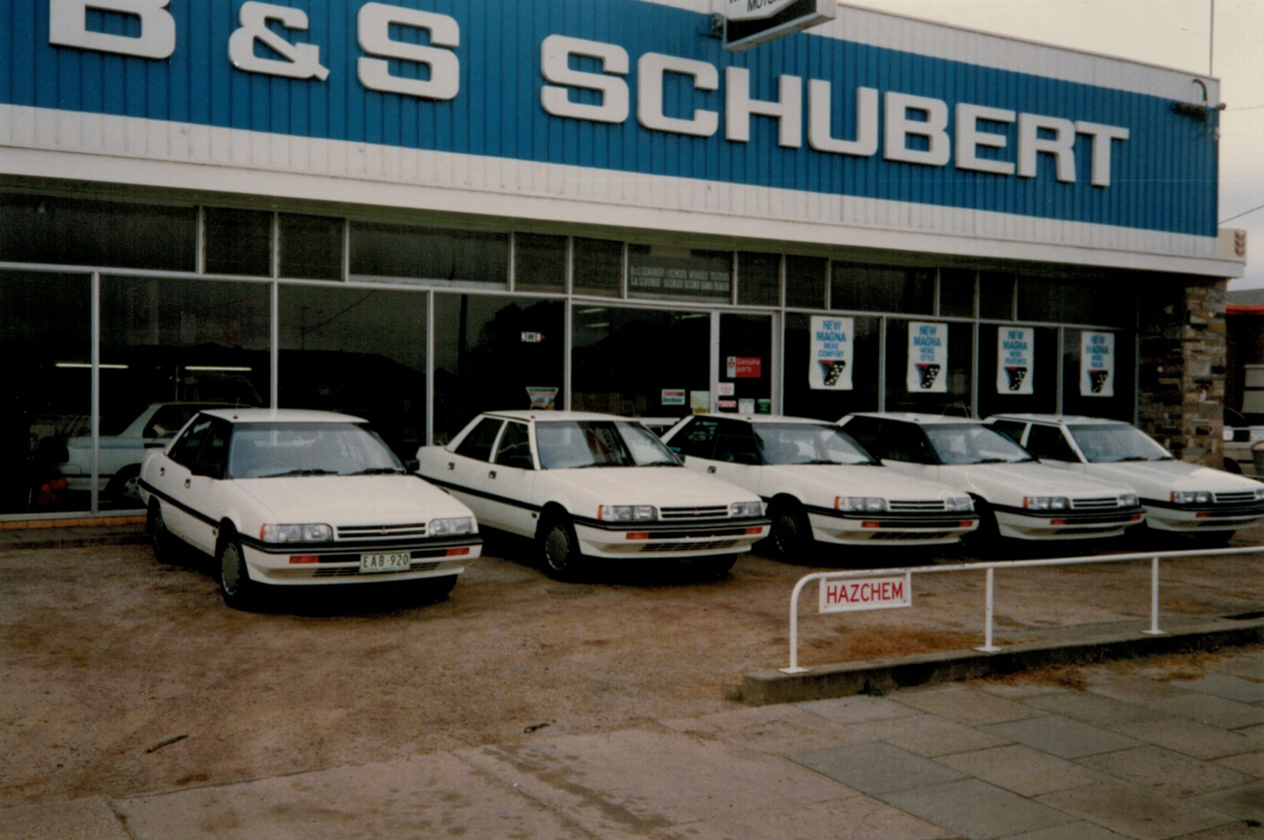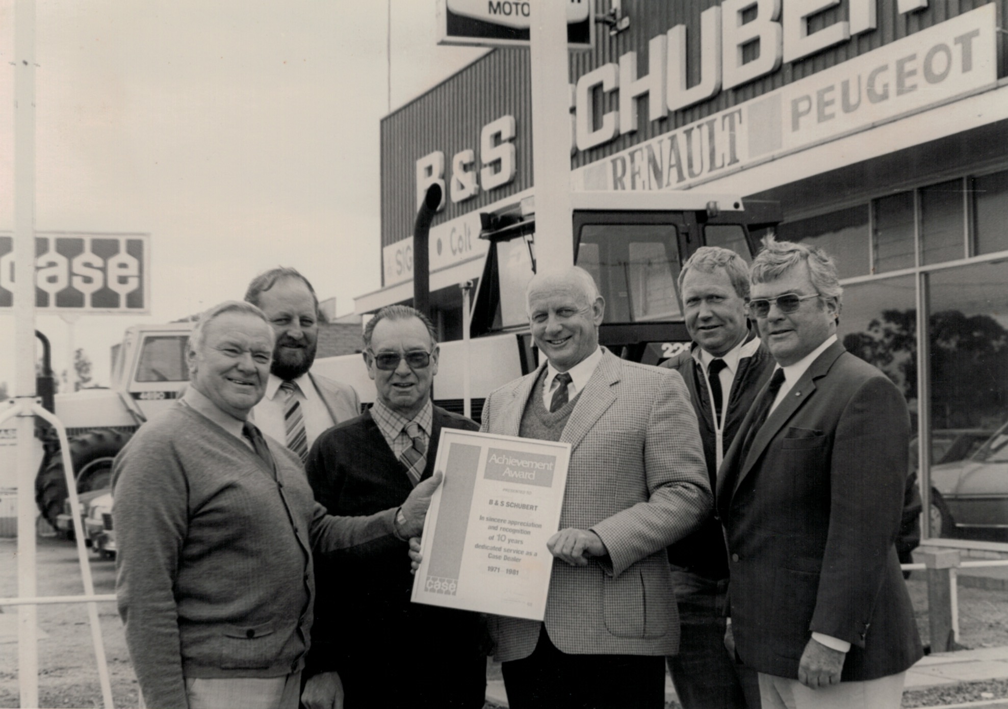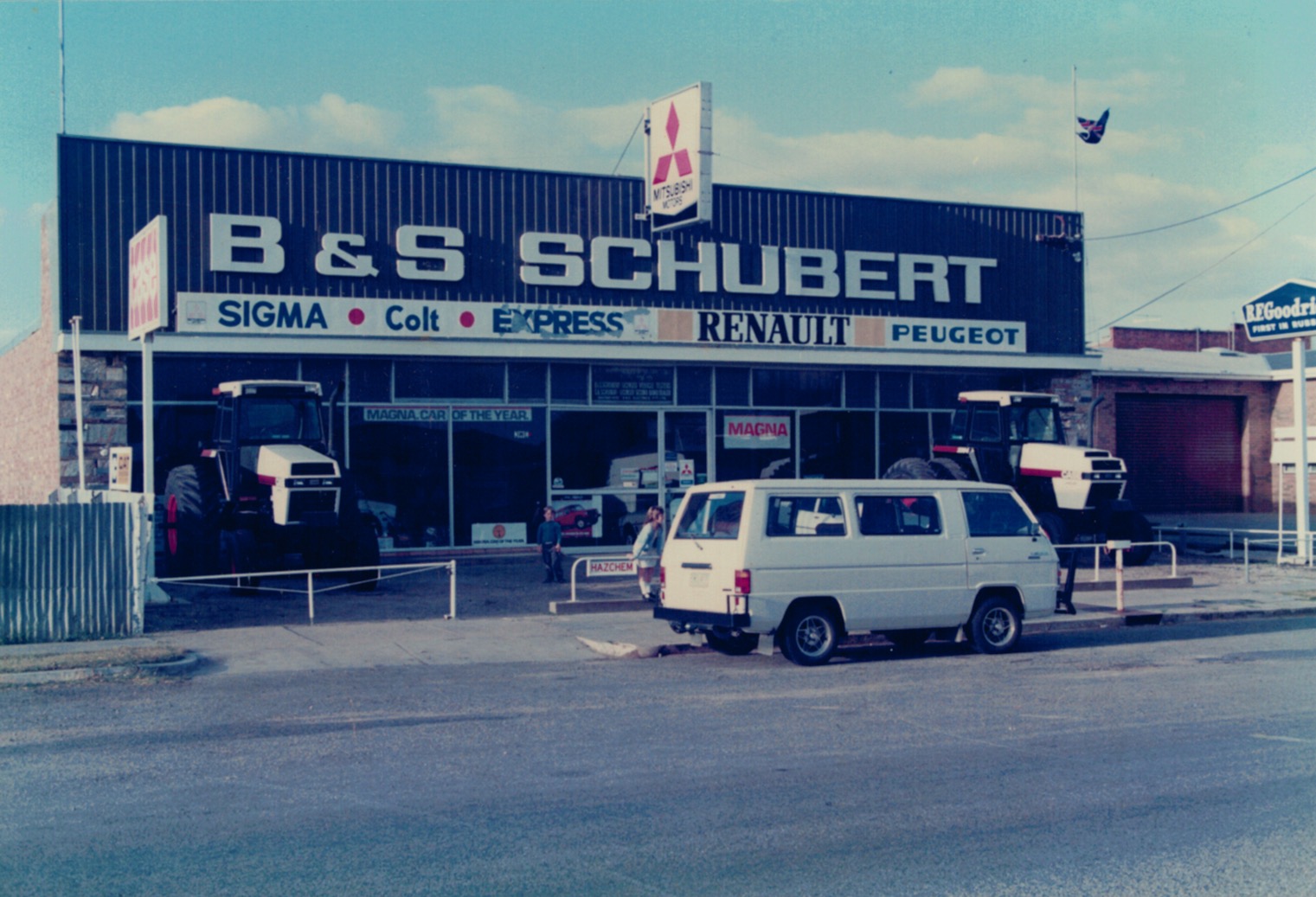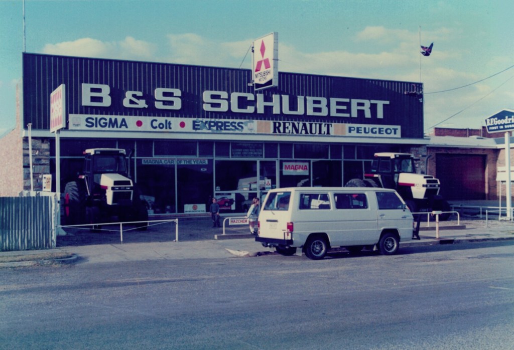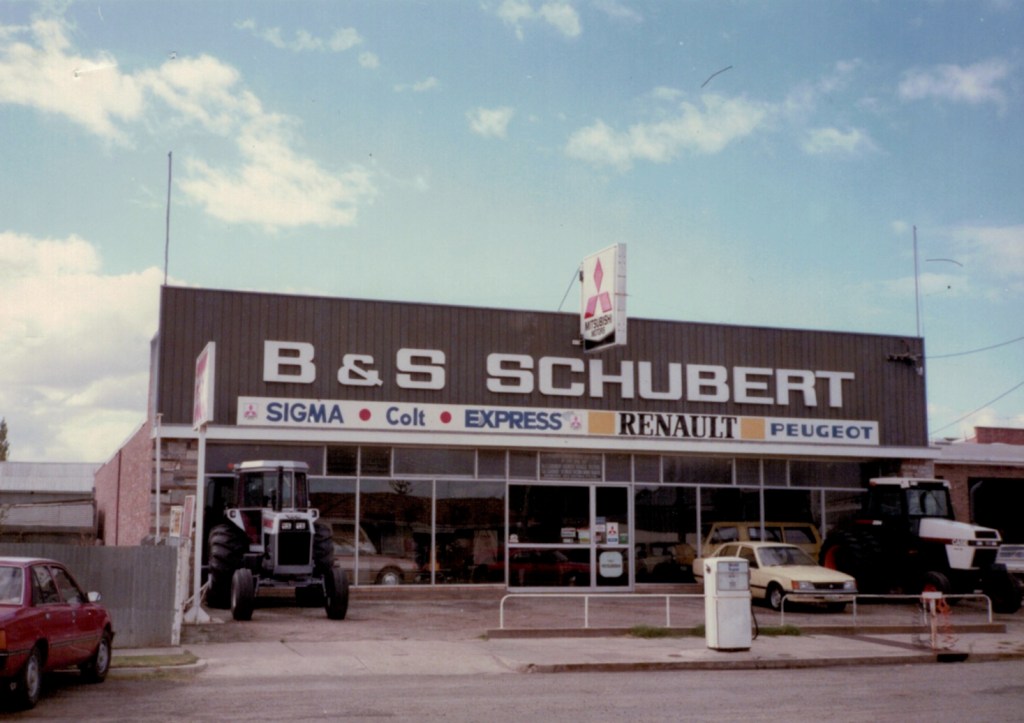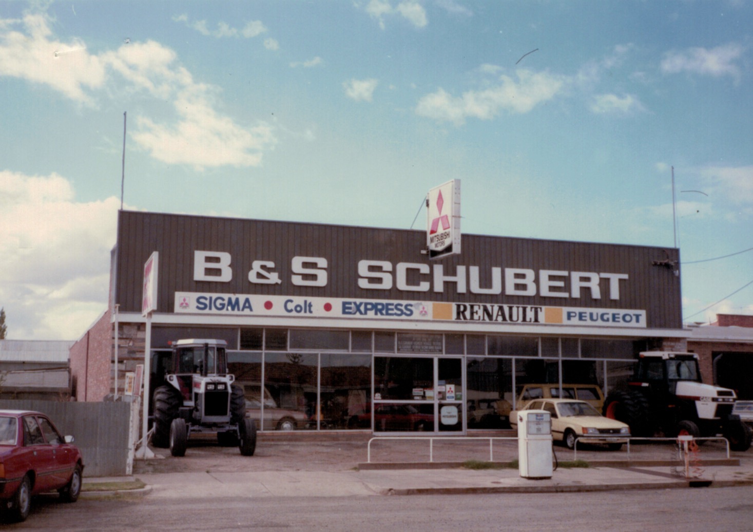 Bert Schubert in the spare parts in the new building.The frontage of the new building, before signage was completed, c. 1967..As above.The first White 4150 tractor delivered to Victoria. Purchased by J & A Thomson, Brim East, 29 May 1975.Andrew Livingston on a Case tractor in the back yard off Jamouneau Street, c. 1976 [Andrew Livingston].A photograph taken for advertising purposes, late 1970s or early 1980s [Warracknabeal Herald].As above.A photograph taken in 1977 when Bert and Sig Schubert were considering selling the business.Sig Schubert and Graeme Bell, salesman, 1979.Sig Schubert in the showroom, c. early 1980s.Sig Schubert with a Mitsubishi Starion car, Warrackanbeal Trade Fair, Wheatlands Museum, October 1983 [Horrie Schmidt].Presentation of an award for 10 years of outstanding service to the Case Tractor Company, August 1984. Standing L-R: Sig Schubert, Ian Newnham (Case Victorian Manager), Bert Schubert, Jeffrey Hinde (Case General Sales Manager), Michael Lethbridge (Case Victorian Agriculture Manager), and Neville Vise (Case Area Manager) [Warracknabeal Herald].Frontage taken mid-late 1980s.The flag flying at half mast after Sig’s death, February 1986. Sig always flew the flag every Australia Day, and the staff also flew it at half mast when Bert died in 1993 [Warracknabeal Herald].Photograph taken the evening before Sig’s funeral, February 1986. Catherine and Carl Schubert can be seen as well as the flag flying at half mast [JAS].B. and S. Schubert’s stand at the Warracknabeal Agricultural and Pastoral Society’s Show, 1980s.Bert Schubert outside the garage, taken December 1986 for a newspaper article marking the 50th anniversary of the business [Warracknabeal Herald].Frontage late 1980s [Warracknabeal Herald].Frontage 1980s, with Sigma vehicles.Entrance to the backyard from Jamounea Street, April 1991; Gardiner’s mortuary to the right.B & S Schubert, 1992 [Margie McKenzie Photography].Farewell afternoon tea on the last day of trading in the showroom, 28 January, 1994. Staff pictured [Warracknabeal Herald].Farewell afternoon tea on the last day of trading in the showroom, 28 January, 1994 [Warracknabeal Herald].