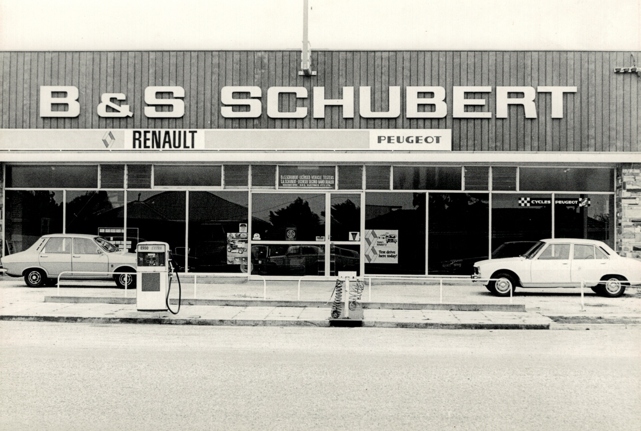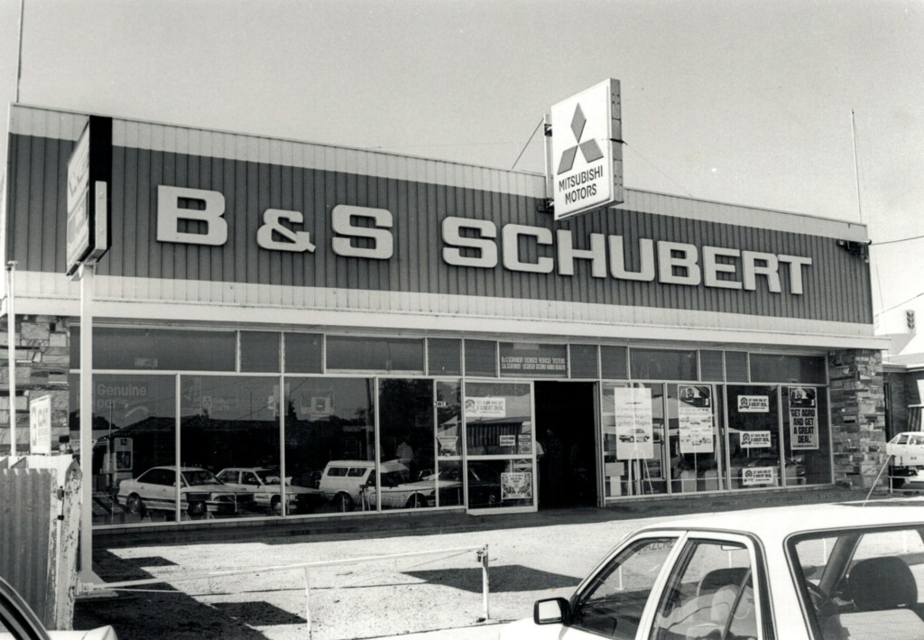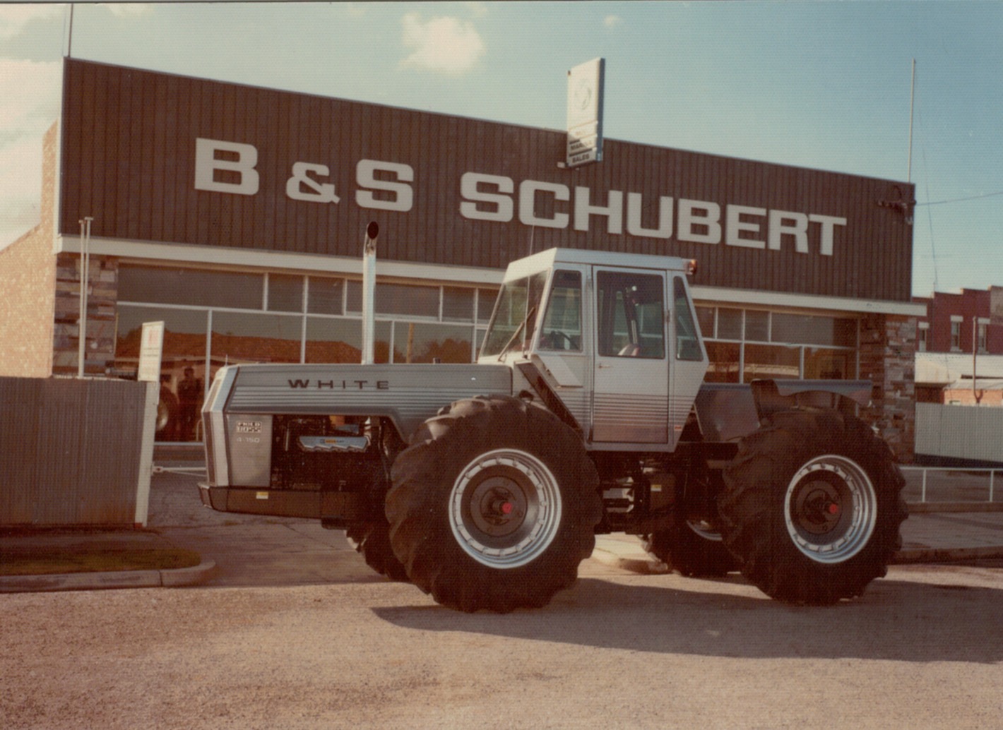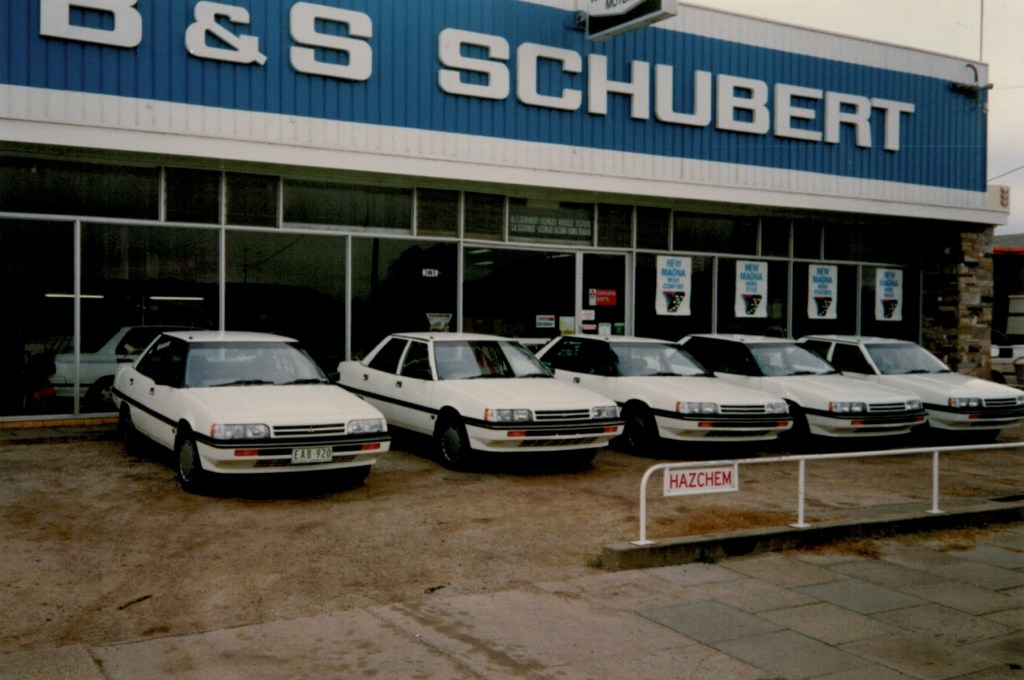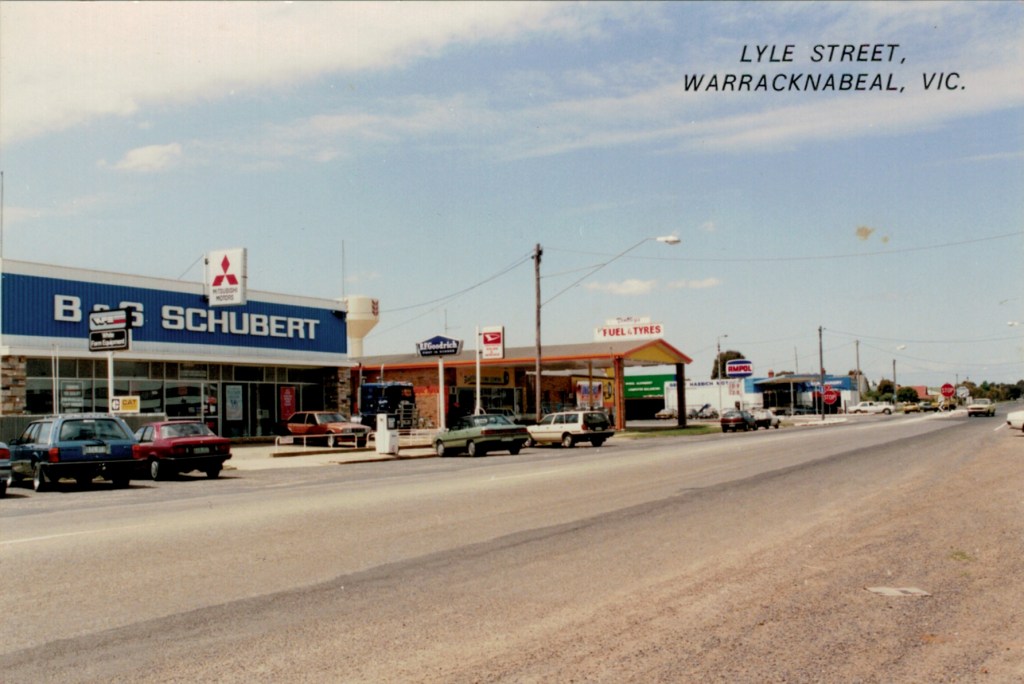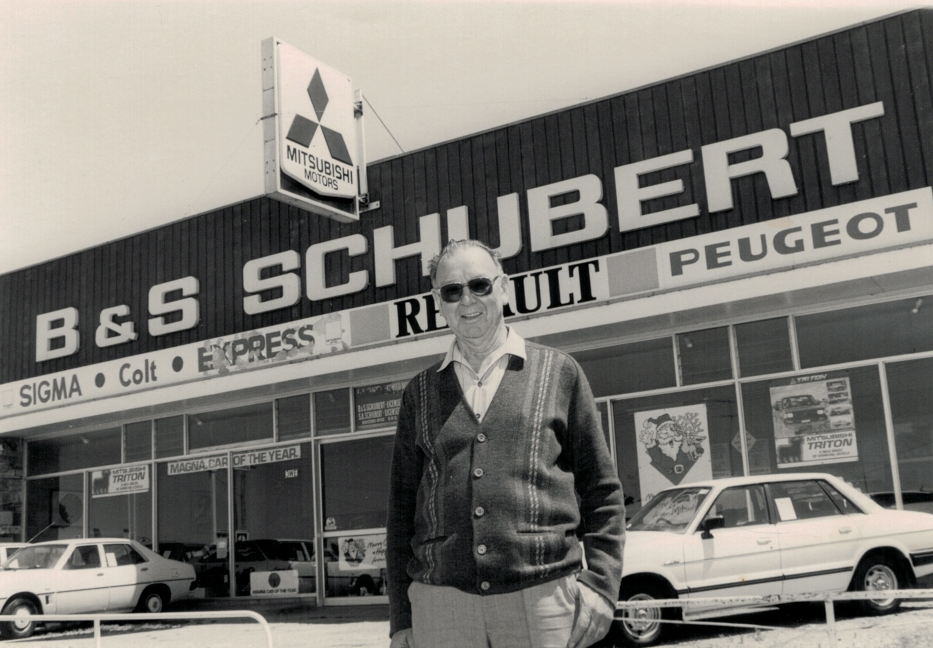 Bert Schubert in the spare parts in the new building.The frontage of the new building, before signage was completed, c. 1967..As above.The first White 4150 tractor delivered to Victoria. Purchased by J & A Thomson, Brim East, 29 May 1975.Andrew Livingston on a Case tractor in the back yard off Jamouneau Street, c. 1976 [Andrew Livingston].A photograph taken for advertising purposes, late 1970s or early 1980s [Warracknabeal Herald].As above.A photograph taken in 1977 when Bert and Sig Schubert were considering selling the business.Sig Schubert and Graeme Bell, salesman, 1979.Sig Schubert in the showroom, c. early 1980s.Sig Schubert with a Mitsubishi Starion car, Warrackanbeal Trade Fair, Wheatlands Museum, October 1983 [Horrie Schmidt].Presentation of an award for 10 years of outstanding service to the Case Tractor Company, August 1984. Standing L-R: Sig Schubert, Ian Newnham (Case Victorian Manager), Bert Schubert, Jeffrey Hinde (Case General Sales Manager), Michael Lethbridge (Case Victorian Agriculture Manager), and Neville Vise (Case Area Manager) [Warracknabeal Herald].Frontage taken mid-late 1980s.The flag flying at half mast after Sig’s death, February 1986. Sig always flew the flag every Australia Day, and the staff also flew it at half mast when Bert died in 1993 [Warracknabeal Herald].Photograph taken the evening before Sig’s funeral, February 1986. Catherine and Carl Schubert can be seen as well as the flag flying at half mast [JAS].B. and S. Schubert’s stand at the Warracknabeal Agricultural and Pastoral Society’s Show, 1980s.Bert Schubert outside the garage, taken December 1986 for a newspaper article marking the 50th anniversary of the business [Warracknabeal Herald].Frontage late 1980s [Warracknabeal Herald].Frontage 1980s, with Sigma vehicles.Entrance to the backyard from Jamounea Street, April 1991; Gardiner’s mortuary to the right.B & S Schubert, 1992 [Margie McKenzie Photography].Farewell afternoon tea on the last day of trading in the showroom, 28 January, 1994. Staff pictured [Warracknabeal Herald].Farewell afternoon tea on the last day of trading in the showroom, 28 January, 1994 [Warracknabeal Herald].