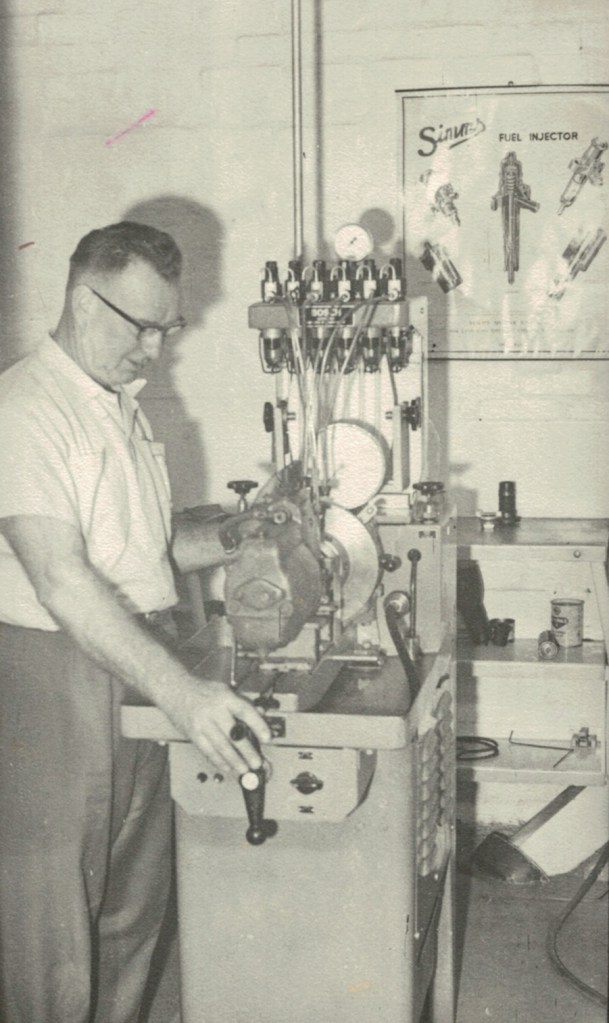 Bert Schubert operating the tractor fuel injector machine in a special dust-proof room in the new building.