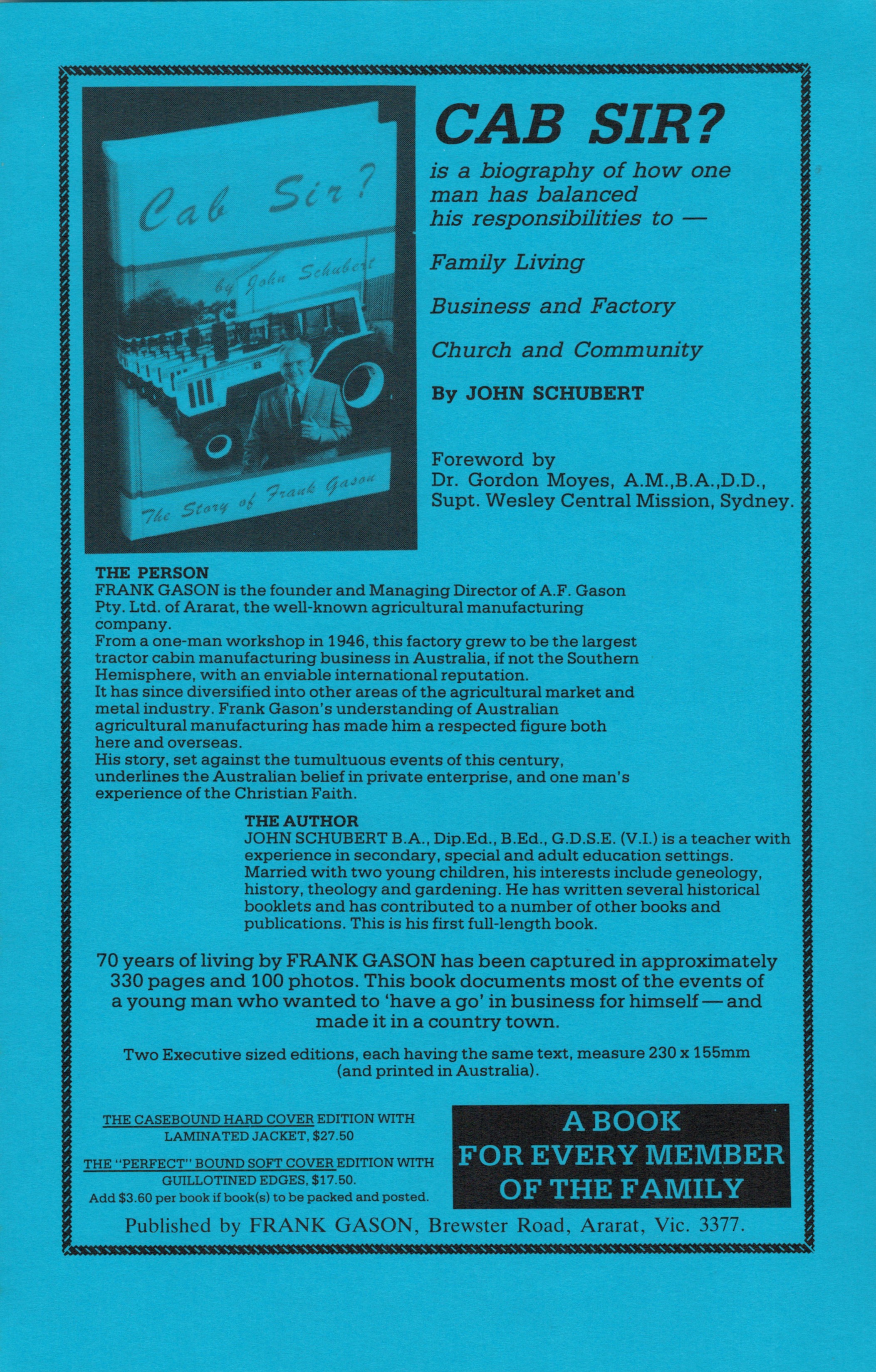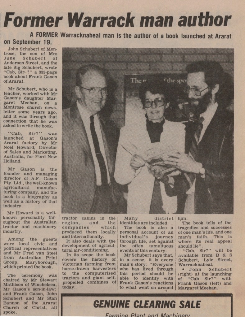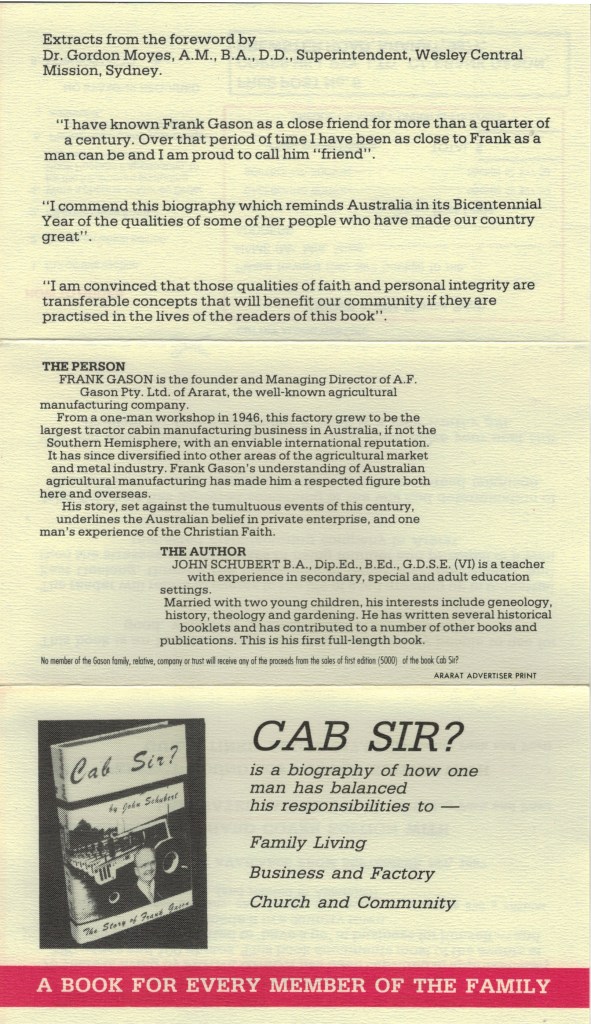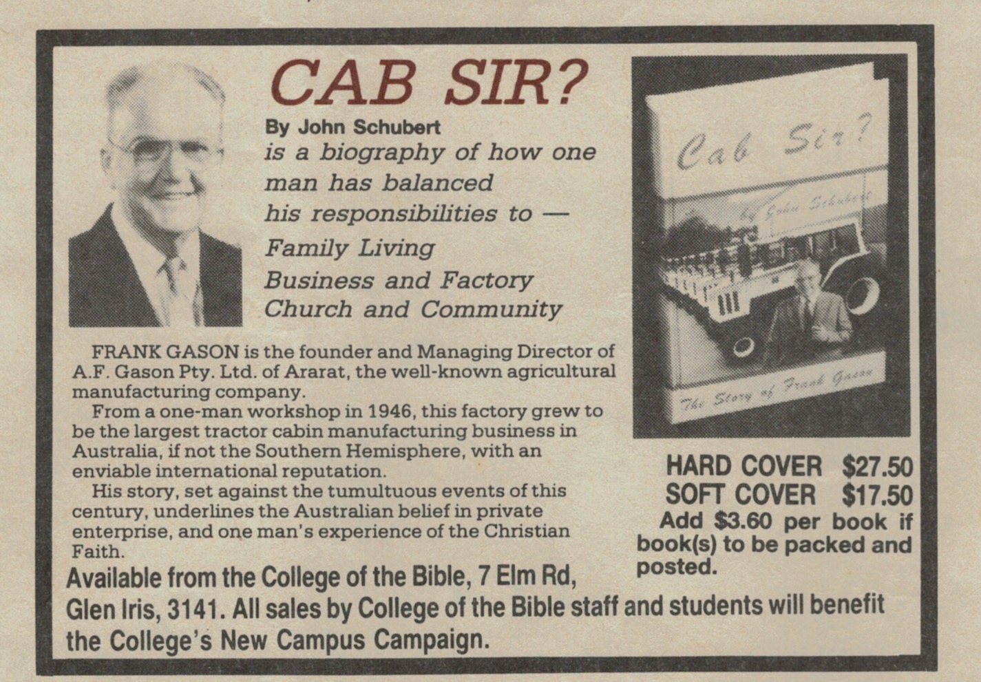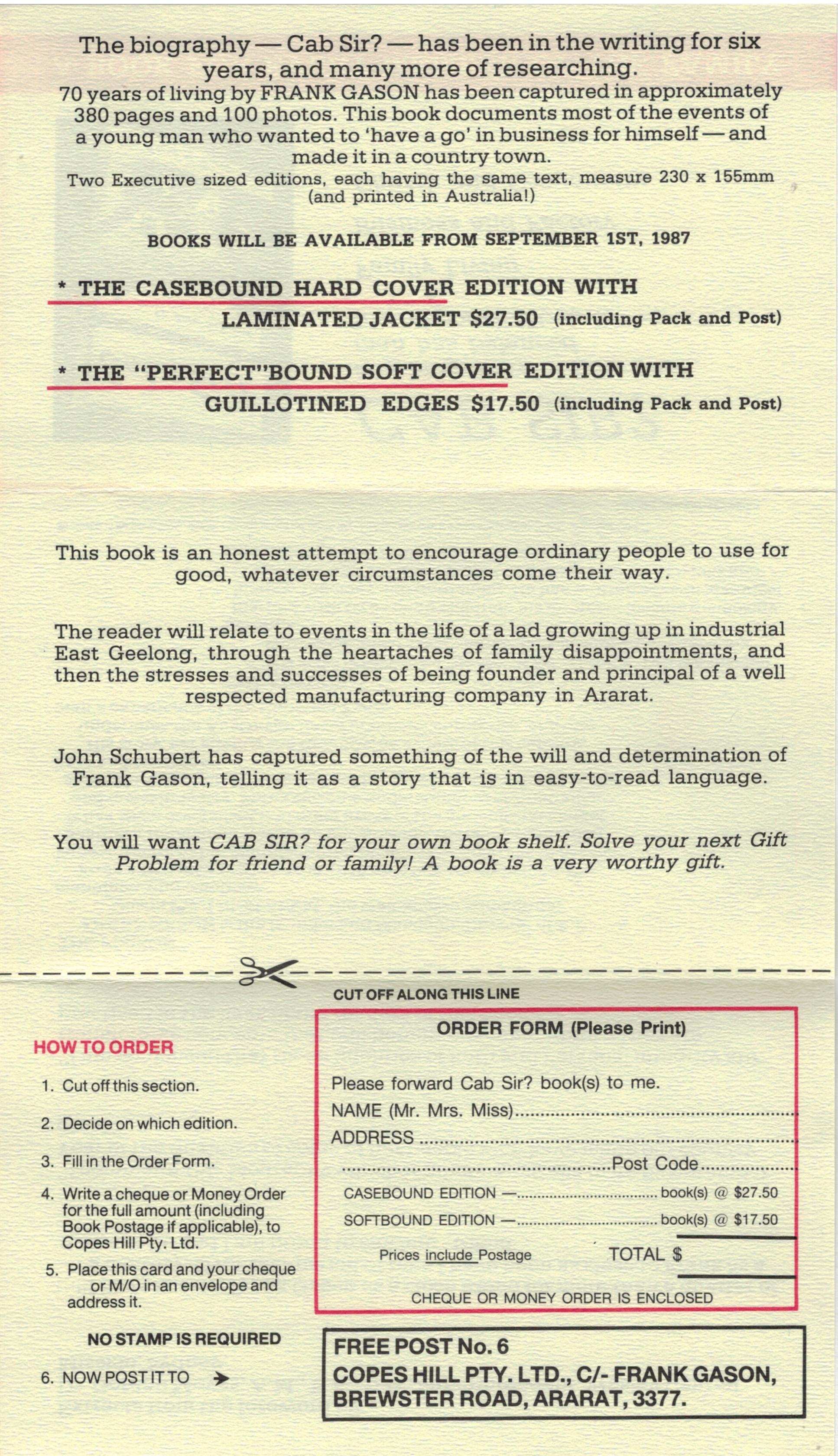 Cab, Sir? “Ararat Advertiser”, Tuesday 21 July 1987, page 3. “Ararat Advertiser” (Vic.), Saturday 25 July 1987, page 2. Advertising flyer for “Cab, Sir?”. Folded order form for “Cab, Sir?”. “Ararat Advertiser”, Tuesday 22 September 1987, page 1. “Ararat Advertiser”, Tuesday 22 September 1987, page 3 “Hamilton Spectator” (Vic.), Tuesday, 6 October 1987, page 2. “Update” (Church of Christ, Montrose, Vic.), Sunday 27 September 1987, page 4. “Warracknabeal Herald” (Vic.), Friday 9 October 1987, page 7 [JAS]. “Courier” (Ballarat, Vic.), Monday 12 October, 1987, page 13. “Australian Christian” (Melbourne, Vic.,) October 17 1987, page (481)9. “Australian Christian” (Melbourne, Vic.), October 17 1987, page (482)10. “Australian Christian” (Melbourne, Vic.), October 31 1987, page (506)10.