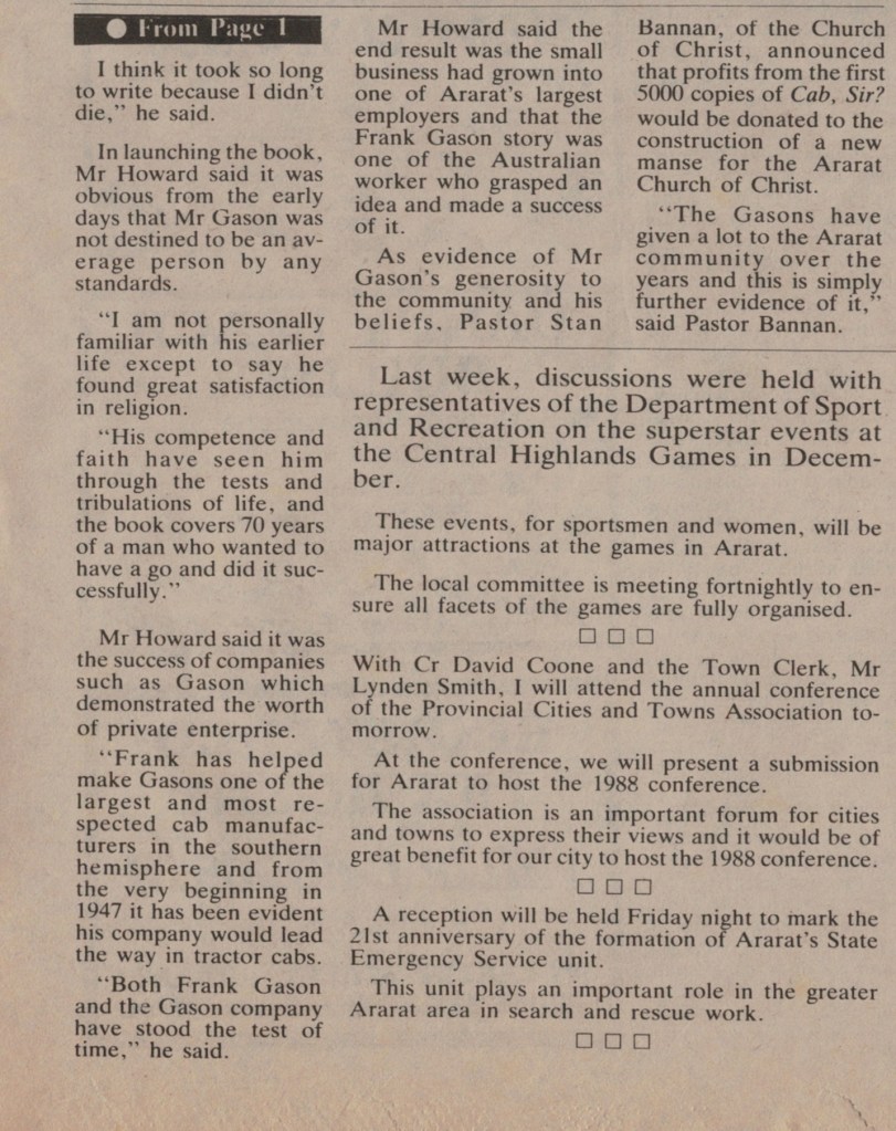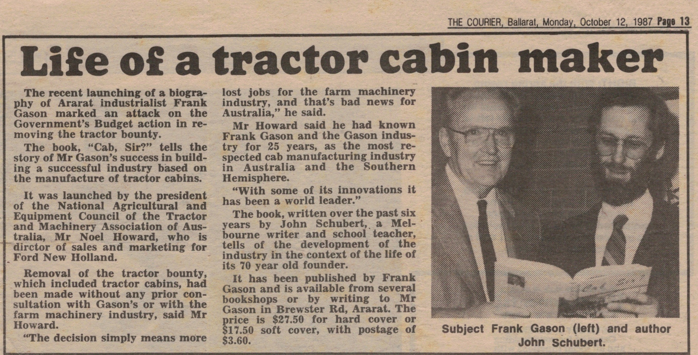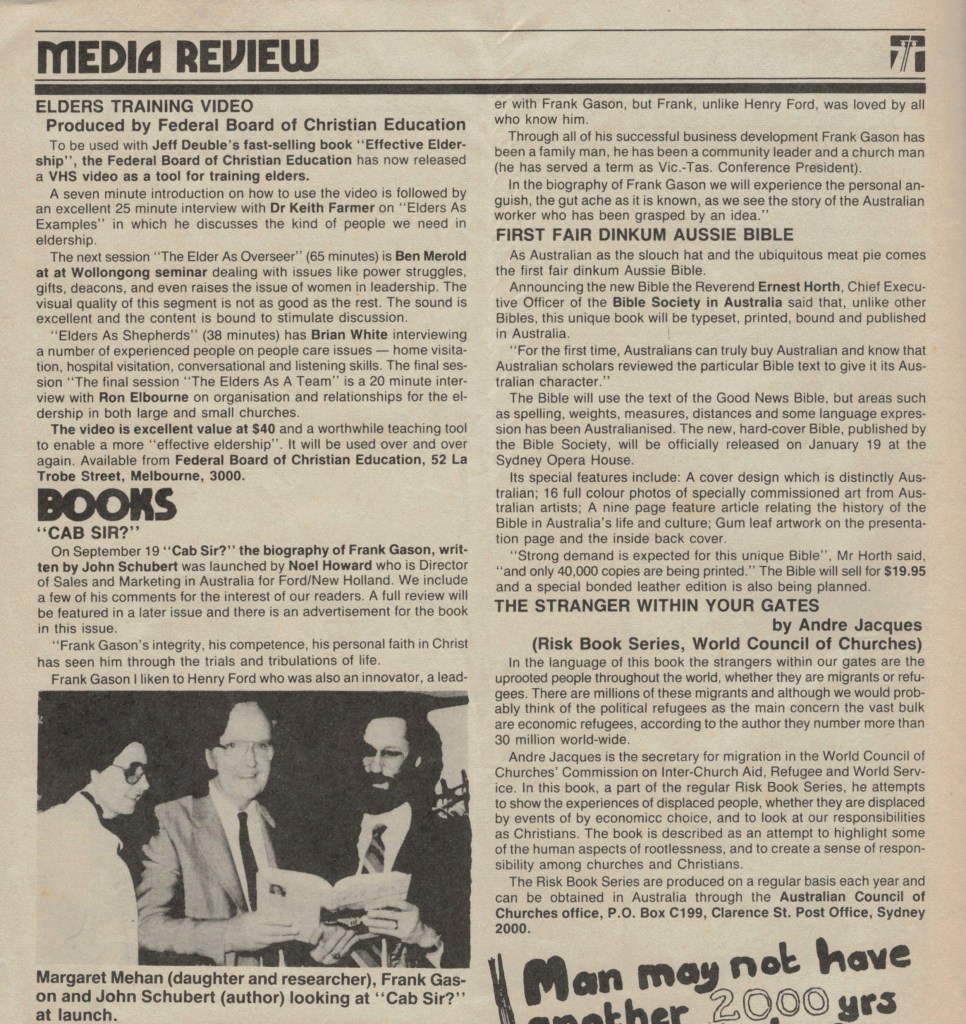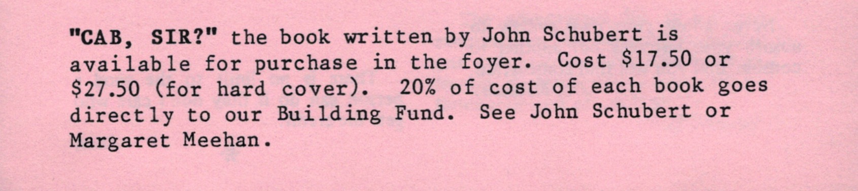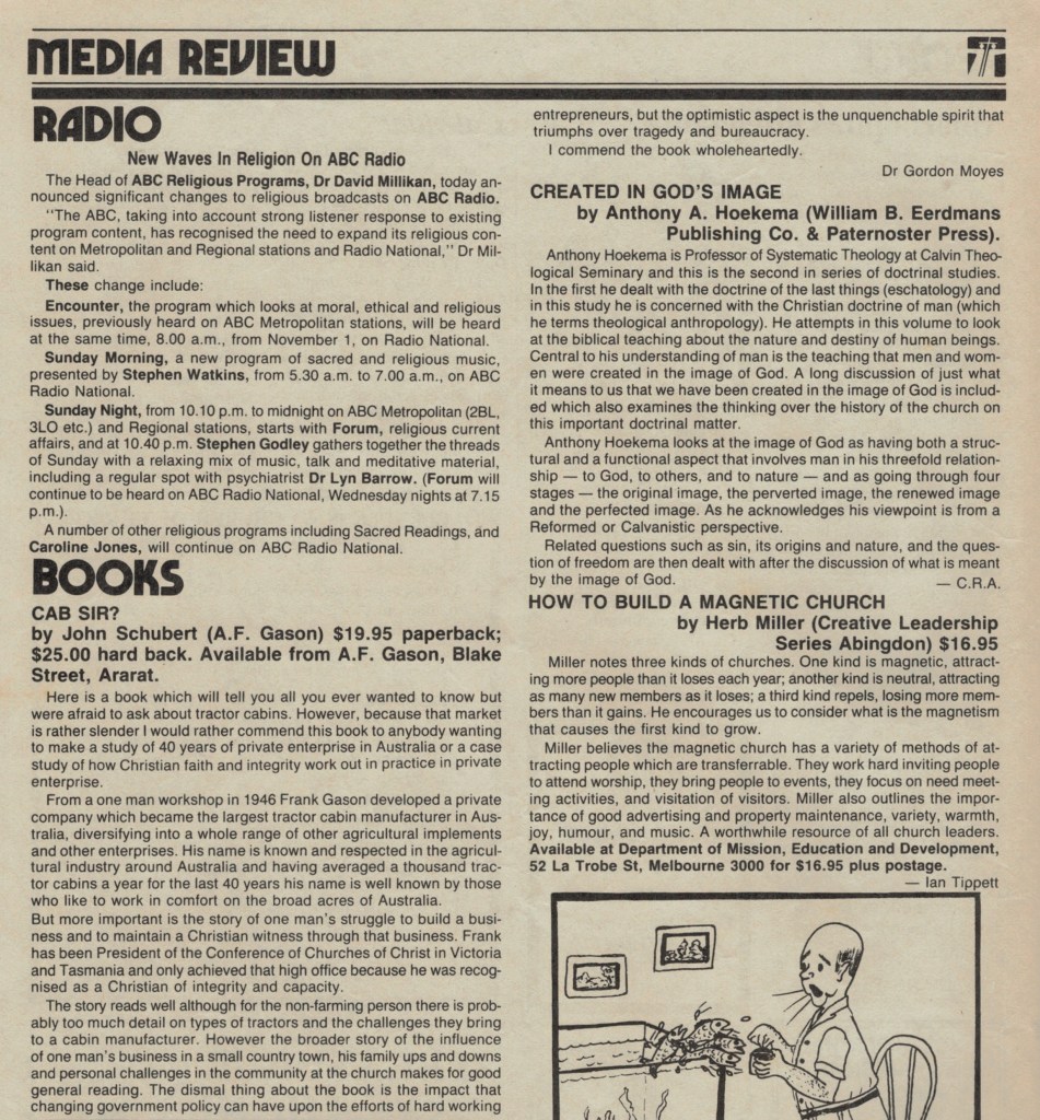 Cab, Sir? “Ararat Advertiser”, Tuesday 21 July 1987, page 3. “Ararat Advertiser” (Vic.), Saturday 25 July 1987, page 2. Advertising flyer for “Cab, Sir?”. Folded order form for “Cab, Sir?”. “Ararat Advertiser”, Tuesday 22 September 1987, page 1. “Ararat Advertiser”, Tuesday 22 September 1987, page 3 “Hamilton Spectator” (Vic.), Tuesday, 6 October 1987, page 2. “Update” (Church of Christ, Montrose, Vic.), Sunday 27 September 1987, page 4. “Warracknabeal Herald” (Vic.), Friday 9 October 1987, page 7 [JAS]. “Courier” (Ballarat, Vic.), Monday 12 October, 1987, page 13. “Australian Christian” (Melbourne, Vic.,) October 17 1987, page (481)9. “Australian Christian” (Melbourne, Vic.), October 17 1987, page (482)10. “Australian Christian” (Melbourne, Vic.), October 31 1987, page (506)10.