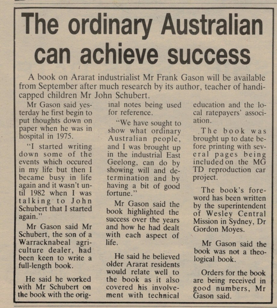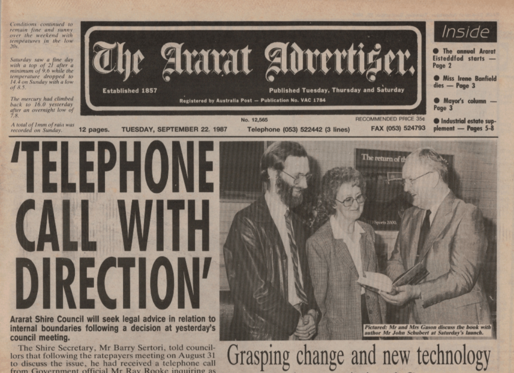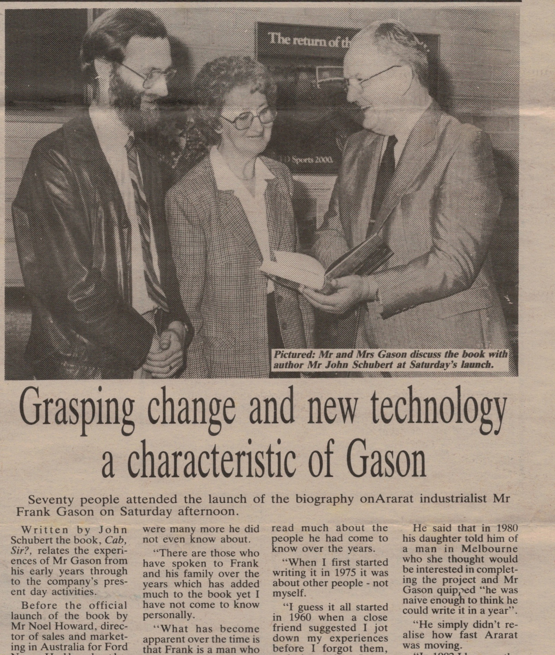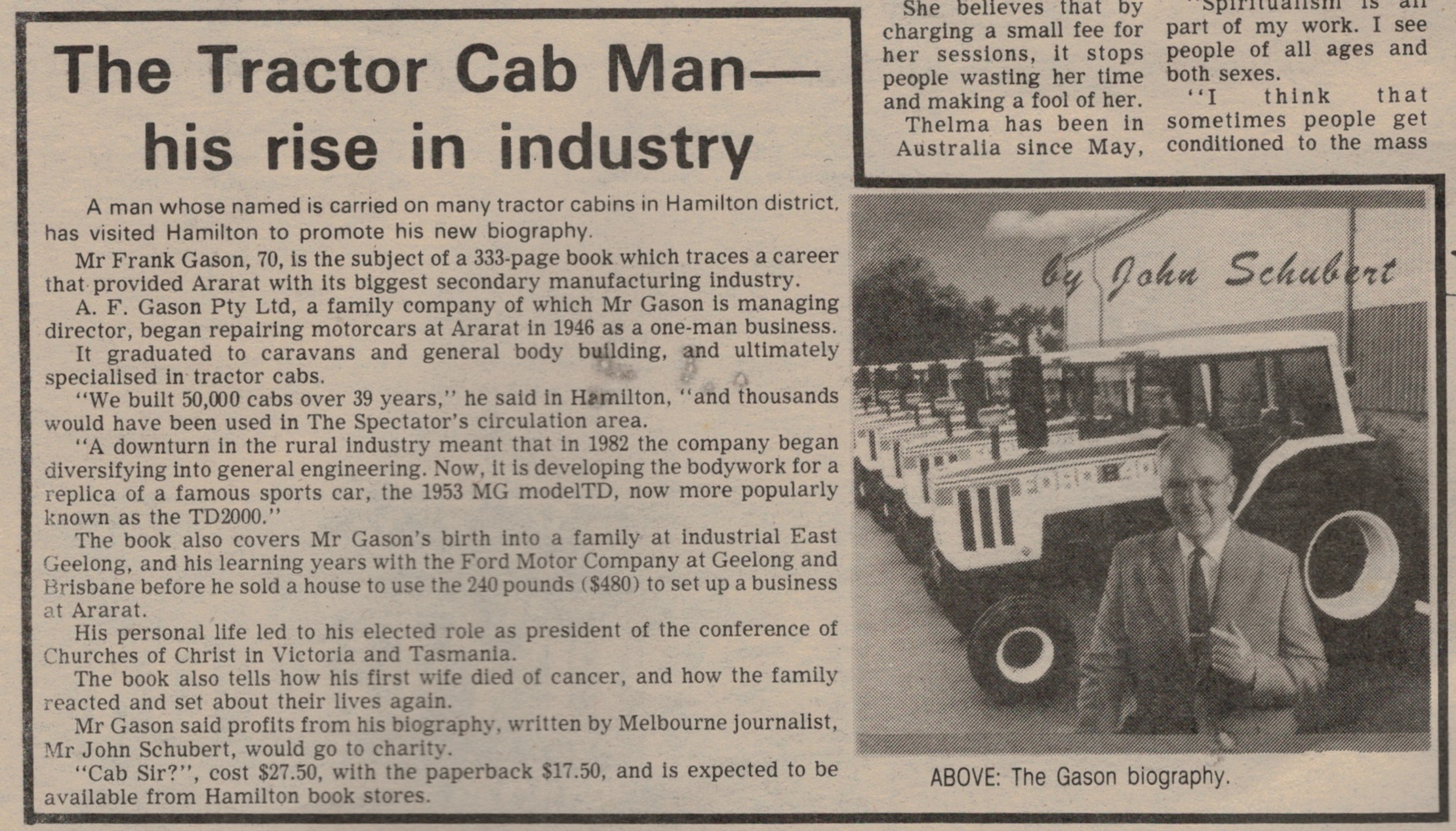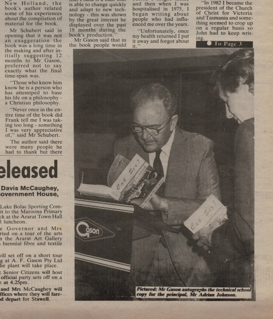 Cab, Sir? “Ararat Advertiser”, Tuesday 21 July 1987, page 3. “Ararat Advertiser” (Vic.), Saturday 25 July 1987, page 2. Advertising flyer for “Cab, Sir?”. Folded order form for “Cab, Sir?”. “Ararat Advertiser”, Tuesday 22 September 1987, page 1. “Ararat Advertiser”, Tuesday 22 September 1987, page 3 “Hamilton Spectator” (Vic.), Tuesday, 6 October 1987, page 2. “Update” (Church of Christ, Montrose, Vic.), Sunday 27 September 1987, page 4. “Warracknabeal Herald” (Vic.), Friday 9 October 1987, page 7 [JAS]. “Courier” (Ballarat, Vic.), Monday 12 October, 1987, page 13. “Australian Christian” (Melbourne, Vic.,) October 17 1987, page (481)9. “Australian Christian” (Melbourne, Vic.), October 17 1987, page (482)10. “Australian Christian” (Melbourne, Vic.), October 31 1987, page (506)10.
