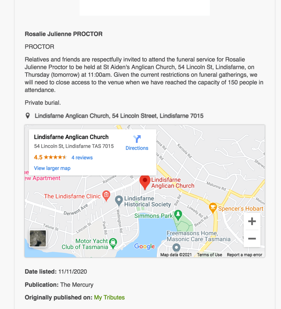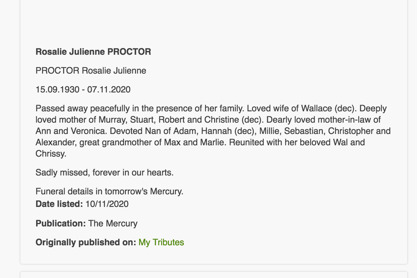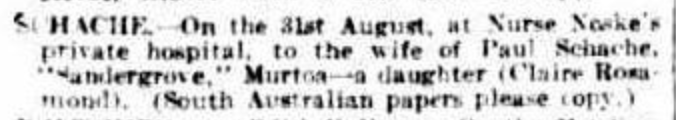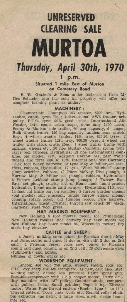 Grave of Des and Beverley Schache (Mills), Murtoa Cemetery, Vic. [Carol’s Headstone Photographs].Headstone for Des and Beverley Schache (Mills), Murtoa Cemetery, Vic. [Carol’s Headstone Photographs].“Mercury” (Hobart, Tas.), Saturday 19 May 2018.“Mercury” (Hobart, Tas.), Tuesday 10 November 2020.“Mercury” (Hobart, Tas.), Wednesday 11 November 2020.