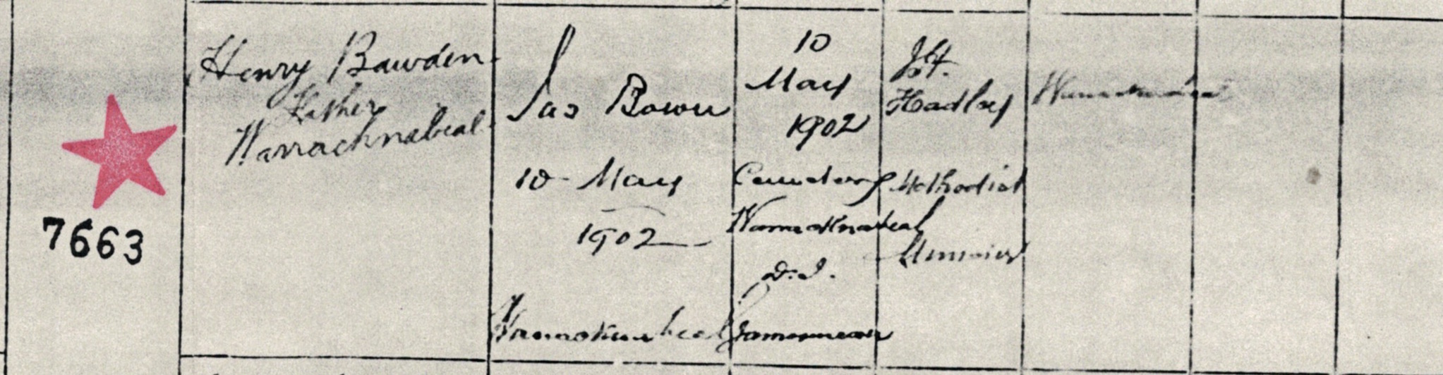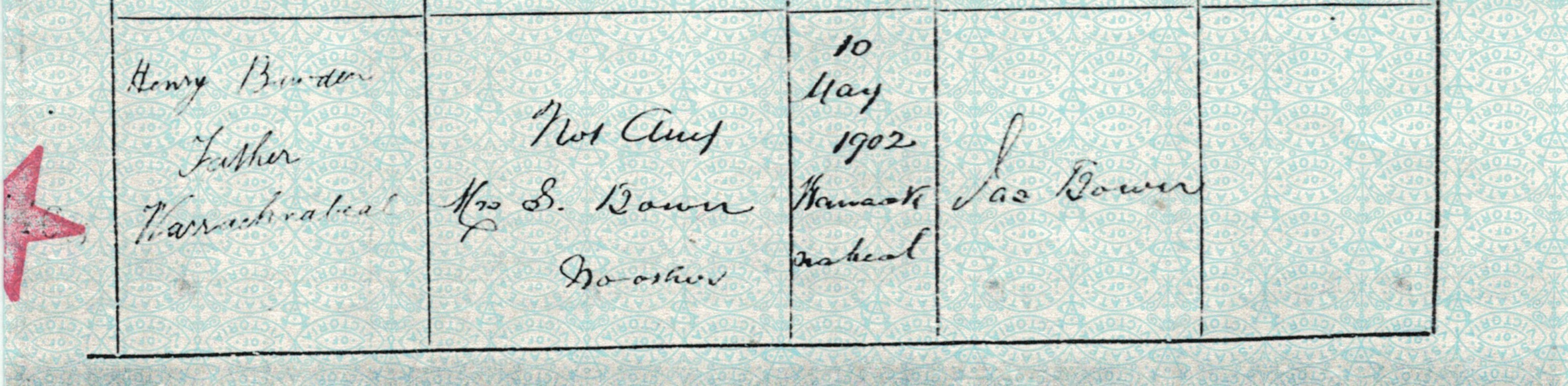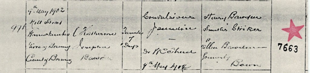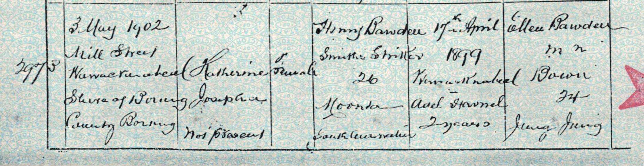 Documents and Memorabilia (1.1.1.2 BAWDEN) Birth certificate of Katherine Bawden: Warracknabeal, Vic., 1902 [BDMVic.: registered by Jas Bown; 7th column, informant; 8th column, witnesses; 9th column, registration]. Death certificate of Katherine Bawden: Warracknabea,l Vic., 1902 [BDMVic.: registered by Jas Bown; 6th column, informant; 7th column, registration; 8th column, burial/minister; 9th column, birth].