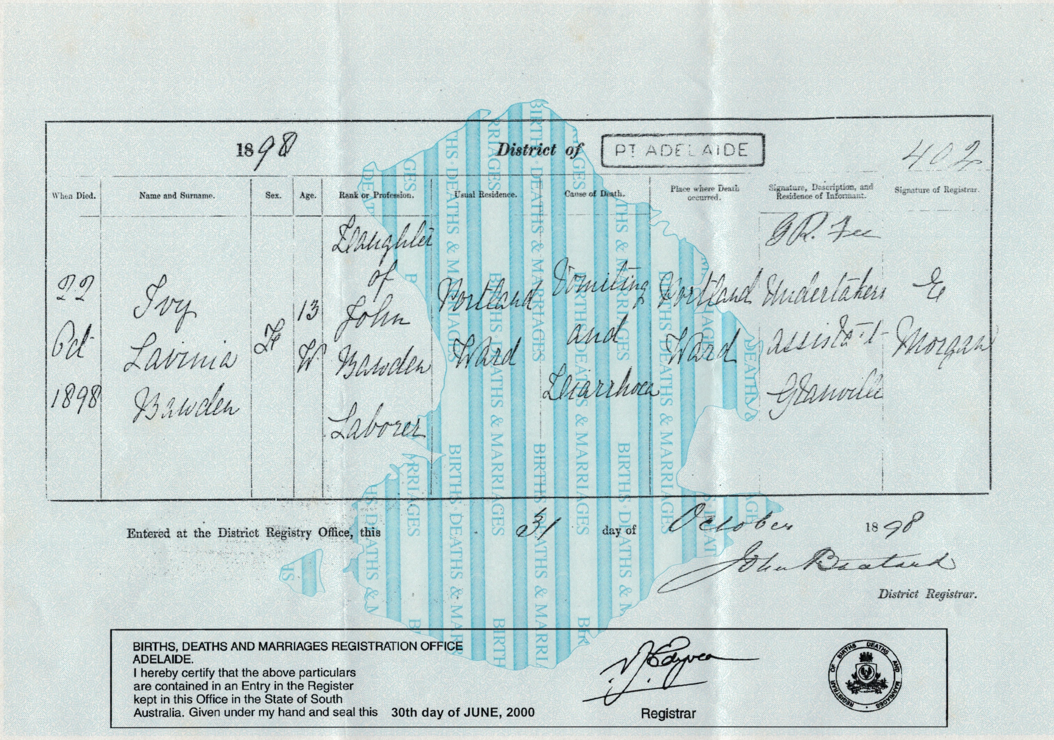 Documents and Memorabilia (1.1.12 BAWDEN) Death registration of Ivy Bawden, Port Adelaide, SA, 1898 [BDMSA].