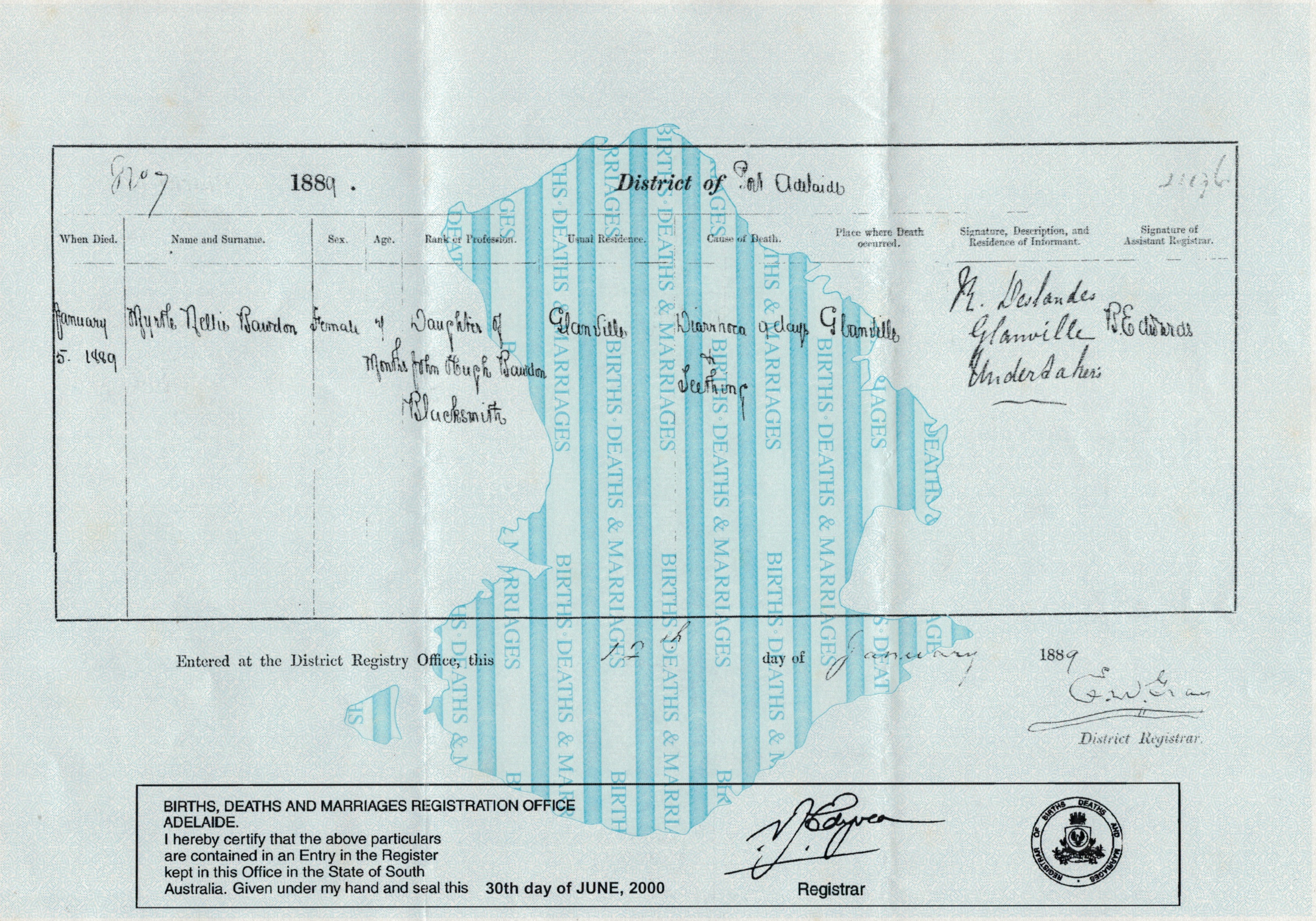 Documents and Memorabilia (1.1.7 BAWDEN) Death registration of Myrtle Bawden, Port Adelaide, SA, 1889 [BDMSA].