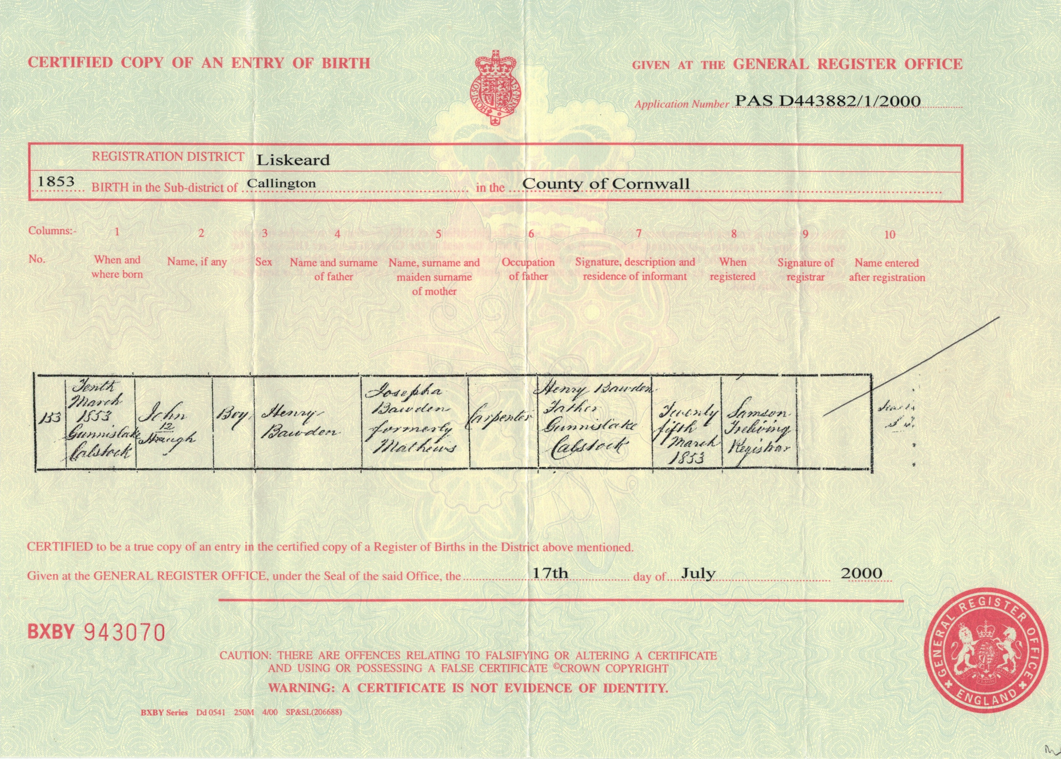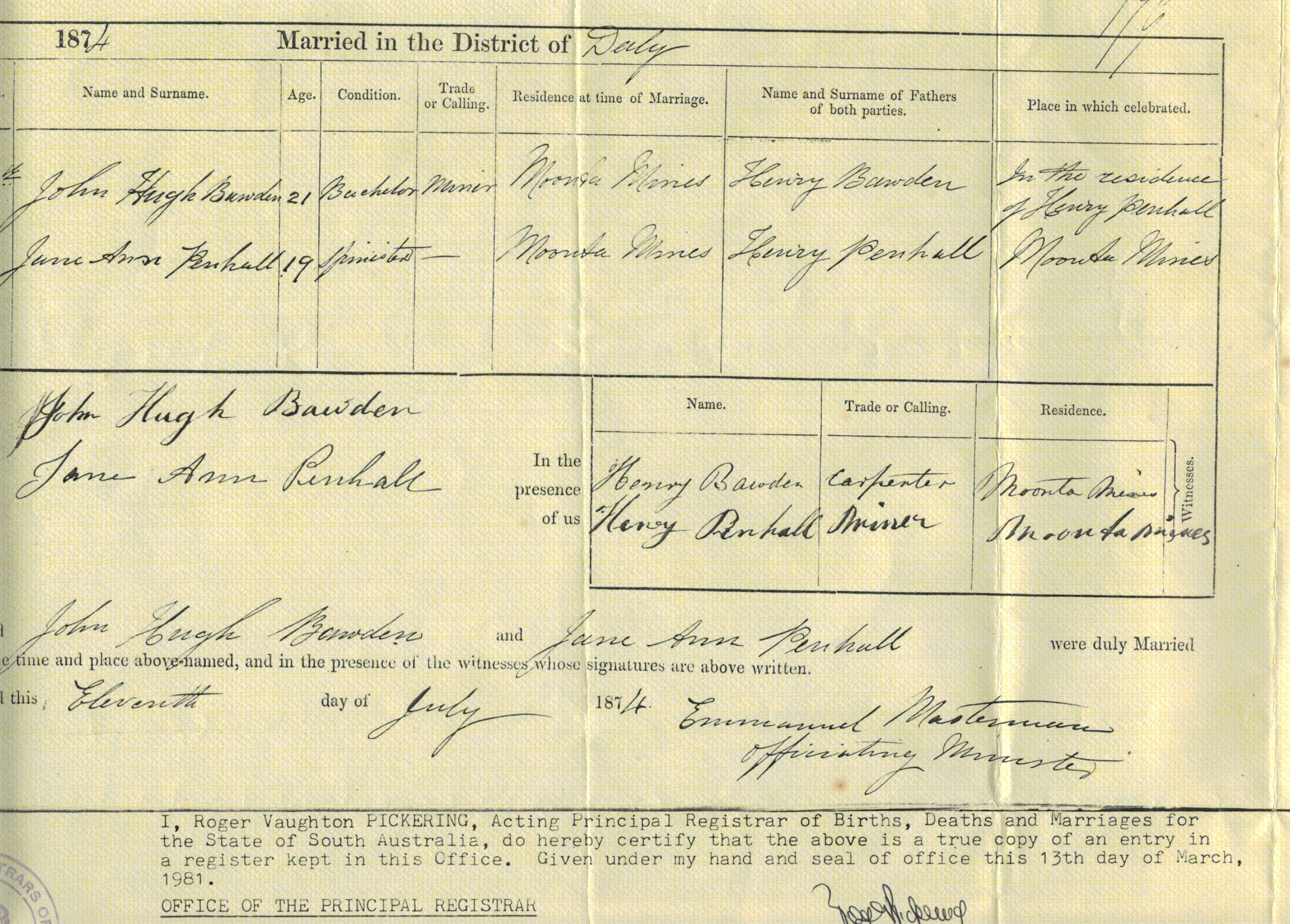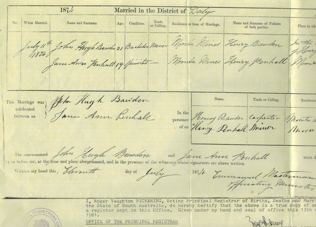 Birth registration of Jack Bawden, Calstock, Cornwall (England), 1853 [General Register Office England].Marriage registration of Jack and Annie Bawden (Penhall), Moonta Mines, SA, 1874 [BDMSA] 1.