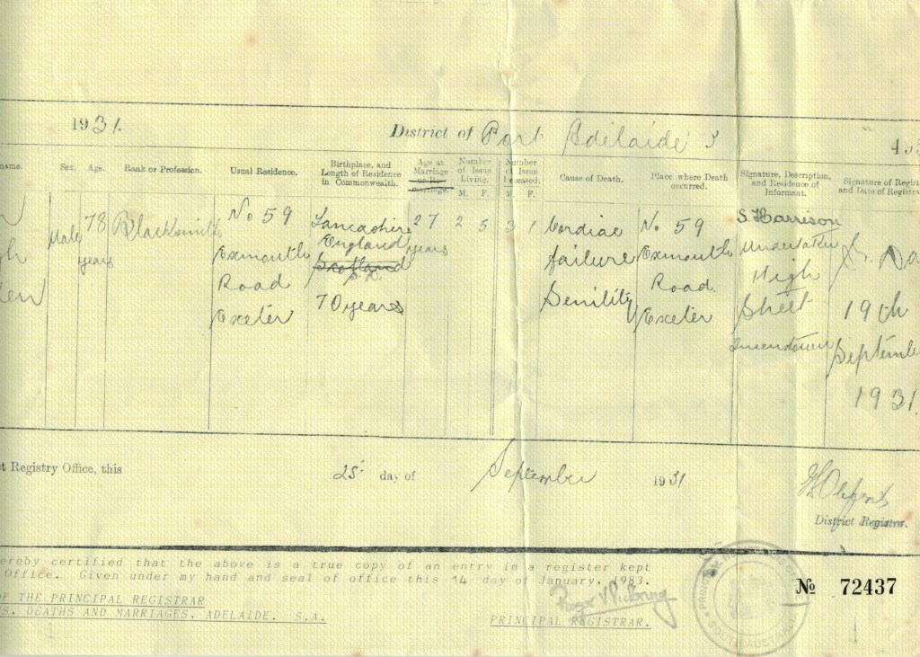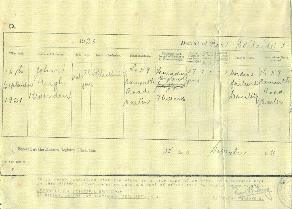 Death registration of Jack Bawden, Port Adelaide, SA, 1931 [BDMSA].