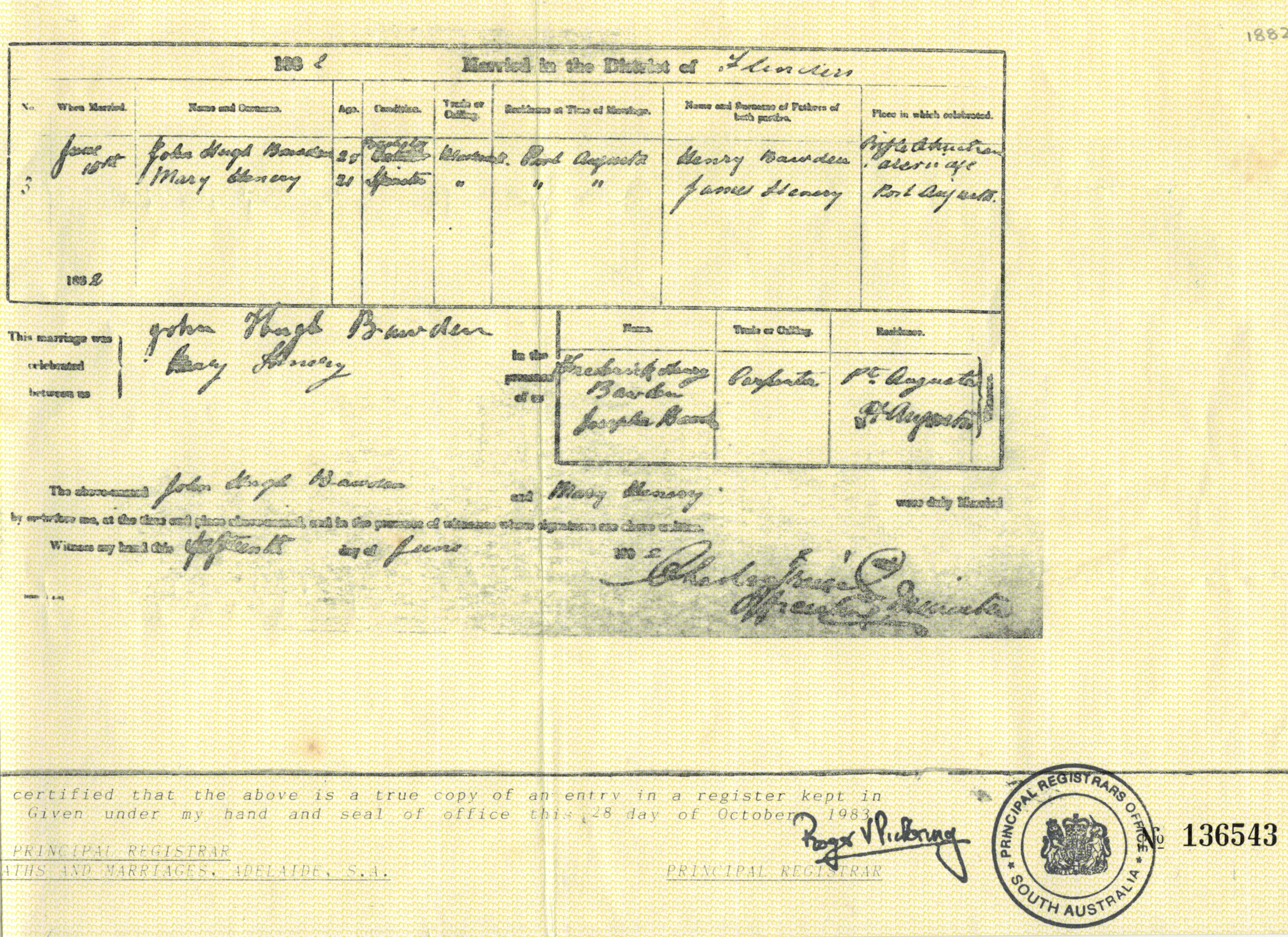 Marriage registration of Jack and Mary Bawden (Henery), Port Augusta, SA, 1882 [BDMSA].