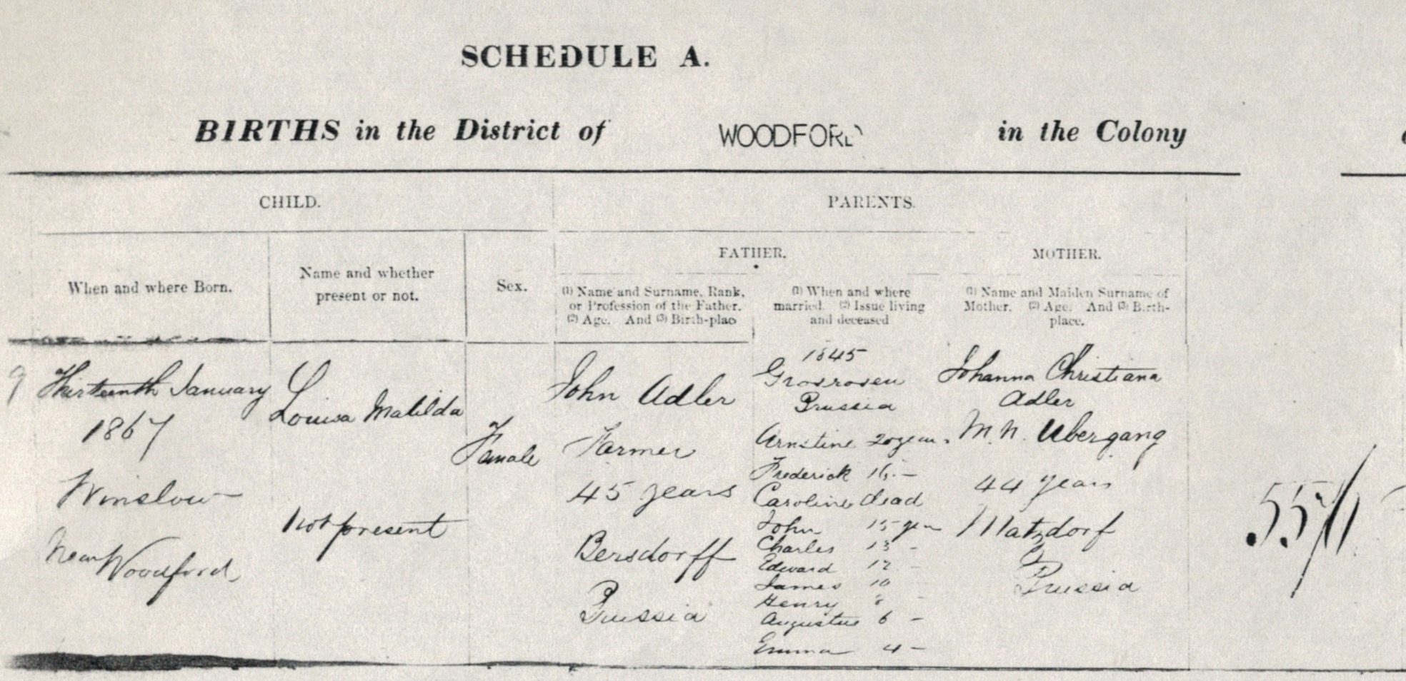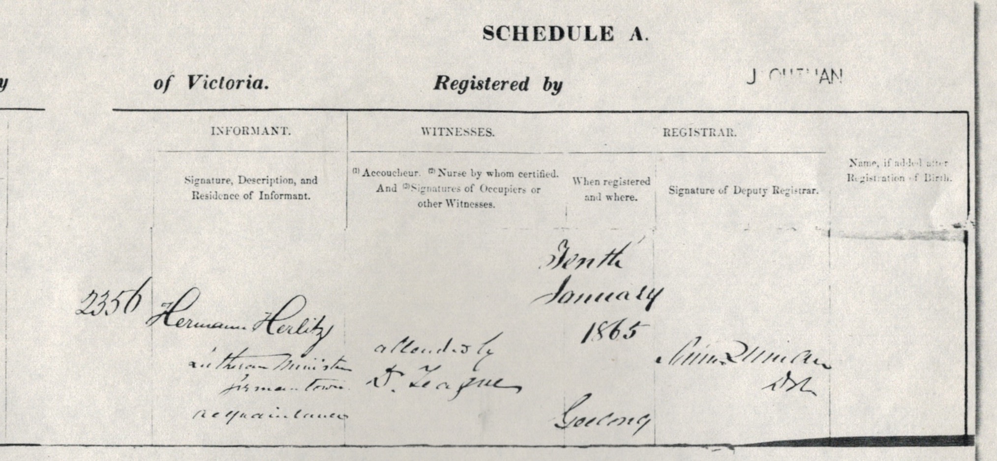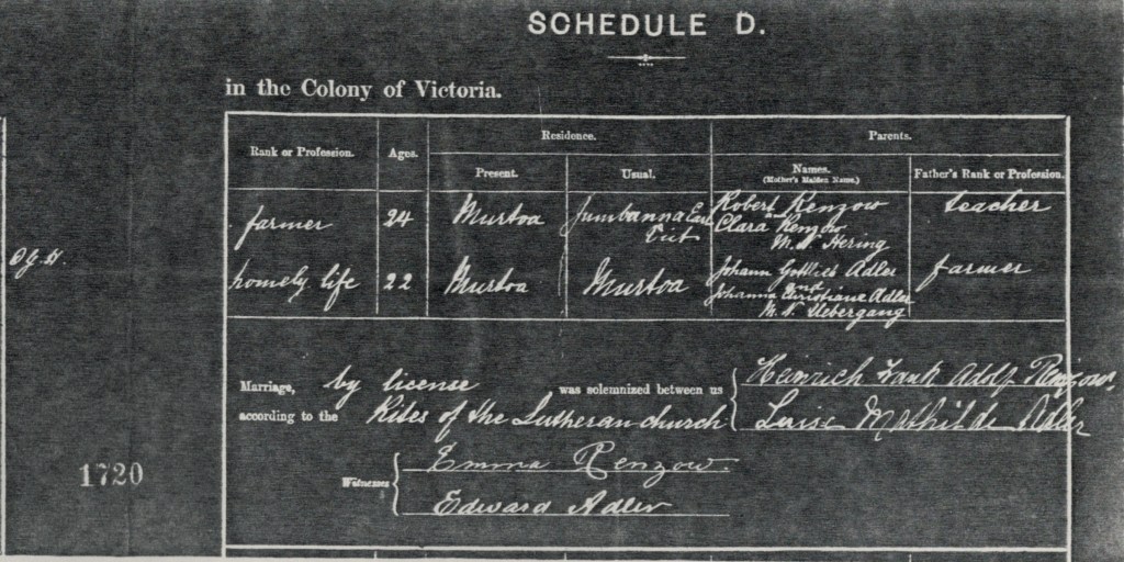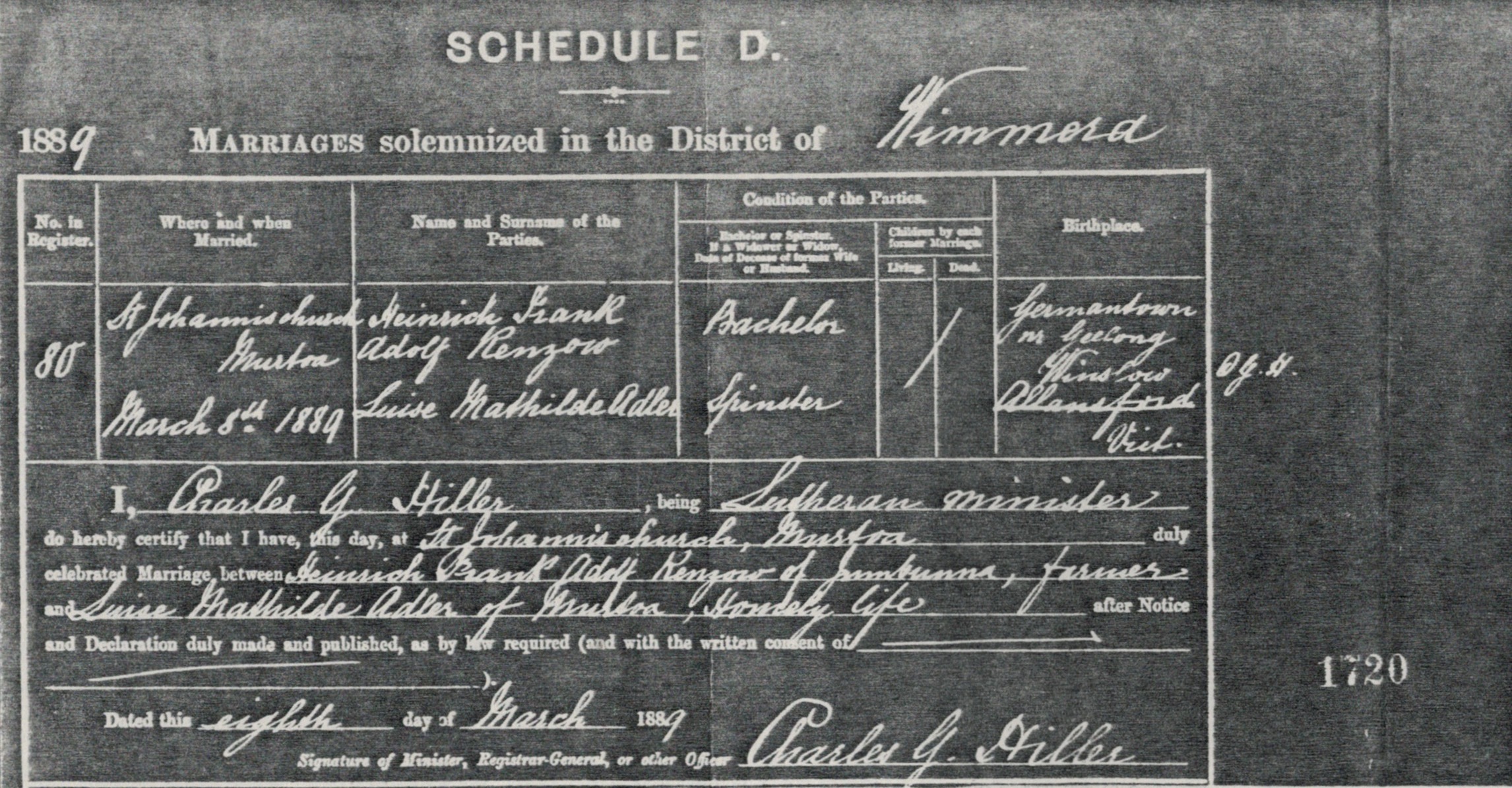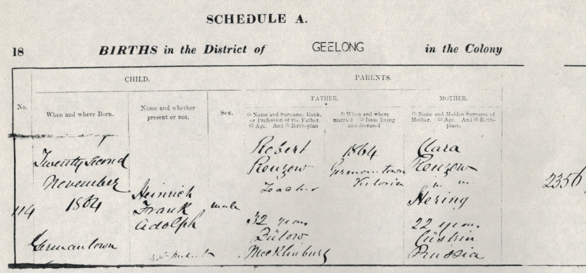 Documents and Memorabilia (1.11 ADLER) Birth registration of Frank Renzow [BDMVic/ Births in the District of Geelong, Victoria, 1864]. Birth registration of Tilly Renzow (Adler) [BDMVic: Births in the District of Woodford, Victoria, 1867]. Marriage registration of Frank and Tilly Renzow (Adler) [BDMVic/ Marriages in the District of Wimmera, Victoria, 1889].