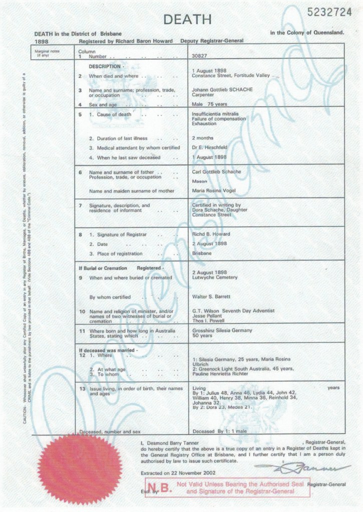 Documents and Memorabilia (1.2 SCHACHE) Morrison, W. Frederic, “The Aldine History of South Australia”, Sydney and Adelaide, Aldine Publishing Co., 1890, page 590 (Greenock). Death registration of Gottlieb Schache [BDMQ, 1898/David Ikin].
