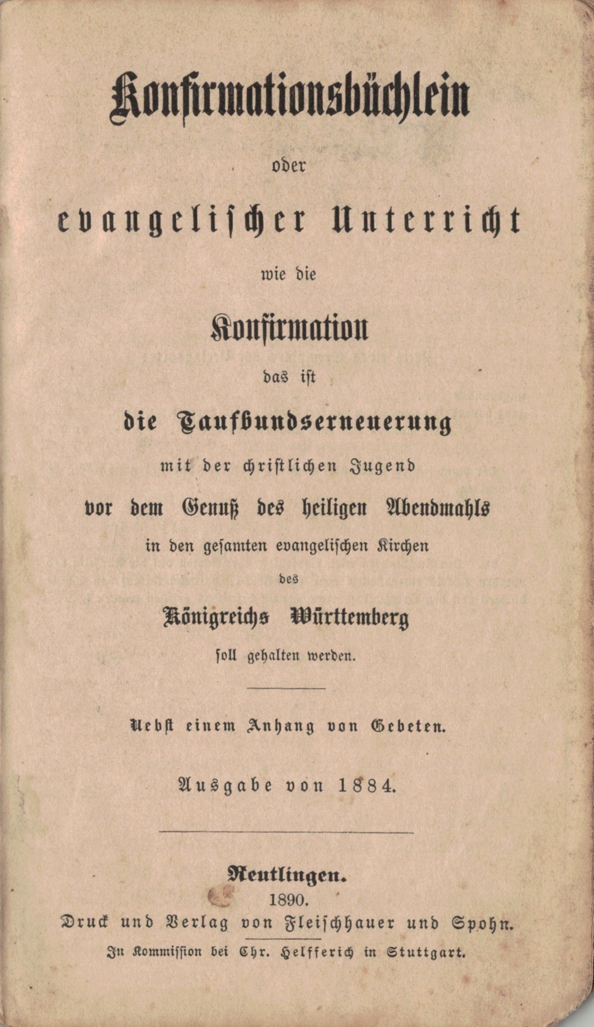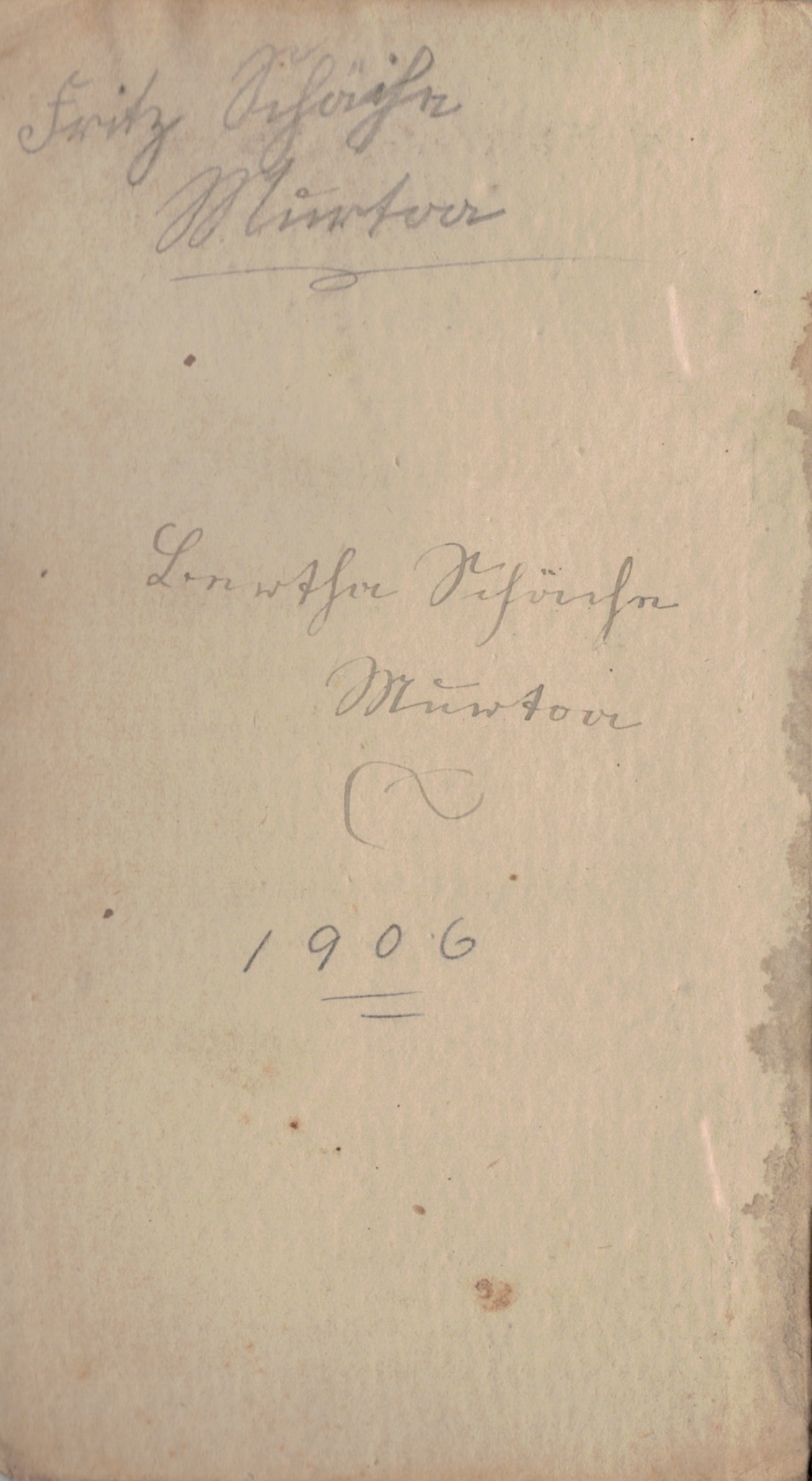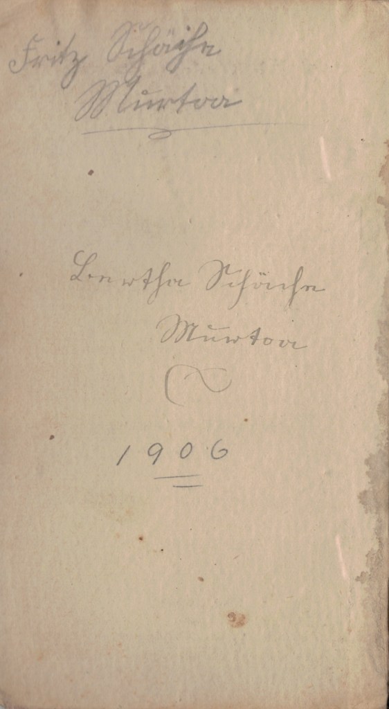 Documents and Memorabilia (1.3.1.3 SCHACHE) Title page of confirmation book used by Fred Schache and his sister Bertha [Tess Hausler (Schache)]. Inscriptions inside the front cover of the book above.